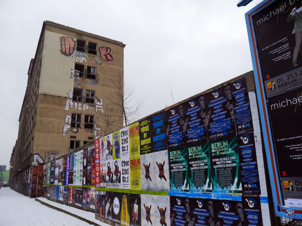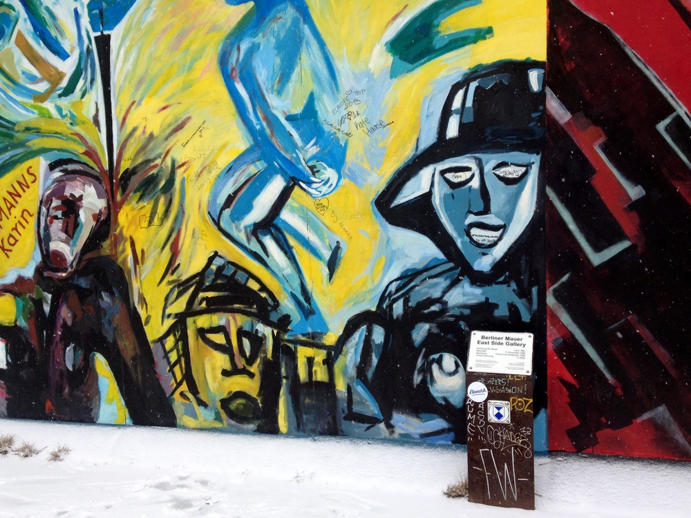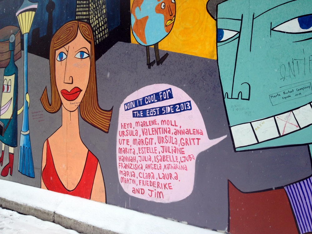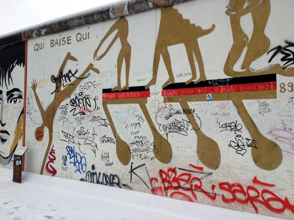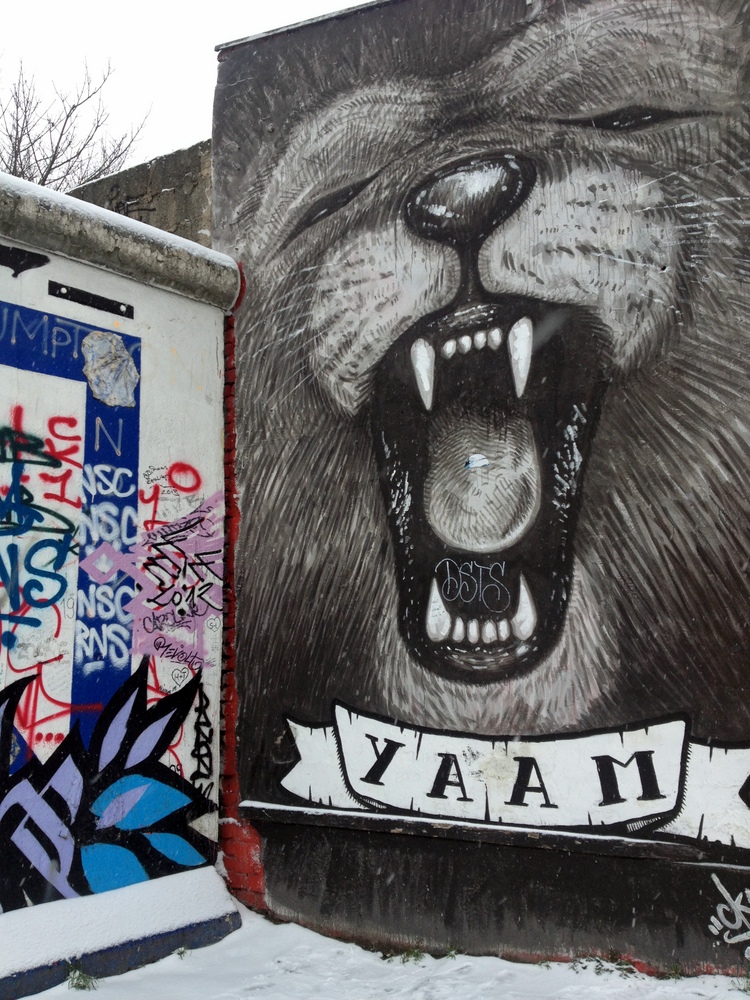 Il suffit d’une petite promenade de 10 minutes Holmarktstrasse en direction de Mühlenstrasse pour retrouver la trace la plus significative de ce qui fut l’une des hontes du XXe siècle (et Dieu sait que ce siècle en a pourtant plus que son lot): le Mur de Berlin. La East Side Gallery a su conserver plus d’un kilomètre de Mur, cette balafre qui a défiguré Berlin pendant près d’un demi-siècle. Un mur haut de 3m50, élevé du jour au lendemain, à la stupéfaction des habitants pour endiguer l’exode des Berlinois habitant dans le secteur contrôlé par les Soviétiques. Pendant toutes ces années, des deux côtés, des artistes, beaucoup d’anonymes, et certains plus connus, ont laissé exprimer leur espoir d’ouverture, leur envie de paix, avec candeur, drôlerie, cynisme ou poésie mais toujours avec ce même but: que le Mur tombe. Et en effet, en 1989, le Mur tombât et bien vite, entre collectionneurs de souvenirs et envie de faire table rase du passé, des pans entiers d’histoire ont disparus. Si ce n’était les passionnés qui ont crée l’East Side Gallery, il n’en existerait quasi plus rien (peut-être le petit morceau à Check Point Charlie pour les touristes). Il ne reste plus rien des fresques et graffiti originaux mais des artistes de différents pays ont été conviés à repeindre ces lieux de mémoire, ce qui en fait la plus grande galerie à ciel ouverte au monde. Malheureusement, je n’aurai pas l’occasion d’arriver jusqu’à la pièce maîtresse : la reconstitution du « Baiser de l’amitié » entre Leonid Brejnev (qui me filait une trouille bleue quand je le voyais à la télé étant petite) et Erich Honecker. L’humidité a eu raison de mes bottes bon marché! Les voilà qui crient famine alors que le sol est couvert de neige. Pour éviter un rhume et l’humiliation, je me replie vers la Ostbanhoff. Comme je m’y attendais, il y a un petit centre commercial. Je m’achète en vitesse une nouvelle paire de bottines et constatant qu’il est presque l’heure de renter, embarque dans le S-Bahn, pour rattraper l’U-Bahn un peu plus loin.