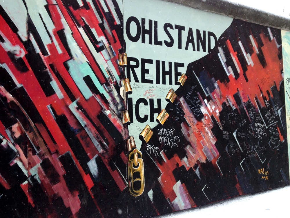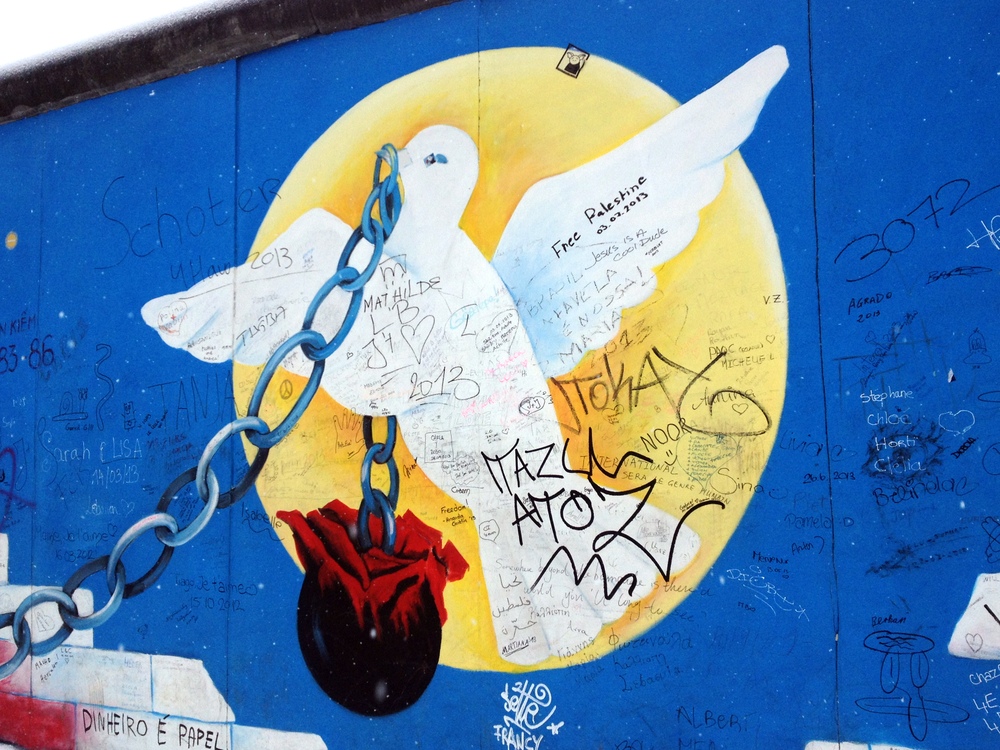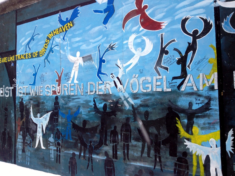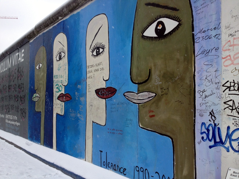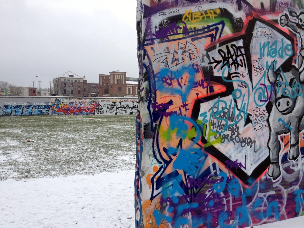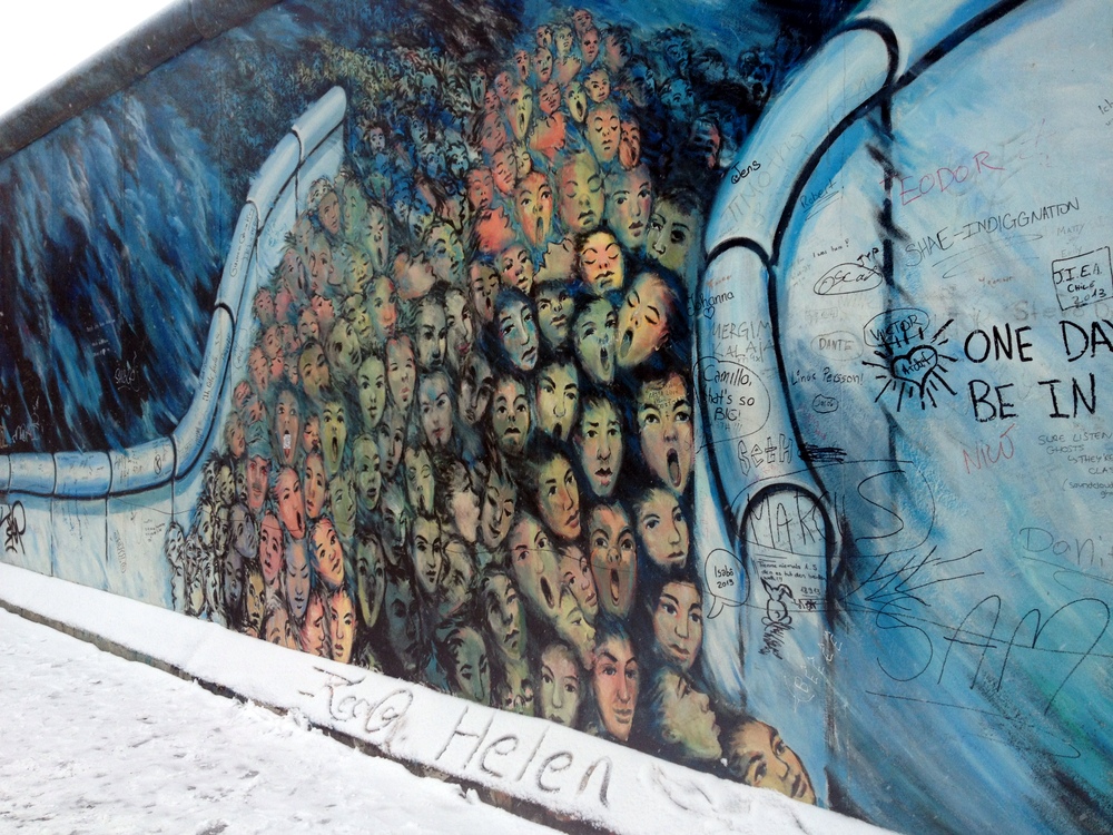 Il suffit d’une petite promenade de 10 minutes Holmarktstrasse en direction de Mühlenstrasse pour retrouver la trace la plus significative de ce qui fut l’une des hontes du XXe siècle (et Dieu sait que ce siècle en a pourtant plus que son lot): le Mur de Berlin. La East Side Gallery a su conserver plus d’un kilomètre de Mur, cette balafre qui a défiguré Berlin pendant près d’un demi-siècle. Un mur haut de 3m50, élevé du jour au lendemain, à la stupéfaction des habitants pour endiguer l’exode des Berlinois habitant dans le secteur contrôlé par les Soviétiques. Pendant toutes ces années, des deux côtés, des artistes, beaucoup d’anonymes, et certains plus connus, ont laissé exprimer leur espoir d’ouverture, leur envie de paix, avec candeur, drôlerie, cynisme ou poésie mais toujours avec ce même but: que le Mur tombe. Et en effet, en 1989, le Mur tombât et bien vite, entre collectionneurs de souvenirs et envie de faire table rase du passé, des pans entiers d’histoire ont disparus. Si ce n’était les passionnés qui ont crée l’East Side Gallery, il n’en existerait quasi plus rien (peut-être le petit morceau à Check Point Charlie pour les touristes). Il ne reste plus rien des fresques et graffiti originaux mais des artistes de différents pays ont été conviés à repeindre ces lieux de mémoire, ce qui en fait la plus grande galerie à ciel ouverte au monde. Malheureusement, je n’aurai pas l’occasion d’arriver jusqu’à la pièce maîtresse : la reconstitution du « Baiser de l’amitié » entre Leonid Brejnev (qui me filait une trouille bleue quand je le voyais à la télé étant petite) et Erich Honecker. L’humidité a eu raison de mes bottes bon marché! Les voilà qui crient famine alors que le sol est couvert de neige. Pour éviter un rhume et l’humiliation, je me replie vers la Ostbanhoff. Comme je m’y attendais, il y a un petit centre commercial. Je m’achète en vitesse une nouvelle paire de bottines et constatant qu’il est presque l’heure de renter, embarque dans le S-Bahn, pour rattraper l’U-Bahn un peu plus loin.