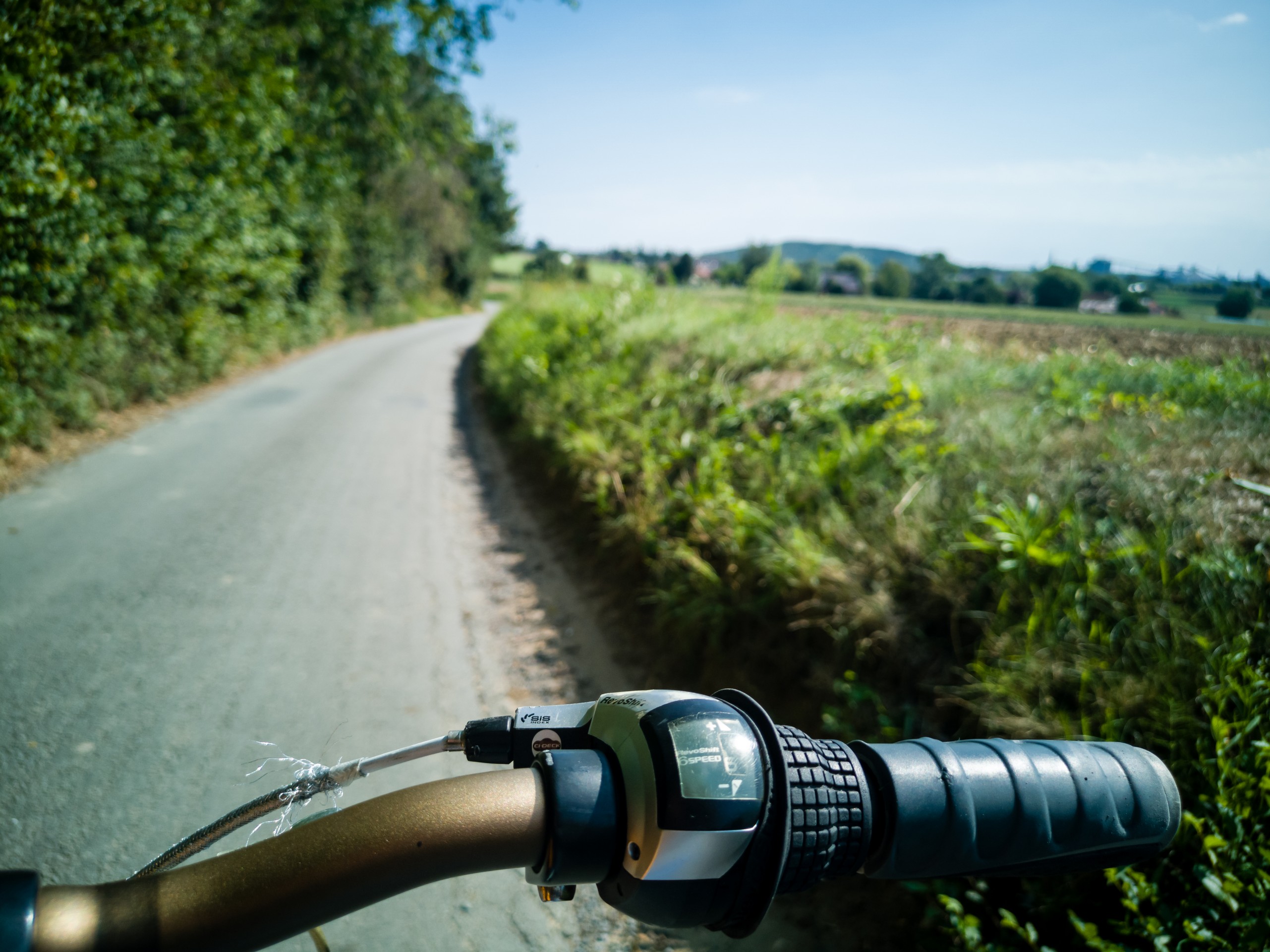 Je me serai bien attardée pour boire un verre mais je n’ai absolument pas le temps. Je souffre un peu à vrai dire… J’essaie d’utiliser ce qui reste de batterie avec parcimonie, pour m’aider en cas de passage un peu plus compliqué mais un vélo à assistance électrique pesant plus lourd que la normale, c’est doublement plus dur qu’avec un vélo normal… Comme avec les soubresauts de la route, le sac en carton qui contient la batterie est prêt à lâcher (je n’avais pas prévu qu’il n’y aurait pas de panier pour mettre un petit sac et n’ai pas voulu m’encombrer de mon sac à dos), mes mains sont crispées sur le guidon pour essayer d’éviter le pire. Bref, tout trace d’alcool a été rapidement brûlée par l’adrénaline !