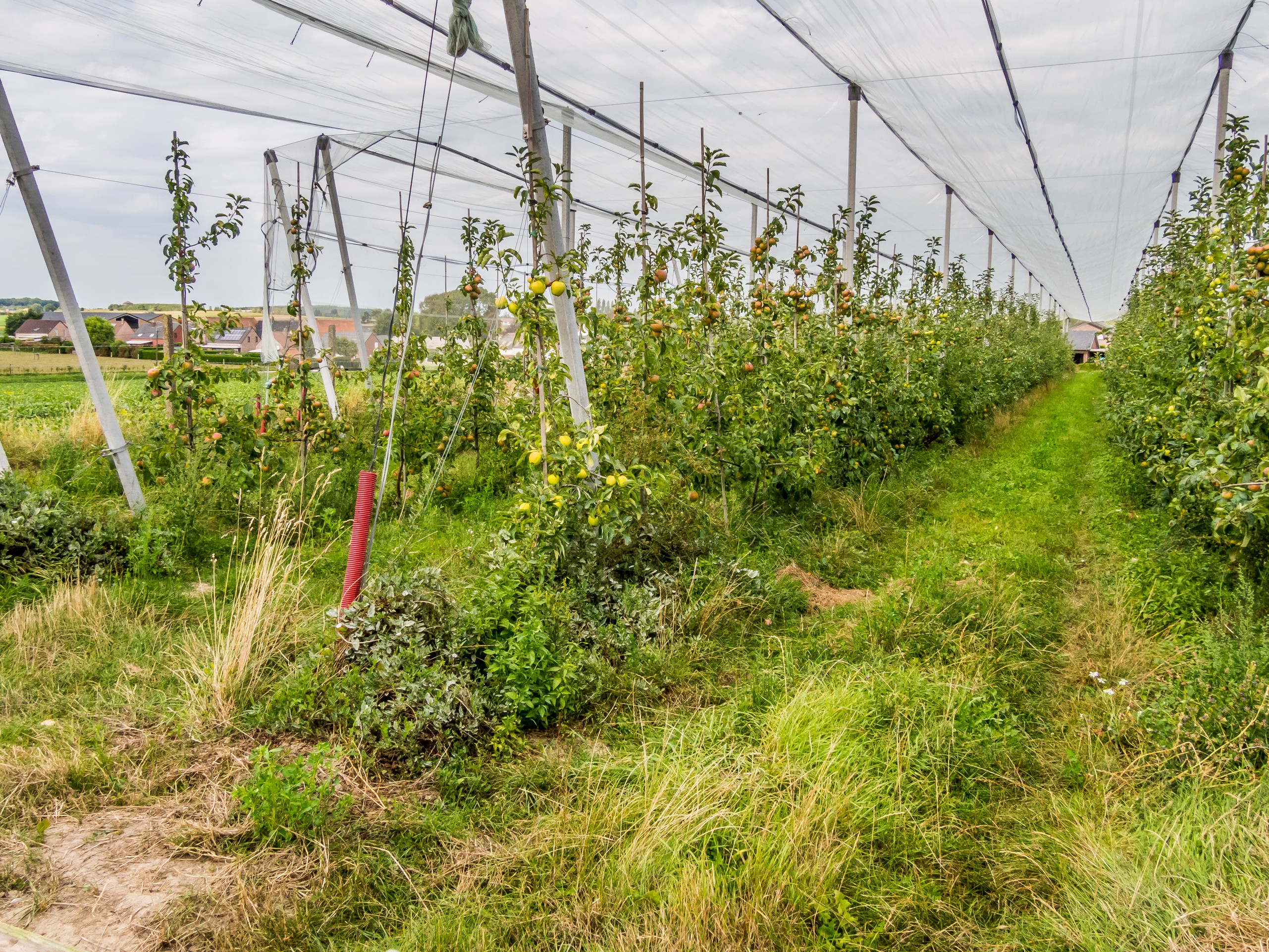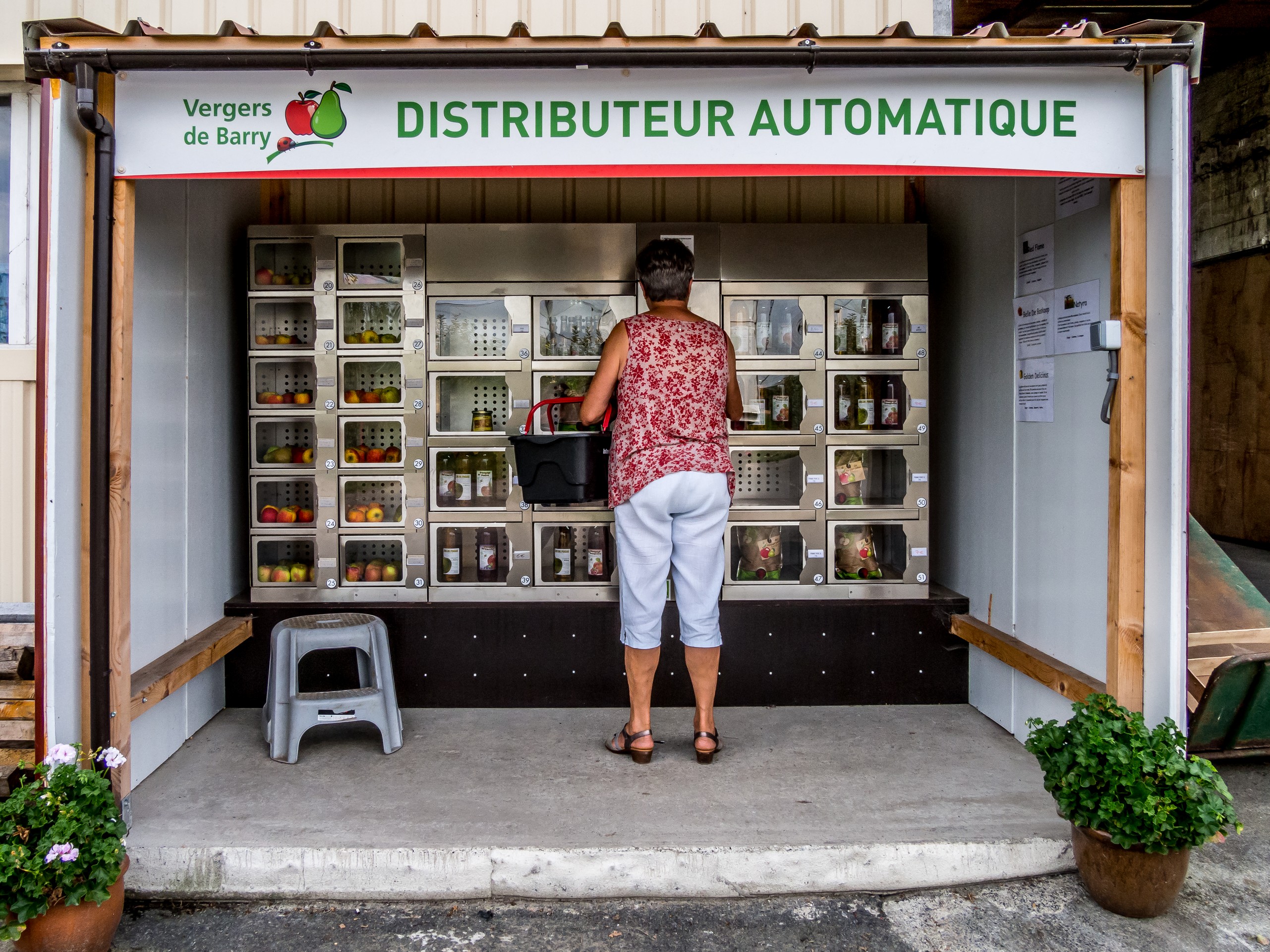 L’itinéraire moyen a une belle particularité, celle de passer par les Vergers de Barry, une exploitation très connue pour ses pommes, poires, fraises, cerises mais aussi coings. On peut y acheter fruits frais et jus pressés bios directement au verger, mais ils ont également un distributeur disponible à toute heure quand le point de vente est fermé. En cette fin d’été, les premières pommes et poires sont d’ailleurs bien rangées dans le distributeur. Les autres sont sagement en train de murir sur les petits arbres et avec un si bel été, la récolte promet d’être miraculeuse !