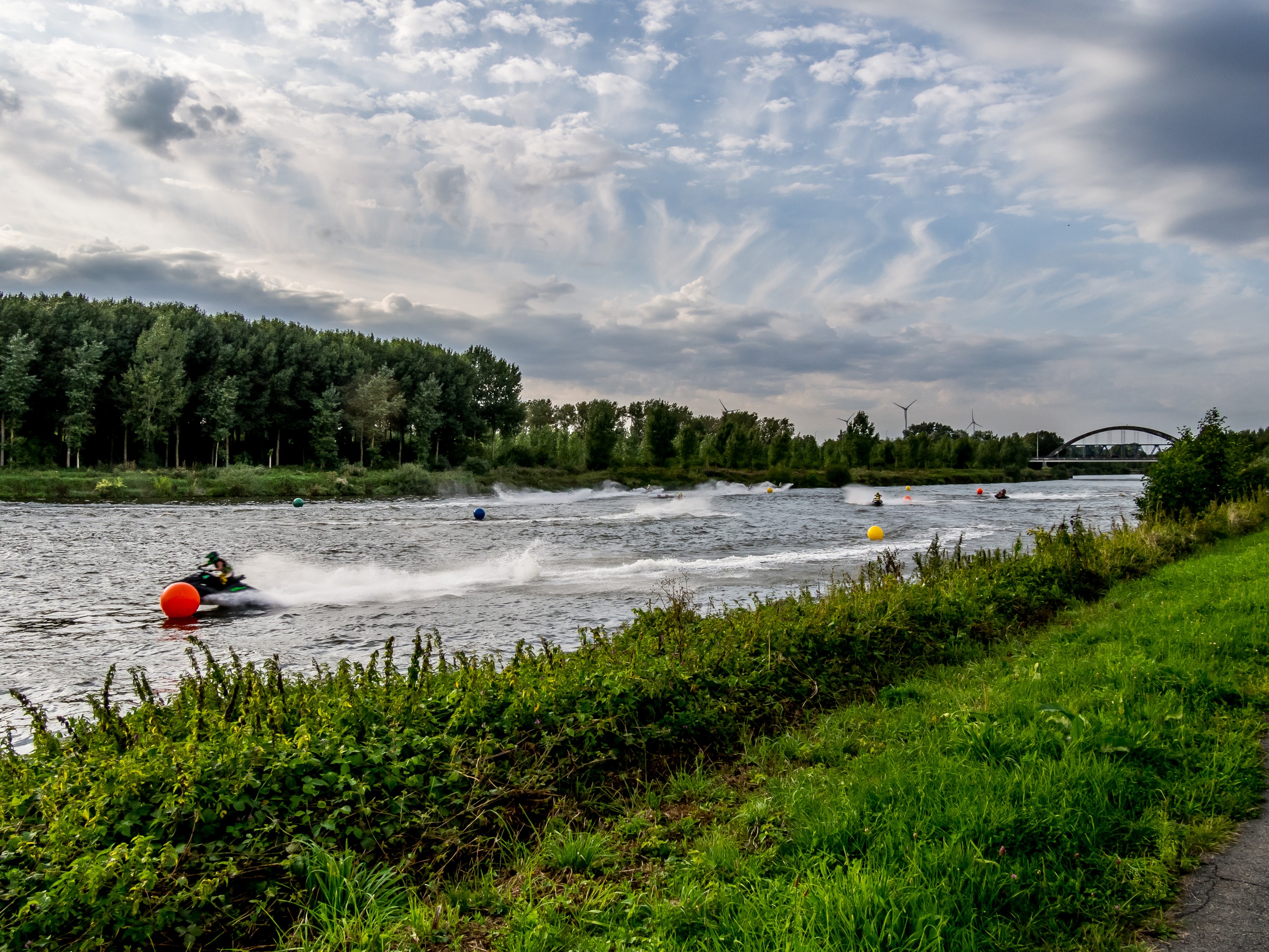 Le chemin ne pourrait pas être plus différent de l’aller. Nous sommes ici sur un chemin de halage au bord de l’eau. Pas de risque de croiser des voitures ici mais par contre, on y trouve pas mal de promeneurs ! Ce qu’il y a de chouette sur ce parcours, c’est qu’il est en grande partie ombragé : on passe par un petit bois et les berges du canal sont bordées d’arbres. C’est joli, romantique avec le petit air nostalgique qu’ont ces canaux à présent abandonnés. La quiétude sera seulement brisée au moment d’arriver au Grand Large de Péronnes. Ce grand centre nautique est justement en pleine effervescence : nous sommes samedi mais en plus, il fait beau et doux alors ce soir, c’est course de jet-skis ! En plus de tout ça, c’est un tout un club de motards qui s’est donné rendez-vous à la buvette du Grand Large et un parfum d’americana, de cuir et de chrome flotte dans l’air.