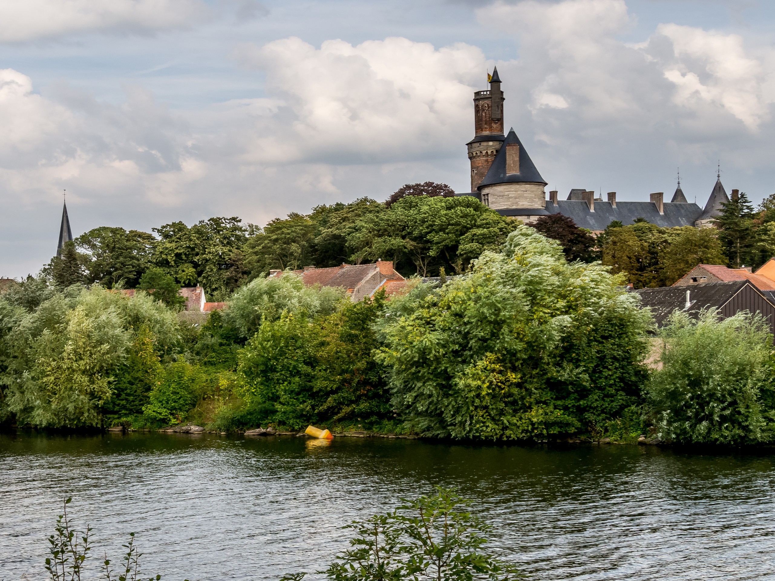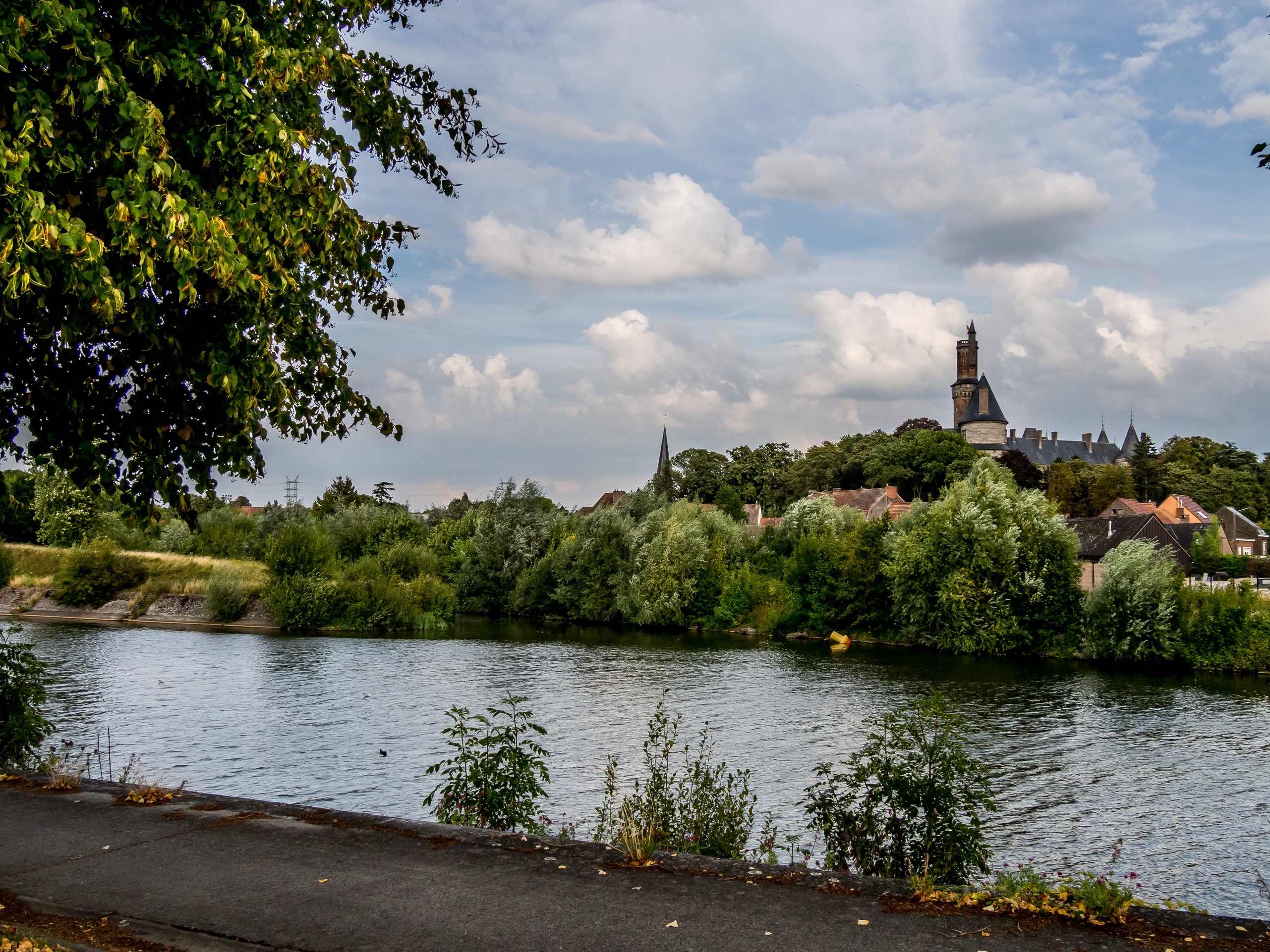 A partir du Grand Large, je retrouve les quais de l’Escaut. De l’autre côté du fleuve, un château se dresse : c’est celui d’Antoing. Ce qui signifie que je ne suis plus très loin de l’arrivée. Le Château d’Antoing est celui de la branche cadette des Princes de Ligne. Avec sa tour élancée, il a plus l’air d’un château de conte de fée que celui de son illustre cousin et il donne bien envie de le visiter aussi. Ce sera pour une autre fois, juste le temps de prendre quelques clichés et je remonte en selle pour les derniers kilomètres. La dernière centaine de mètres est d’ailleurs épique : les deux lanières du sac finissent par craquer et je termine mon aventure à bicyclette pied-à-terre, essoufflée, avec la batterie qui rend définitivement l’âme après un dernier sprint. J’ai juste le temps de récupérer mon sac à dos grâce à Noémie de l’office du tourisme et de me dépêcher d’aller m’écrouler, en nage, sur la banquette du train pour Bruxelles.