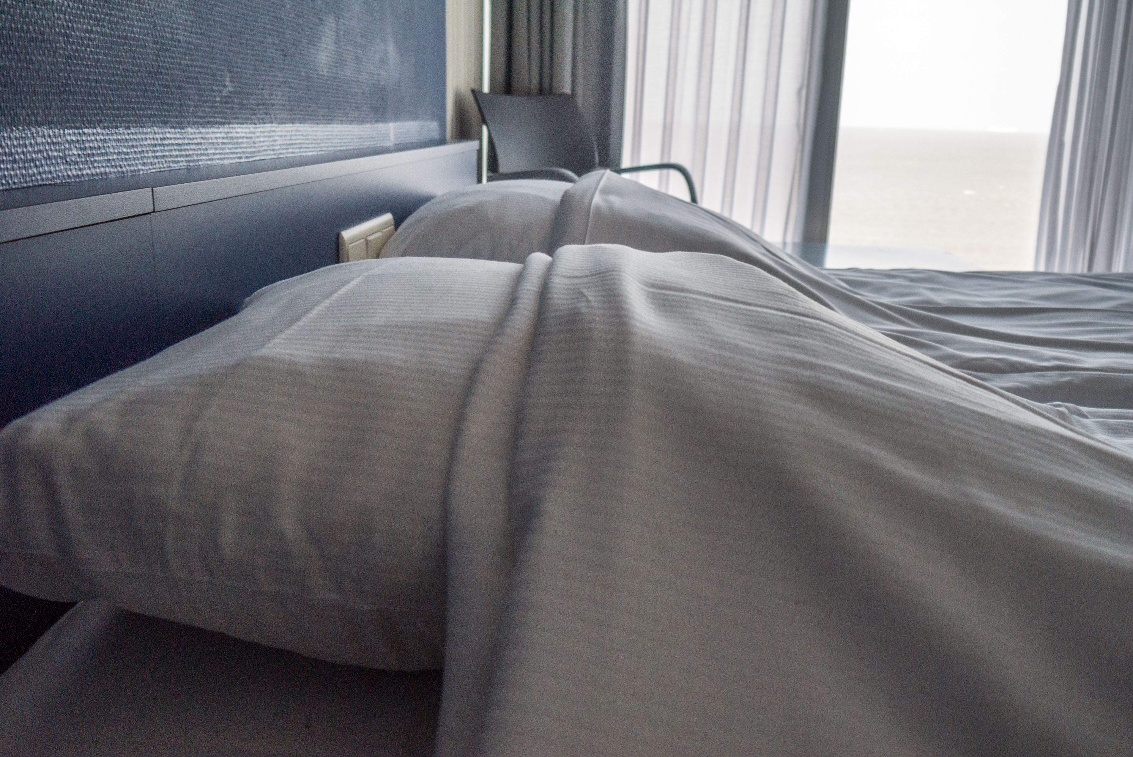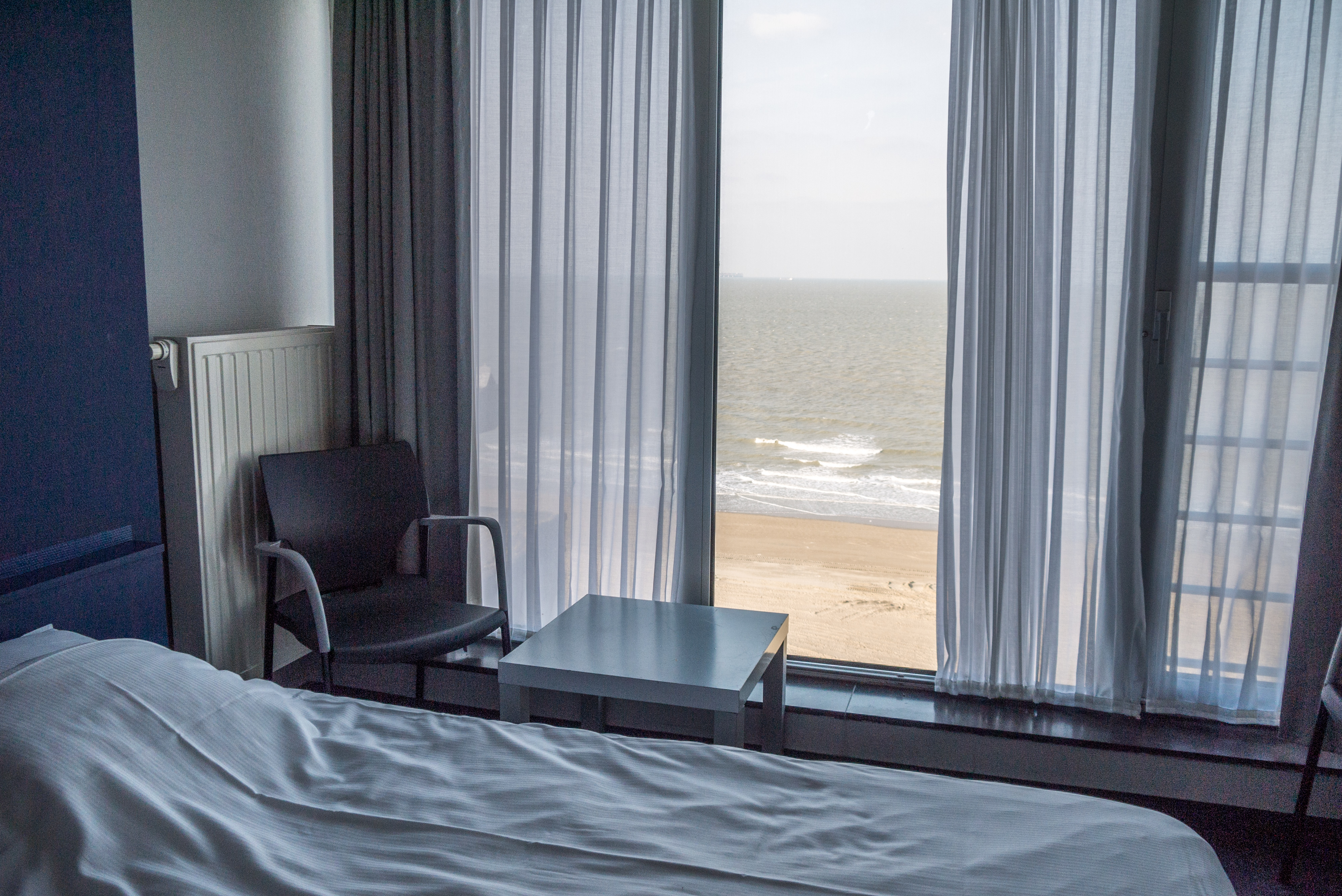 J'ai déniché une chambre au « Petit Rouge » (malheureusement fermé depuis, NDLR 2021), un hôtel peint en jaune, juste sur la digue, qui a depuis longtemps attiré mon attention tant il est différent du reste des bâtiment sur ce côté de la digue. Au lieu d'être une « barre d'appartements » datant des années 50, il s'agit d'un bâtiment d'époque où on a construit par-dessus. Les prix sont raisonnables pour une chambre avec vue sur mer (70 Euros, petit-déjeuner compris) et je dois dire que quand ce n'est pas du luxe quand on rentre dans la chambre. Bonne surprise : je suis au dernier étage et la vue sur la plage est imprenable ! Si la chambre est un peu sommaire (à ce prix-là, ne vous attendez pas à du luxe) et si la salle de bain ressemble à une salle de bain d'hôpital, il n'y manque rien. Il y a même une piscine et un sauna dans l'enceinte de l'hôtel (que je n'aurai pas testé, ayant passé mon temps à me promener).