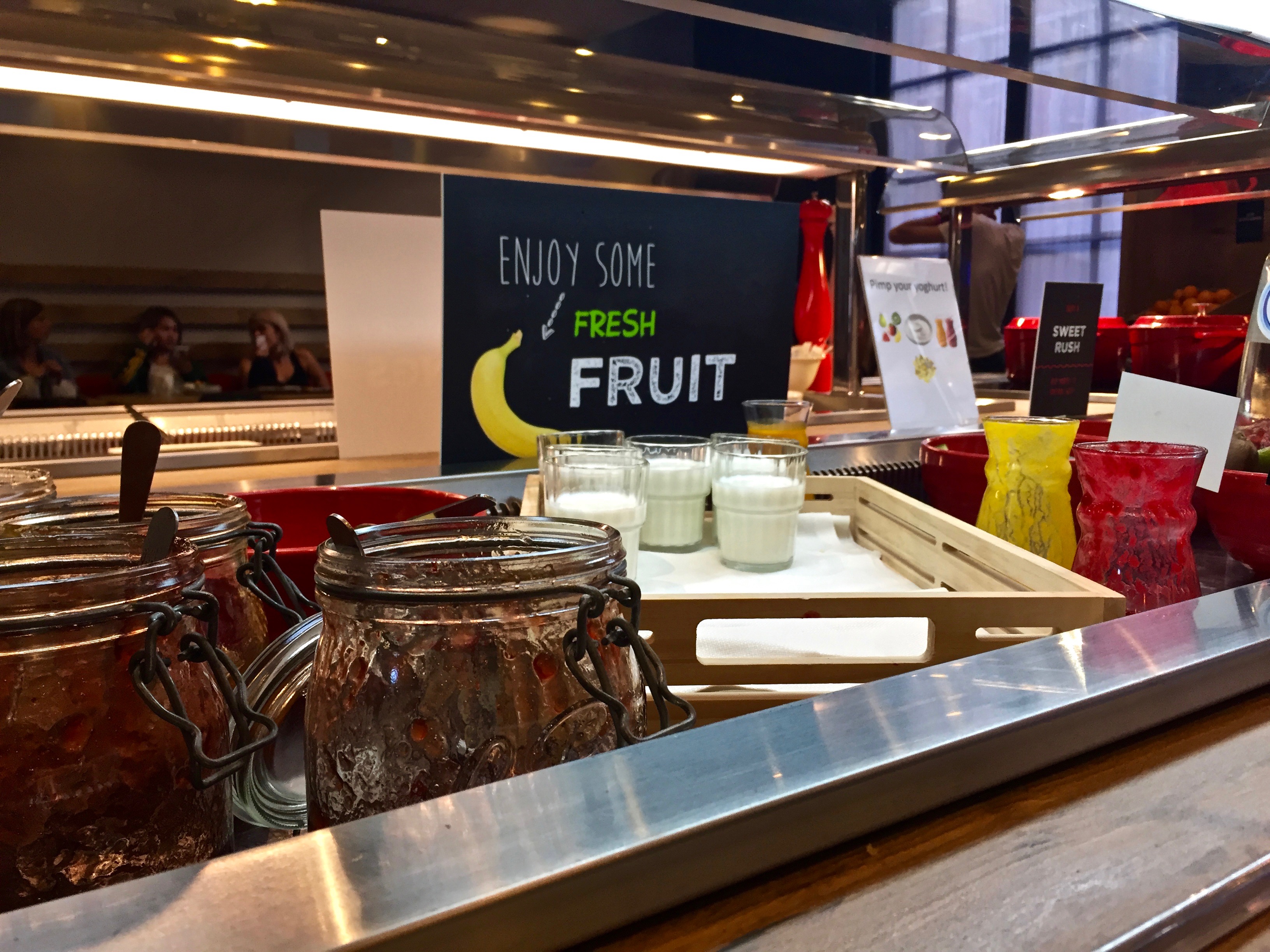 Le temps de rentrer dans ma chambre prendre une douche et vient enfin le moment de tester ce fameux petit-déjeuner et j’ai été sincèrement surprise/ C’est un des déjeuner les plus complets que j’aie vu dans un hôtel. Il y a de tout, et pour tous. Il y a les classiques pains (mais pas mal de choix), viennoiseries et céréales mais en plus, on trouve différents mueslis sains (avec ses toppings – fruits séchés, fruits secs, graines et même une option sans gluten), des yaourts, des coulis pour le yaourt, plein de fruits et de légumes… Les amateurs d’English Breakfast ne sont pas laissés de côté puisqu’on trouve la triade anglaise : bacon, patates et haricots blancs dans de belles grosses marmites rouges qui gardent les aliments bien au chaud. Les gourmands ne sont pas oubliés puisqu’on trouve aussi des donuts, des muffins, des pancakes (à napper avec du vrai sirop d’érable) ; on peut même faire ses gaufres soi-même, Belgique oblige. Comble du raffinement pour moi, on peut se faire un VERITABLE chocolat chaud avec des palets de chocolat noir Callebaut, à arroser de lait bien chaud et à touiller avec de mignons petits fouets mis à disposition jusqu’à ce qu’ils soient bien dissouts. Bref, celà suffit pour que j’appose mon sceau de validation.