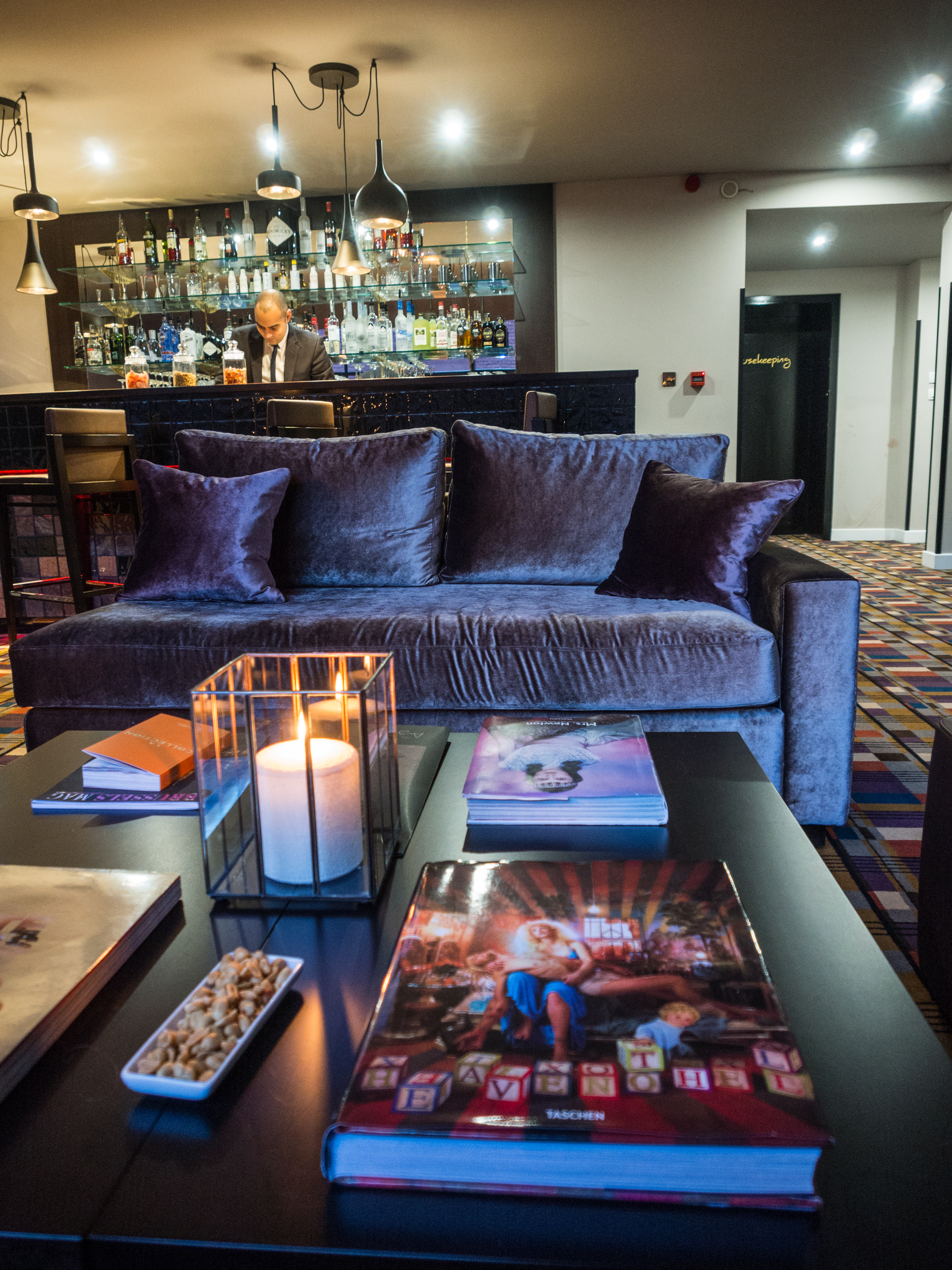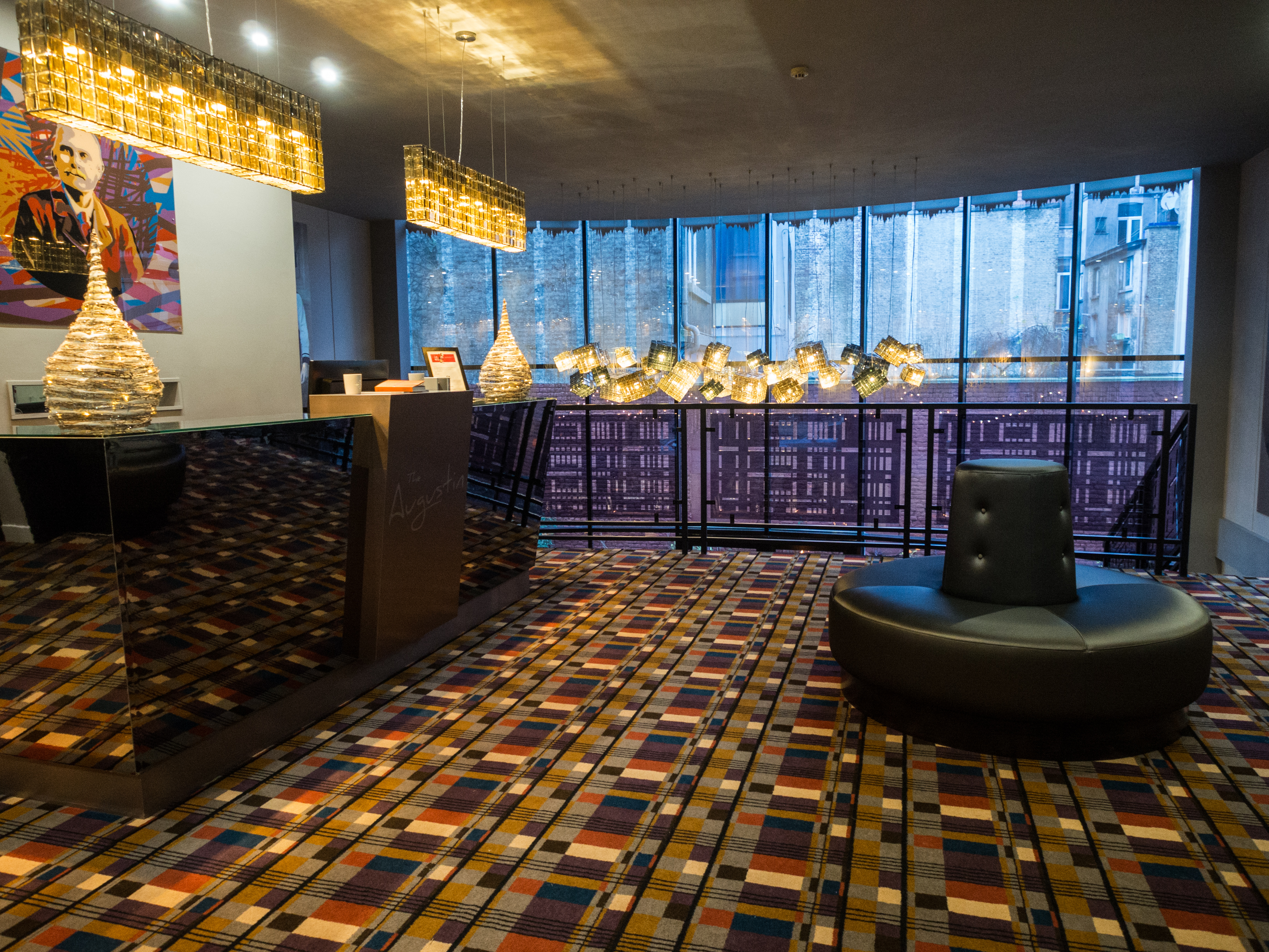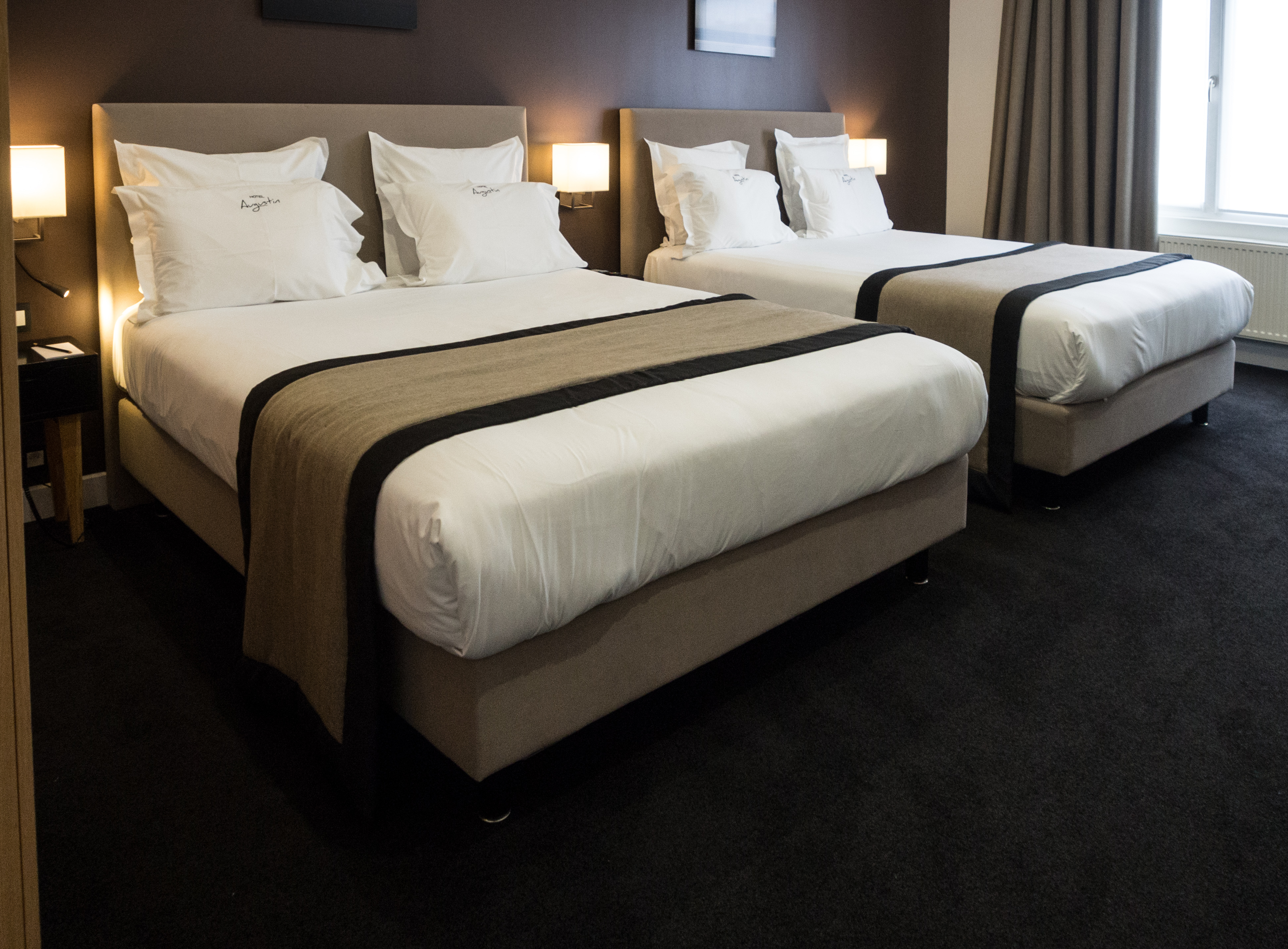Si on descend d'un niveau, on arrive au petit bijou de l'hôtel : son bar, Augustino ! Il est noir, laqué, bien fourni, on peut s'y prélasser dans de grands fauteuils en velours mordoré ET il y a une cheminée (mais il faisait un peu trop chaud pour l'allumer, pas grave, les flammes étaient remplacées par une dizaine de bougies, ce qui n'est pas mal non plus) ! Si on est seule, ou pour patienter, il y a une bonne dizaine de beaux livres à consulter sur les tables du bar. Côté chambres, elles sont plutôt de grandes tailles pour Bruxelles! La literie est toute neuve et on y dort superbement bien. Et mention spéciale pour les coussins monogramés qui leur donnent un cachat très chic. Côté salle de bain, c'est Byzance! Les fans de Nuxe seront contents de retrouver cette marque en produits d'accueil (je salue l'esprit écologique de mettre les produits dans des dispensateur plutôt que des petites bouteilles individuelles. Côté un peu moins bien, les chambres font pâles figures quand on vient du lobby. On s'attend à quelque chose de plus peps. Quelques meubles ont sans doute été récupérés de l'ancienne chaîne qui occupait l'hôtel et on dirait que la rénovation n'a pas été jusqu'au bout. Rien de bien grave... Là où l'hôtel excelle, c'est la proximité avec ses clients. Les réceptionnistes ont tous été d'une gentillesse exemplaire, n'hésitant pas à bavarder longuement, tant que la charge de boulot leur permette et n'hésitez pas à leur demander conseil.