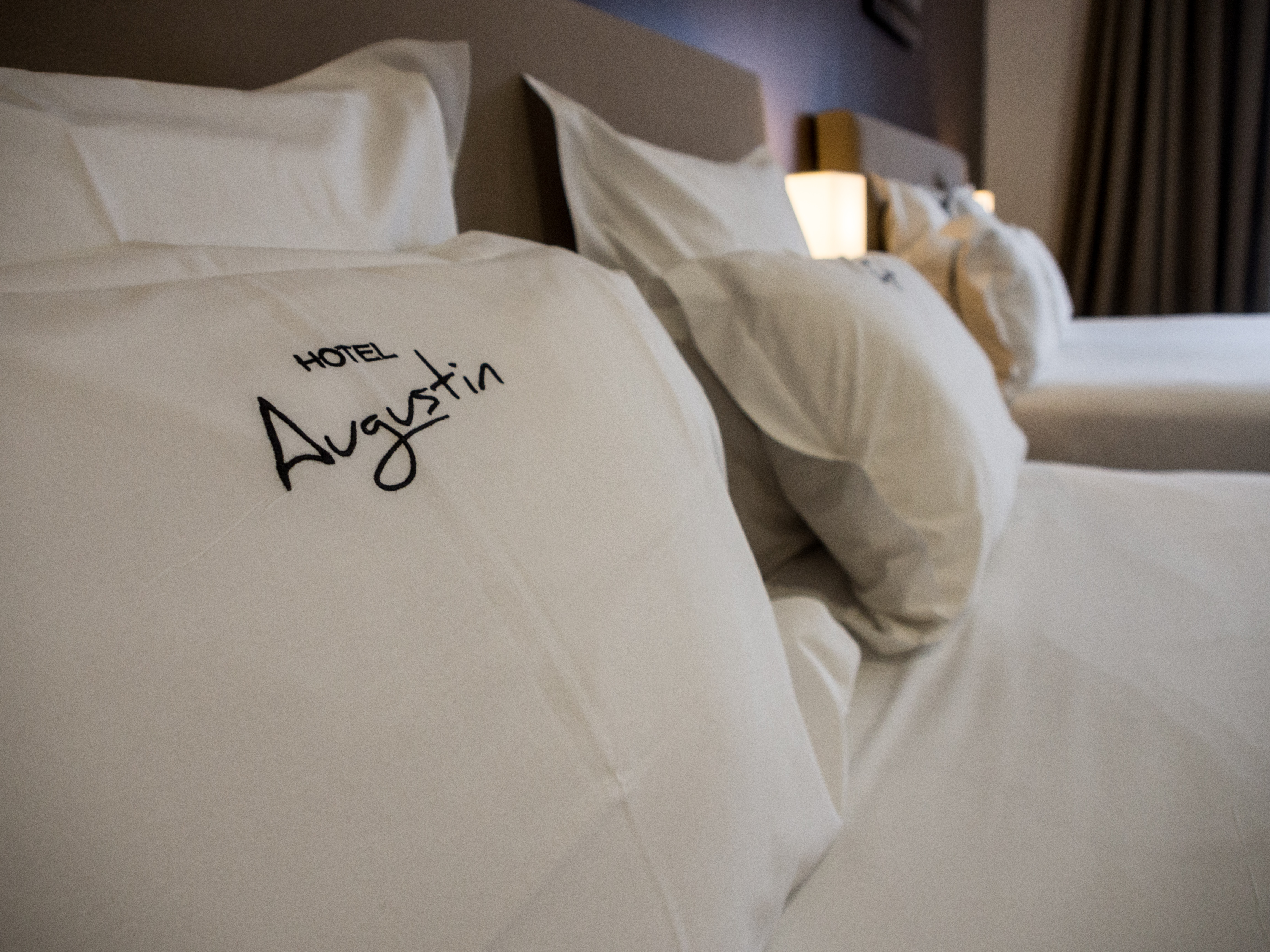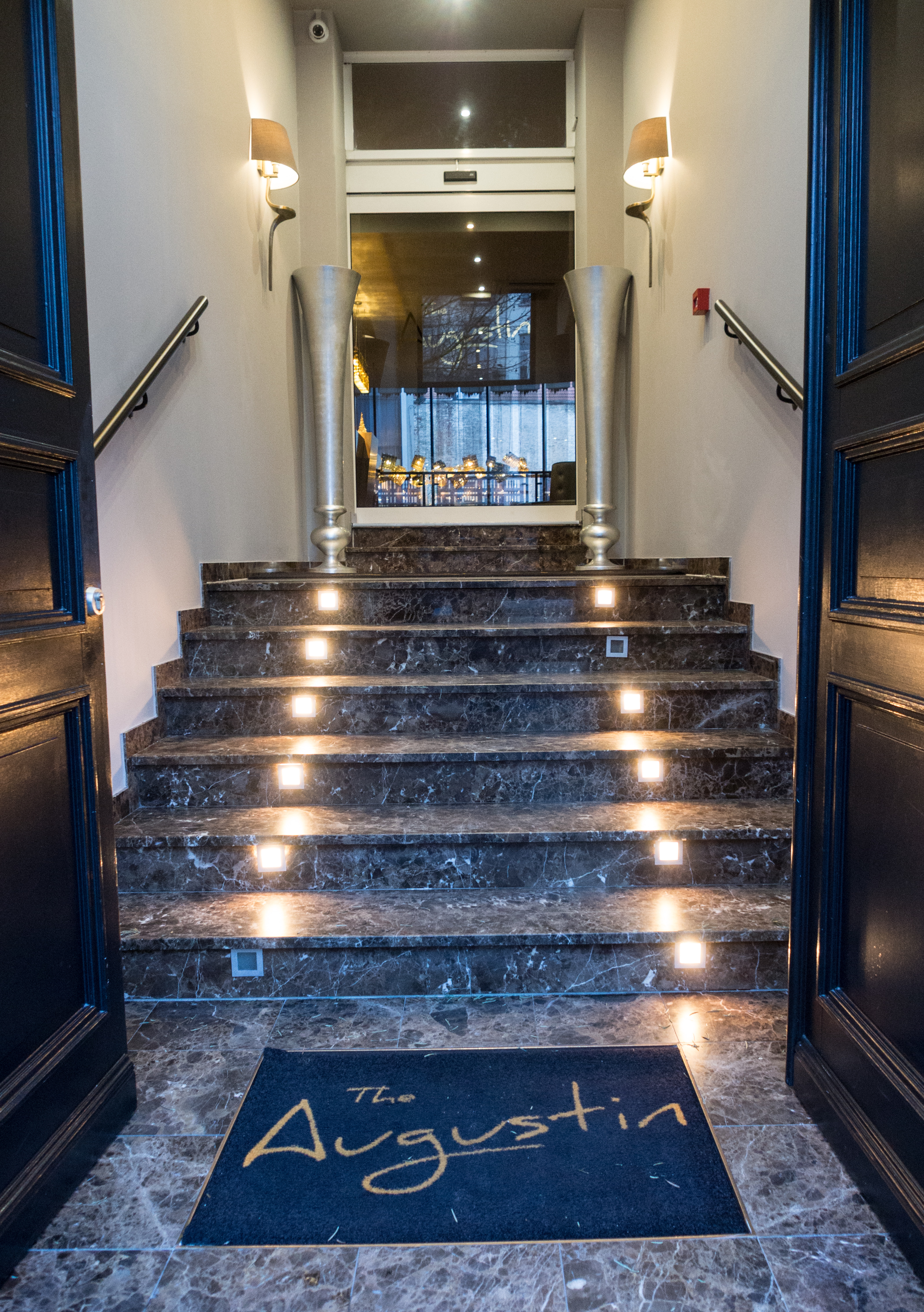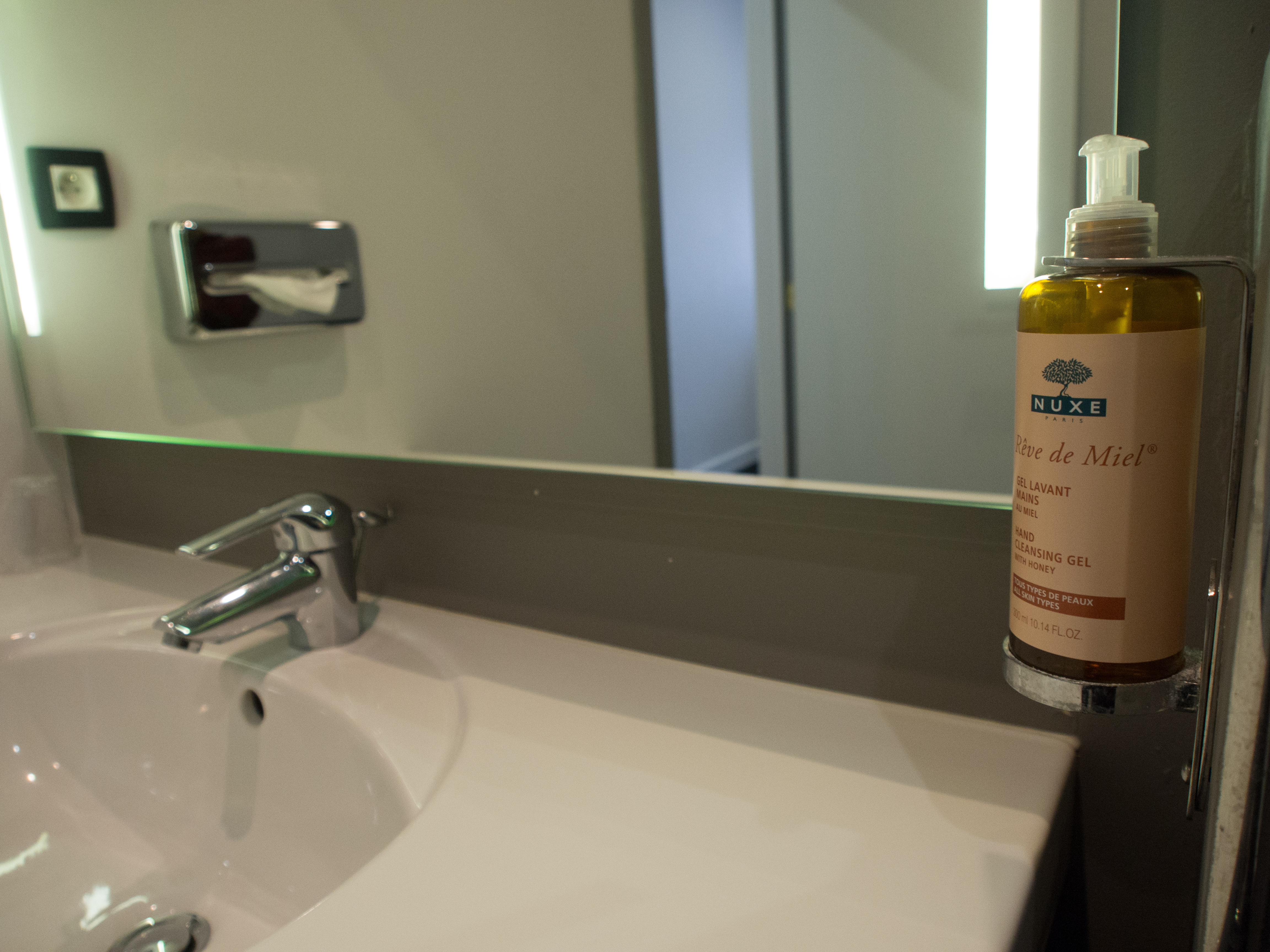 Si on descend d'un niveau, on arrive au petit bijou de l'hôtel : son bar, Augustino ! Il est noir, laqué, bien fourni, on peut s'y prélasser dans de grands fauteuils en velours mordoré ET il y a une cheminée (mais il faisait un peu trop chaud pour l'allumer, pas grave, les flammes étaient remplacées par une dizaine de bougies, ce qui n'est pas mal non plus) ! Si on est seule, ou pour patienter, il y a une bonne dizaine de beaux livres à consulter sur les tables du bar. Côté chambres, elles sont plutôt de grandes tailles pour Bruxelles! La literie est toute neuve et on y dort superbement bien. Et mention spéciale pour les coussins monogramés qui leur donnent un cachat très chic. Côté salle de bain, c'est Byzance! Les fans de Nuxe seront contents de retrouver cette marque en produits d'accueil (je salue l'esprit écologique de mettre les produits dans des dispensateur plutôt que des petites bouteilles individuelles. Côté un peu moins bien, les chambres font pâles figures quand on vient du lobby. On s'attend à quelque chose de plus peps. Quelques meubles ont sans doute été récupérés de l'ancienne chaîne qui occupait l'hôtel et on dirait que la rénovation n'a pas été jusqu'au bout. Rien de bien grave... Là où l'hôtel excelle, c'est la proximité avec ses clients. Les réceptionnistes ont tous été d'une gentillesse exemplaire, n'hésitant pas à bavarder longuement, tant que la charge de boulot leur permette et n'hésitez pas à leur demander conseil.