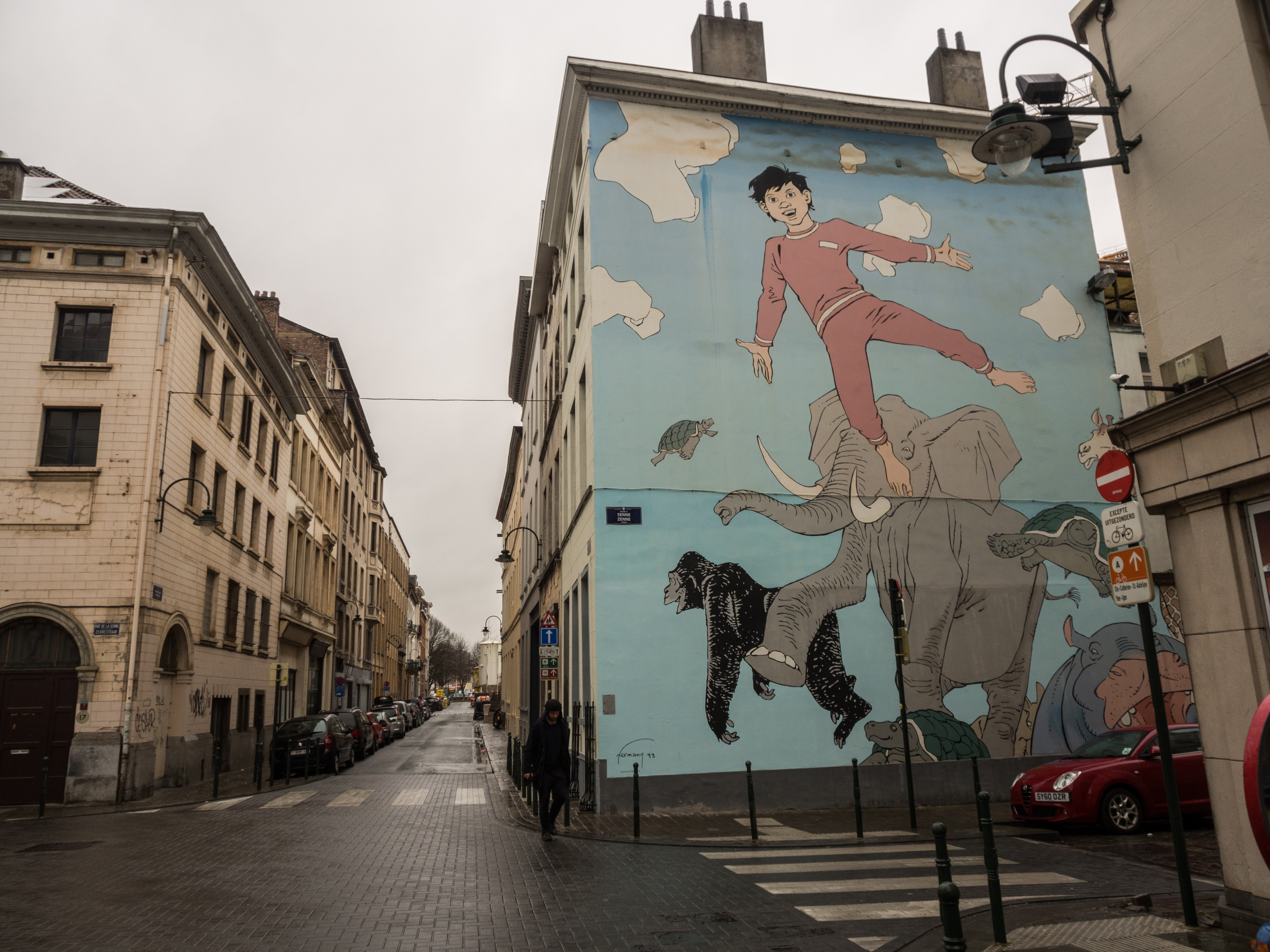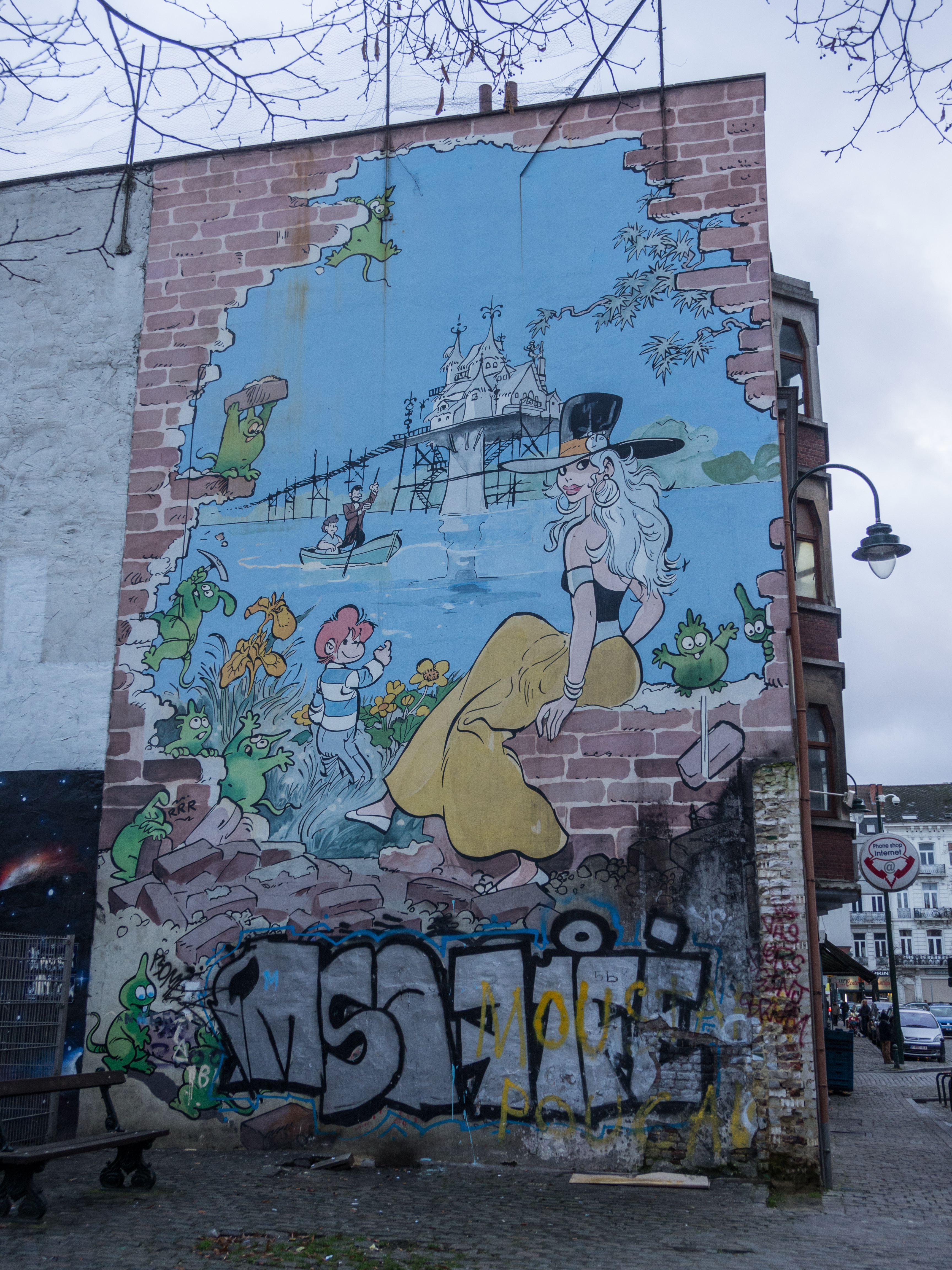 Un peu plus au sud, nous voilà à nouveau dans un autre Bruxelles. Imperceptiblement, nous arrivons dans le Quartier Anneesens. Un quartier qui a longtemps eu une mauvaise réputation. Pas de lofts luxueux dans le coin, mais de petites maisons à appartements et une population d'origine immigrées qui, pour certains, tire le diable par la queue car oui, paradoxalement, si la région de Bruxelles est la plus riche du pays, la commune de Bruxelles est plutôt pauvre. Ici, les rues sont courtes, et étroites, ramassées entre le boulevard Anspach et la "petite ceinture", l'ancien tracé de la deuxième enceinte de la ville, à présent devenue une vraie autoroute urbaine. Ici, presque chaque rue à son épicerie, qui reste ouverte tard et où on trouve de tout. Les fruits et les légumes, disposés avec amour, sont les seuls éléments qui donnent de la couleur au quartier... çà et pas mal de fresques du parcours BD.