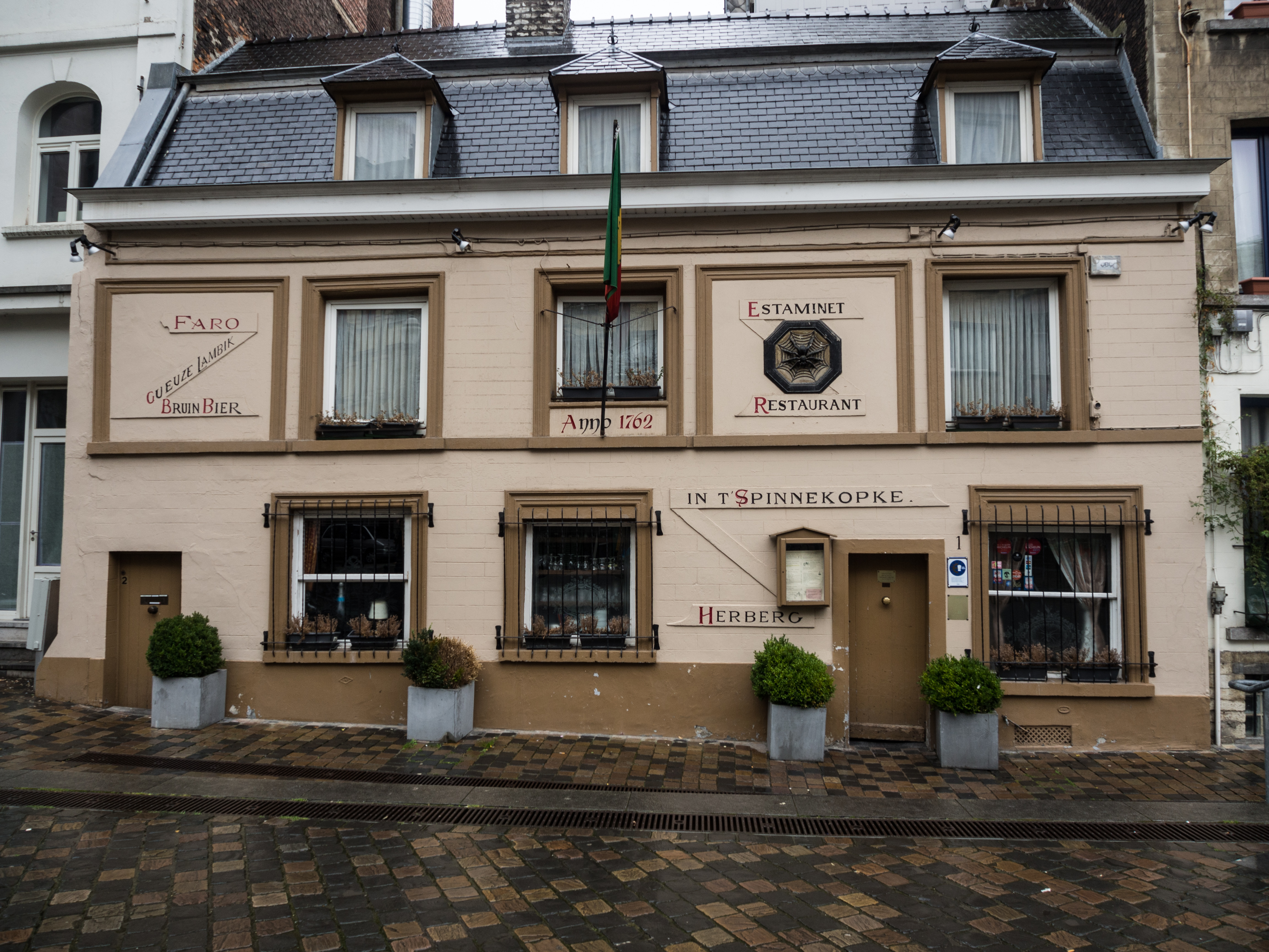 Mais pour le reste de la la ballade, nous allons passer de l'autre côté du Boulevard de Stalingrad, puis de l'autre côté du Boulevard Anspach. Il suffit de quelques mètres pour que Bruxelles change de visage et d'ambiance. Nous sommes à quelques mètres du quartier de Dansaert/Saint-Géry, où les bars succèdent aux restaurants, qui succèdent aux boutiques et pourtant... Le quartier Senne/Anneesens, Lemonnier a quelques fois l'air d'être à des années lumières. Premier arrêt : la Place du Jardin aux fleurs, c'est un peu la frontière du quartier. Une place ronde, avec une petite fontaine au centre qui est toute mignonne en été. A chaque fois que j'y passe, je me demande toujours comment il est possible que cette Place n'aie pas été prise d'assaut par les bars branchés! A part une pizzeria, et un éphémère resto de cuisine du Surinam, pas de bars... Par contre, si vous voulez tenter de la cuisine typiquement belge; une institution se cache dans une petite maison : "In 't Spinnekopke". N"hésitez pas à vous lâchez sur le filet américain (une espèce de tartare de bœuf) coupé et assaisonné devant vous. Je vote aussi pour le porc à la Carolus (la bière de Malines) et pour le trio de sorbet à la bière. Service à l'ancienne, avec l'accent brusseleir!