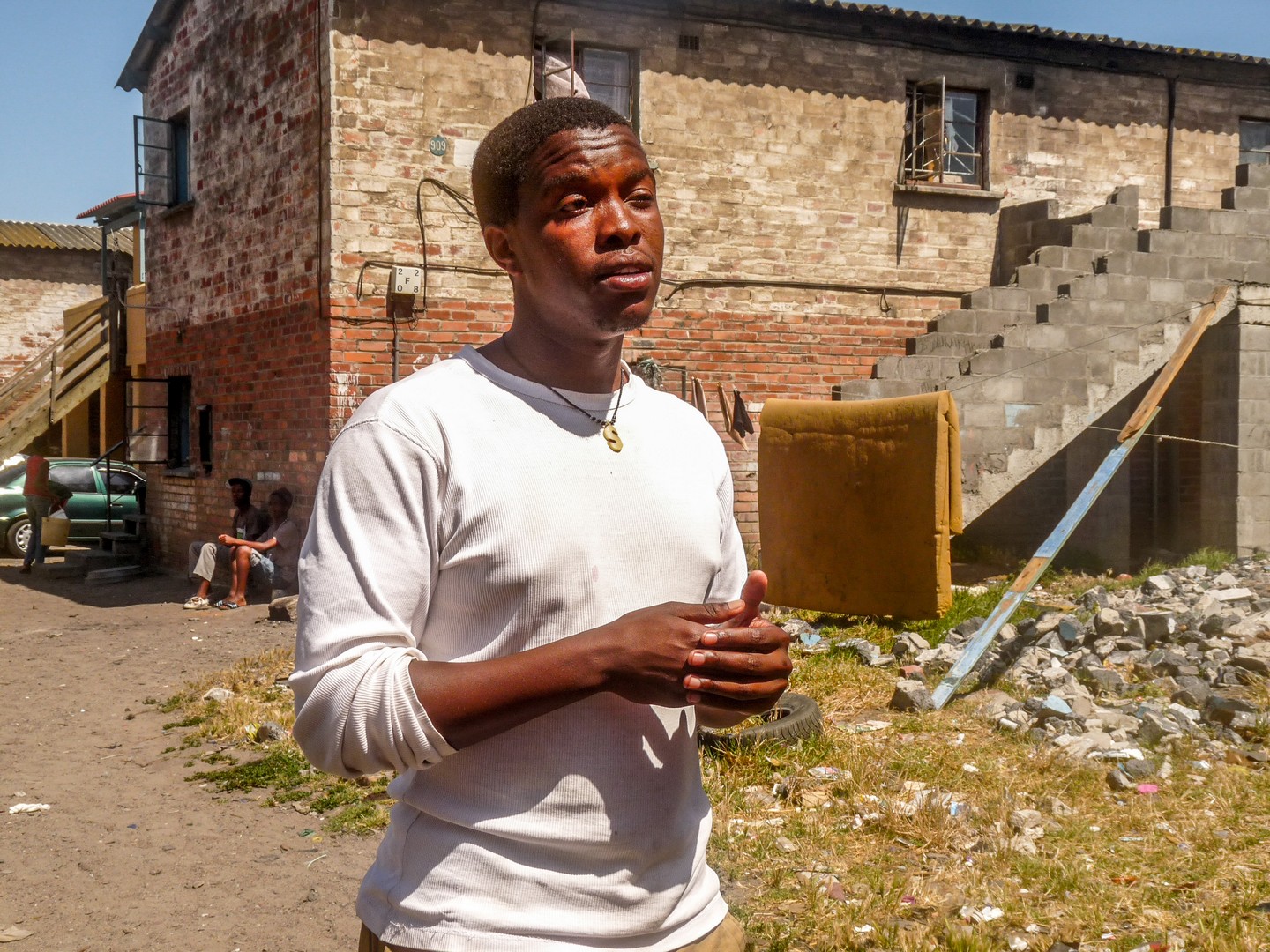Sur le chemin du retour vers la camionnette, une femme nous aperçoit et nous invective. Sa voix est pleine de colère et son débit est tellement rapide que je n’y comprends rien. Les visages se font graves. Pas besoin de chercher pour comprendre qu’on puisse être en colère. Charles nous parle alors du stade de foot du Cap qui a coûté si cher pour un pays où le « soccer » n’est pas roi. Maintenant, on ne sait qu’en faire. « Pendant la Coupe du monde, on était tous réunis pour supporter notre équipe mais maintenant que la fête est finie, on s’interroge sur comment l’argent a été dépensé et sur les retombées réelles sur l‘économie. Ils voient plein de projets en ville mais ici, rien ou presque ne change ». Nous nous serons les mains et Charles nous souhaite un bon retour en nous demandant de nous souvenir de ce que nous avons vu.