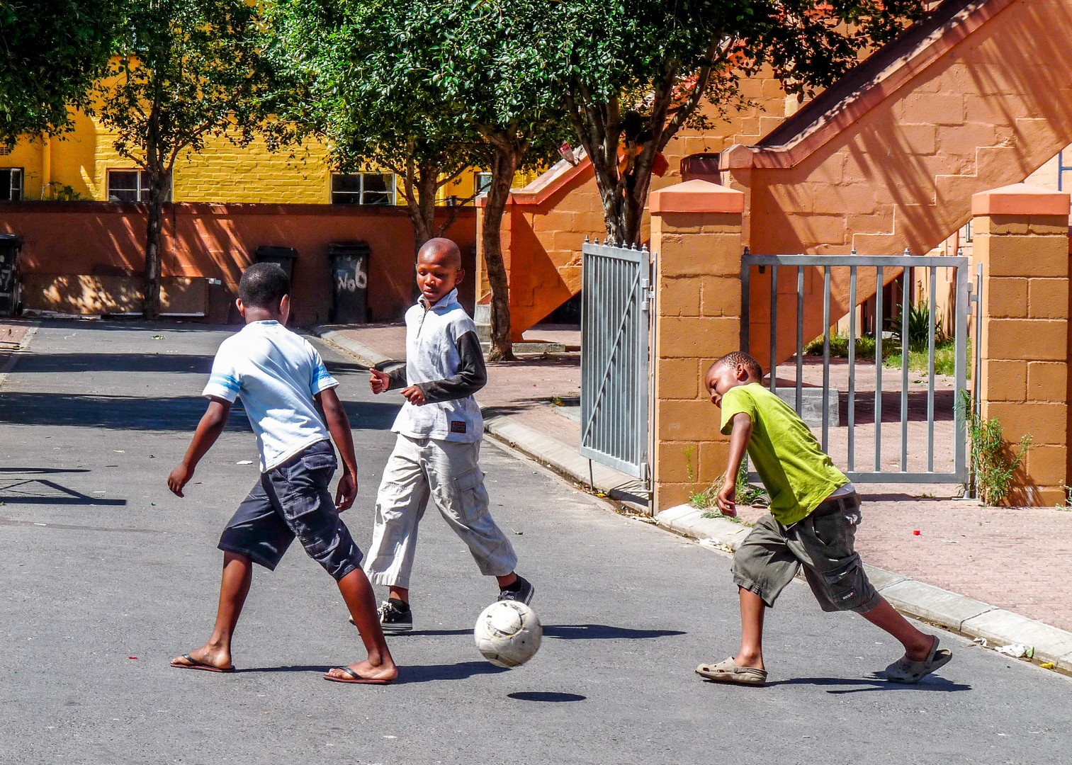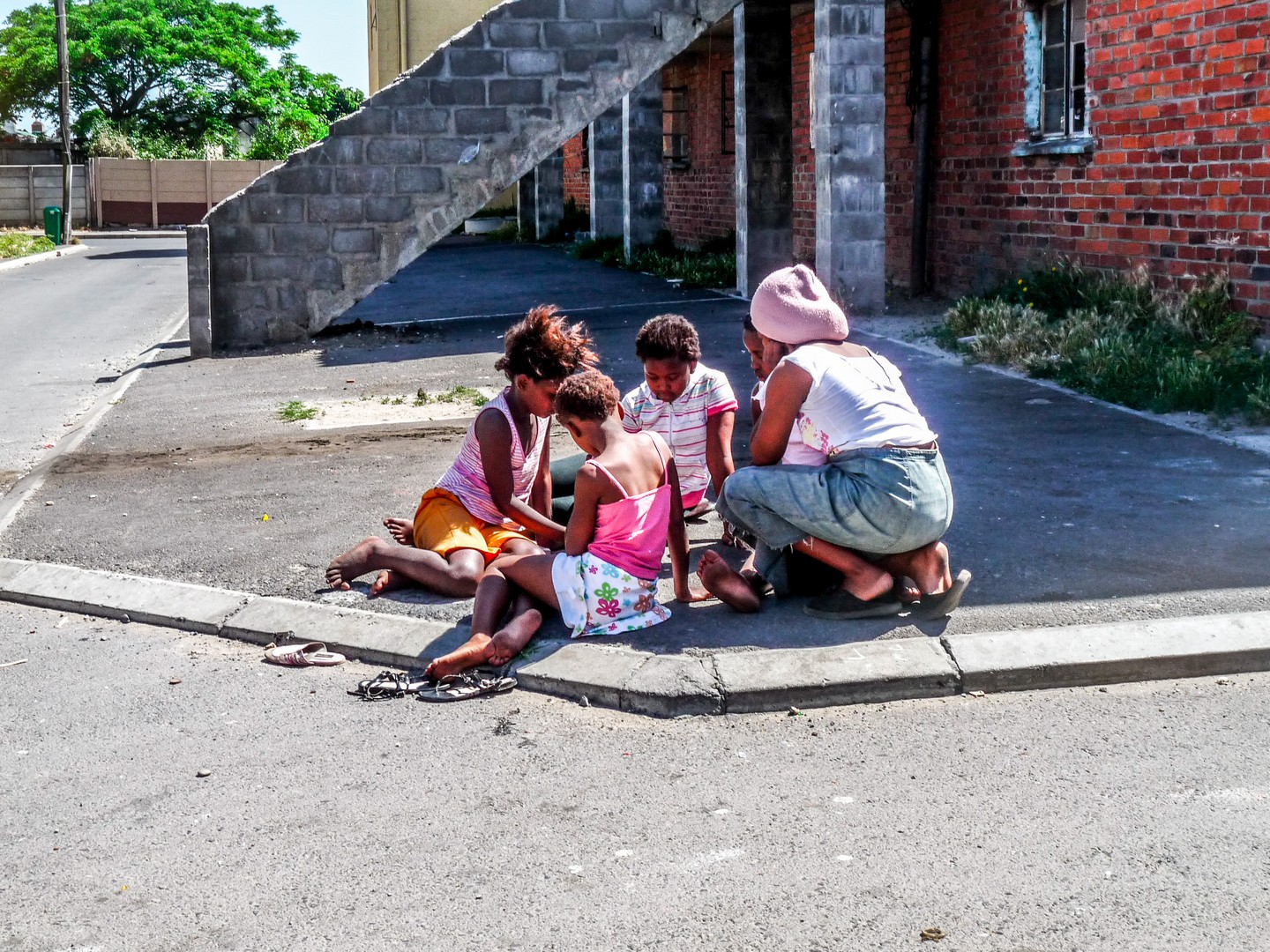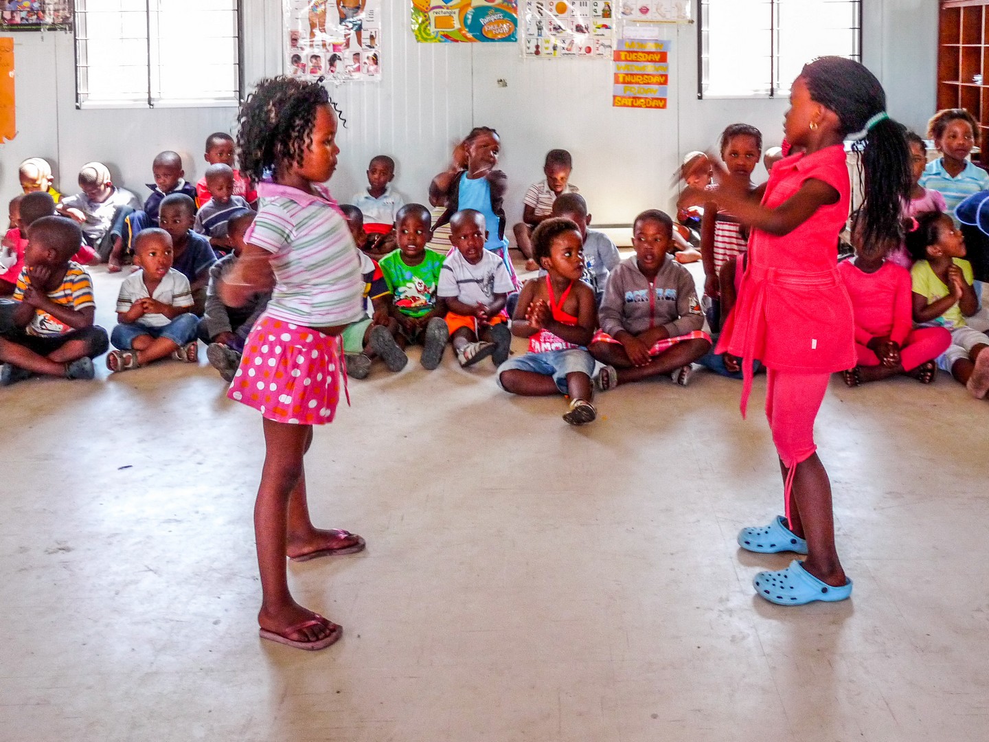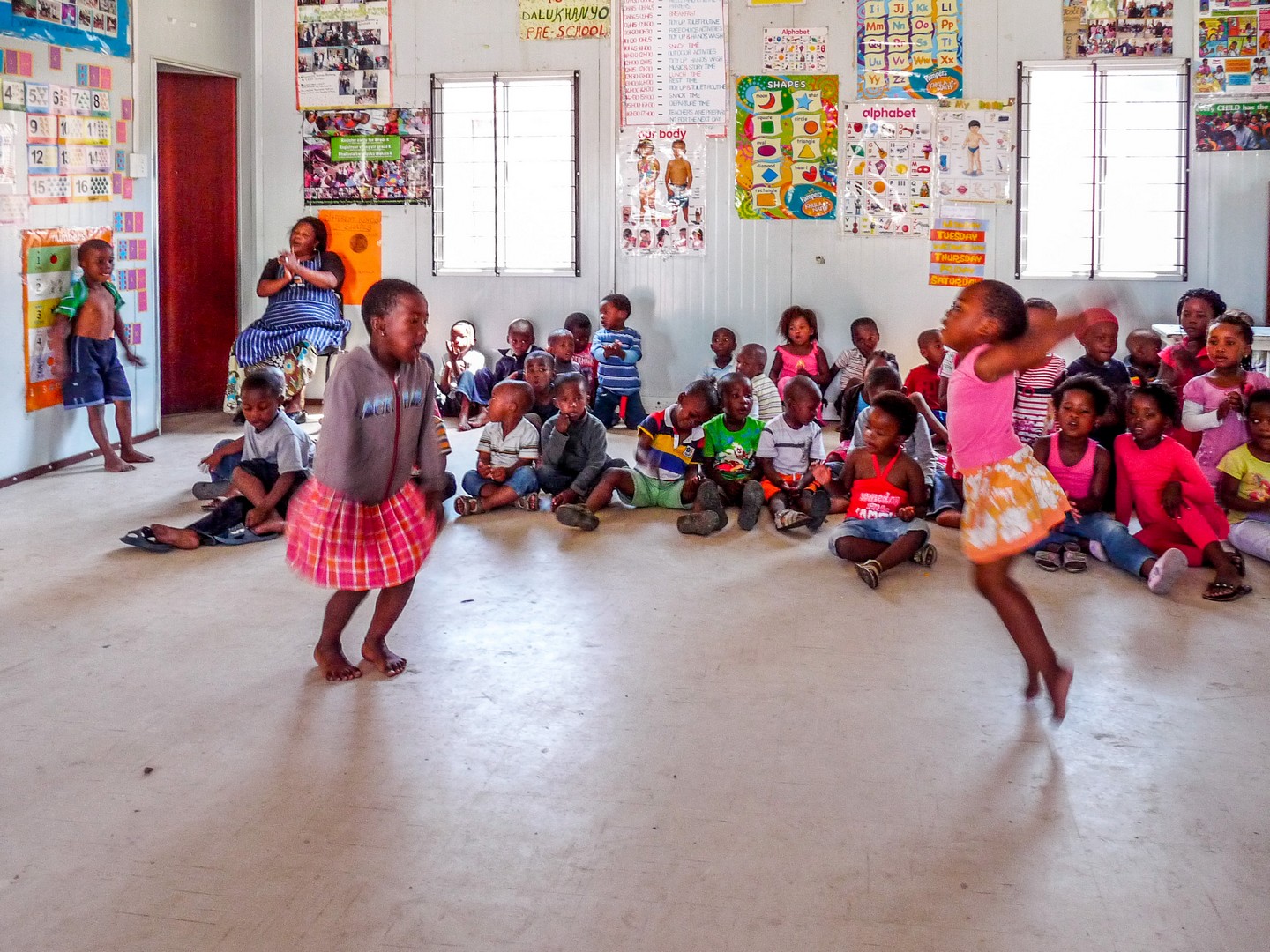 Charles nous balade dans la partie « en dur » de Langa. Celle où furent construits les « hostels », les résidences pour des travailleurs noirs qui habitaient dans les « homelands » mais bénéficiaient d’un laisser-passer pour travailler en zone blanche. Interdiction pour eux d’y faire venir leurs familles ! Ces groupes d’hommes seuls, venant d’ailleurs et vivant dans la promiscuité, étaient souvent regardés d’un mauvais œil par les habitants permanents des townships. A présent, ces bâtiments en béton sont en cours de rénovation pour en faire des appartements ou des résidences communes. Charles nous emmène visiter l’intérieur. C’est sombre l’intérieur, les fenêtres sont petites et même si les installations communes sont sommaires, on découvre que les chambres individuelles sont pleines à craquer… vêtement, ordinateur, télé, bouquins, réchaud… le tout dans un espace réduit. Impressionnant ! Je ne suis néanmoins pas super à l’aise. Nous sommes dans la maison de quelqu’un et nous voilà en train de visiter leur intérieur comme un musée. Les familles, elles, nous reçoivent avec le sourire… Charles nous rassure : « Vous êtes nos invités. » mais cela reste quand même assez troublant. Nous passons ensuite à une école maternelle. Sous le regard un peu sévère des institutrices, des bambins nous reçoivent en chanson et en danse. Sourire. Ces enfants-là ont de la chance. Leurs parents ont pu les mettre à l’école. Pour une grande partie, c’est dans la rue que se fera la classe.