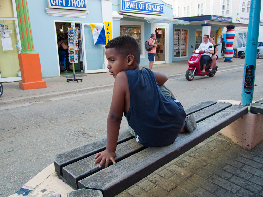 Je profite du temps qu’il me reste pour me balader dans Kralendijk, étrangement familière avec ses maisons de style hollandais mais peintes de couleurs pastels, selon la mode de Curaçao. Le temps semble être suspendu… Le rythme dans les autres îles était déjà très ralenti mais sur cette terre encore plus petite et chaude, il semble que j’ai adopté la vitesse de l’iguane au soleil. Seul les enfants à vélo (on doit être à l’heure de la sortie de l’école) Pendant que je me balade, un petit garçon s’approche de moi, tout sourire, mais un peu timide. Il a juste envie de parler et il ne sait pas si je vais vouloir lui répondre. Malgré la barrière de la langue, on arrive un peu à se comprendre, même si je ne suis pas sûre qu’il voit d’où je viens. La Belgique, c’est petit, mais loin, même si c’est à côté de la « mère patrie ». Alors on reste quelques minutes assis sur un banc, à partager quelques biscuits qu’il me reste. Avant qu’il ne reprenne son vélo, mon nouvel ami me fait signe qu’il veut que je le prenne en photo. Et le voilà en train de la pause ! Satisfait, il me serre la main et file le long de la rue principale.