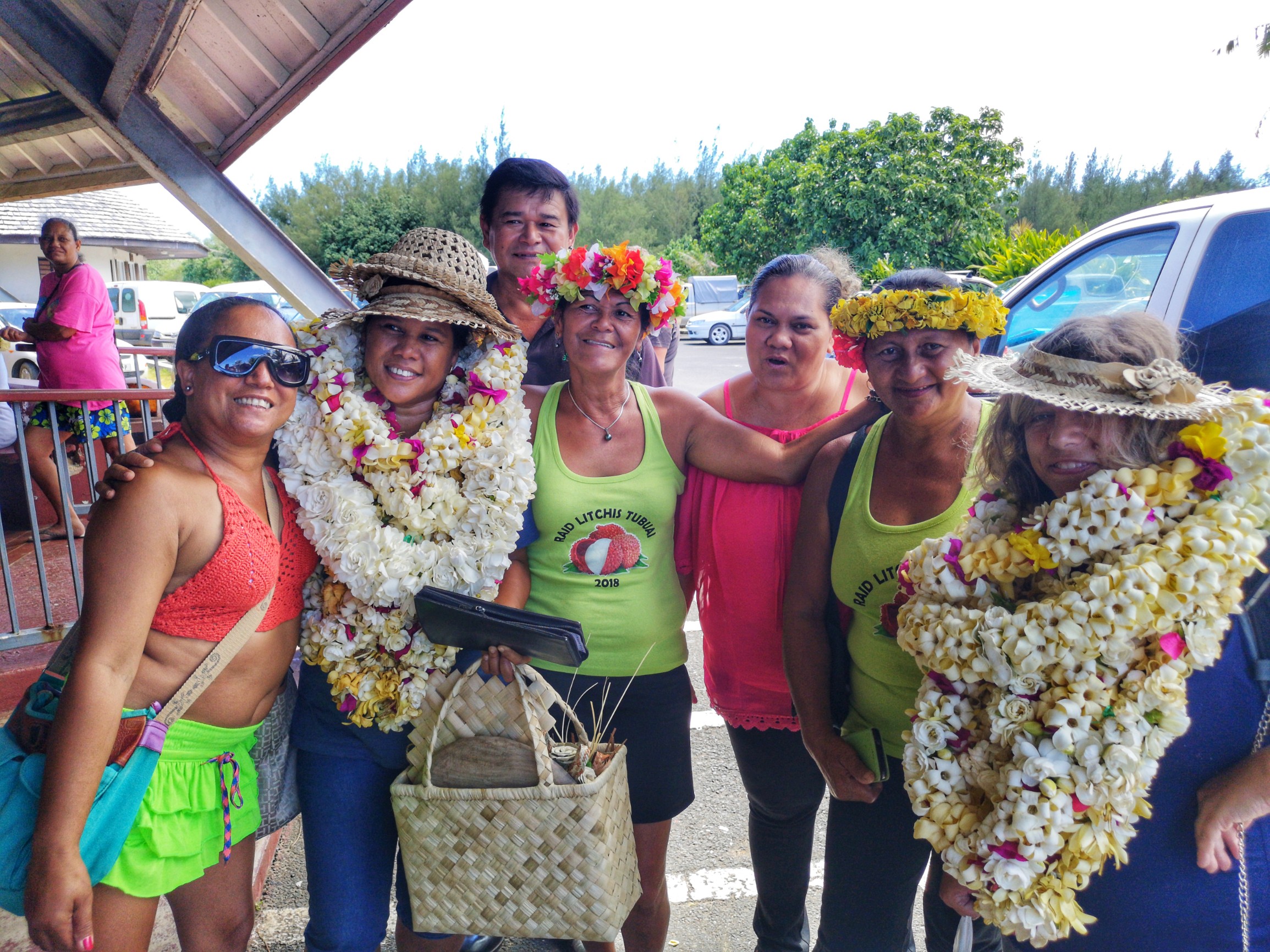 Depuis la fenêtre de la voiture, je bois le bleu du lagon. Qui sait quand je nagerai encore dans des eaux comme çà ? Bientôt, elles s’éloigneront et je les regarderai derrière un hublot… mais pour le moment, nous sommes embarqués chez Aurore, qui habite juste en face de l’aéroport. « Bienvenue au lounge » s’écrie-t-elle en riant. Nous ne sommes pas là depuis 5 minutes que les Hinano sont déjà sorties du frigo, Les dernières pour nous dire adieu. Au fur et à mesure, tous les gens que nous avons croisé cette semaine arrivent et très vite, nous voilà tous les trois enterré sous une masse de fleurs ! Car si normalement en Polynésie, on reçoit un collier de fleurs quand on arrive et un collier de coquillage quand on part, à Tubuai, on reçoit des fleurs qu’on appelle « couronnes » et au fur et à mesure des au revoir, je disparais littéralement sous les tiarés, tipaniers, gardénias et flamboyants. « Vous êtes plus couronnés que des ministres » dit un employé de l’aéroport en riant. Je me sens littéralement fondre de tendresse sous la masse de fleurs pour ceux que je vais quitter. Qui sait si je les reverrais ? Aurore, qui se moquait bien de mon super masque de plongée qui couvrait tout mon visage, jusqu’à ce qu’elle le teste, a fini par en hériter. Le dernier à recevoir mes bisous est Rodrigue, qui m’a ouvert la porte de sa maison sans même me connaître. Grâce à lui et à Here, Tubuai aura été une expérience hors du commun dans ce voyage en Polynésie. Car si je n’ai pas vu grand chose de l’île, j’ai vécu une autre sorte d’aventure, une aventure humaine qui est tout autant, sinon plus, précieuse. En tout cas, unique. Ma consolation pendant que je regarde Tubuai s’éloigner, c’est que dans quelques heures à Tahiti, je retrouverai des visages amis.