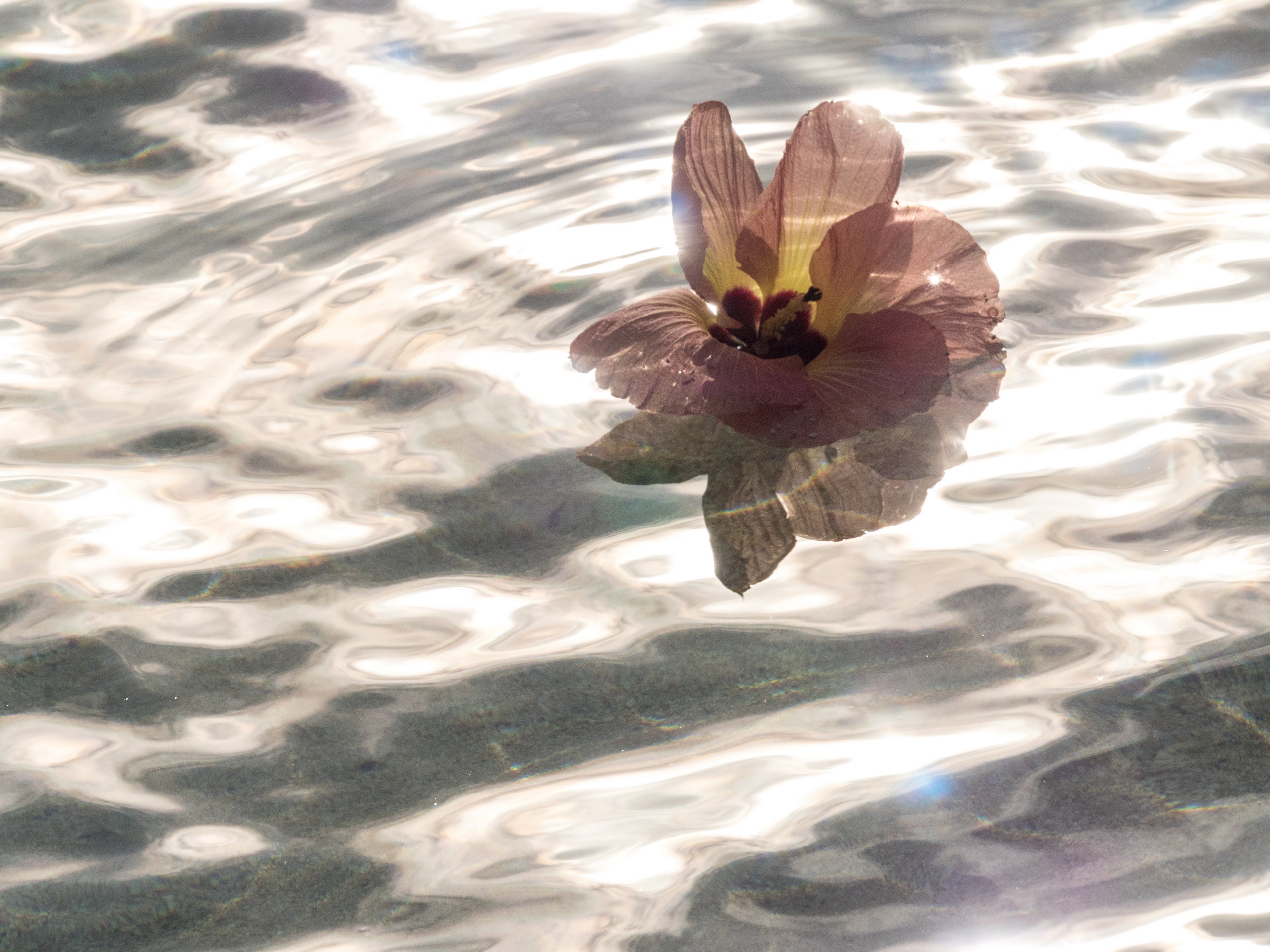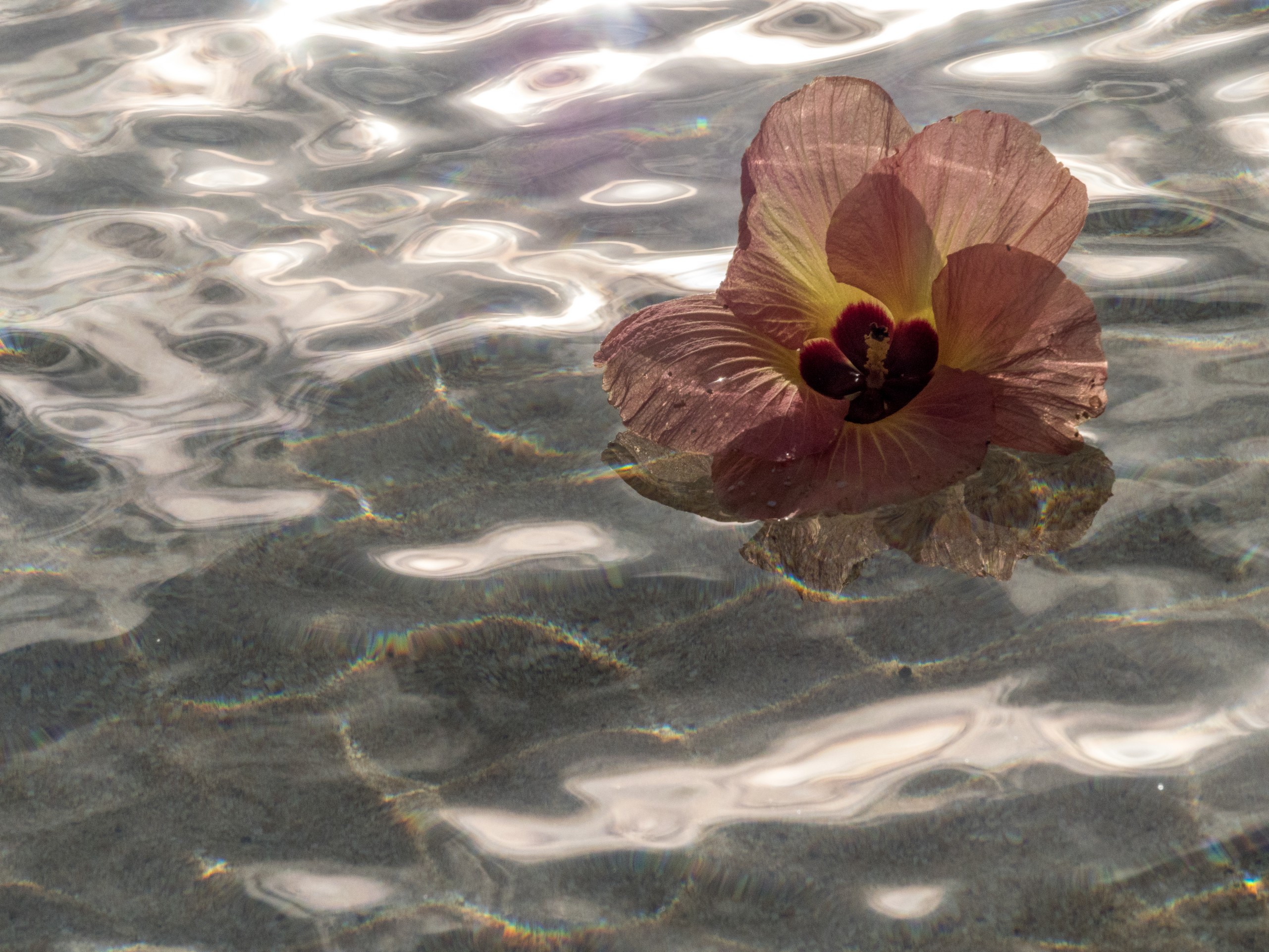 L’air est doux, l’eau est tiède, la fin de l’après-midi descend sur la plage… On est bien ! J’ai sorti mon masque pour aller faire coucou aux poissons qui se cachent dans quelques rochers. Noho et moi, on papote, pas beaucoup, pas longtemps, « Moana », l’océan en polynésien, ayant le pouvoir d’ôter la parole aux Humains, irrésistiblement. Elle aussi resterait bien ici, où la vie est plus calme qu’à Tahiti (combien de fois ne l’ai-je pas entendu en Polynésie… des Tahitiens en quête de tranquillité, venus s’installer vers d’autres îles. Quand je pense au choc violent qui m’attend dans quelques jours quand je serai de retour à Bruxelles, où je vais débarquer aux portes de l’hiver, j’en ai des frissons ! J’essaie de chasser cette idée, de profiter de l’instant présent, de me délecter de flotter dans l’eau de ce lagon du bout du monde, d’admirer les couleurs et les formes des poissons, de m’émerveiller devant les paillettes que jette le ciel sur l’eau, de suivre rêveusement des yeux une fleur d’hibiscus qui flotte vers d’autres rivages. Pendant quelques secondes, je suis dans le présent.