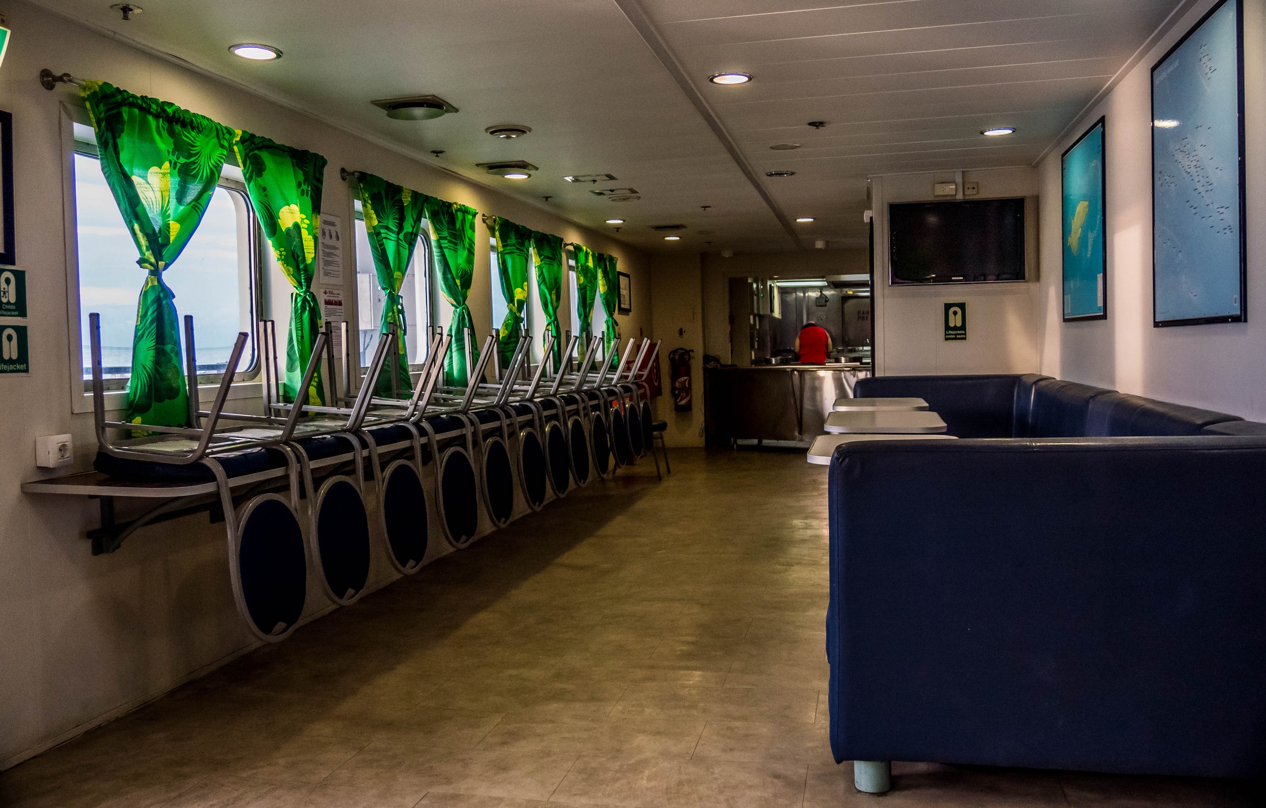 Ma première réaction ? C’est de me demander dans quoi je me suis embarquée. Le confort ? Sommaire. Un matelas dans un dortoir couchette. A l’aller, nous ne serons pas nombreux mais au retour, les écoliers rentrent de vacances et là, ça va faire mal. J’essaie de ne pas y penser. La salle à manger ? Spartiate mais ouvert0e sur l’océan. La cuisine du bateau ? On verra demain de quoi le cuistot est capable mais je sais que le petit-déjeuner sera au plus tard à 6 heures. Parce que l’avenir appartient à ceux qui se lèvent tôt, comme les marins du bord.