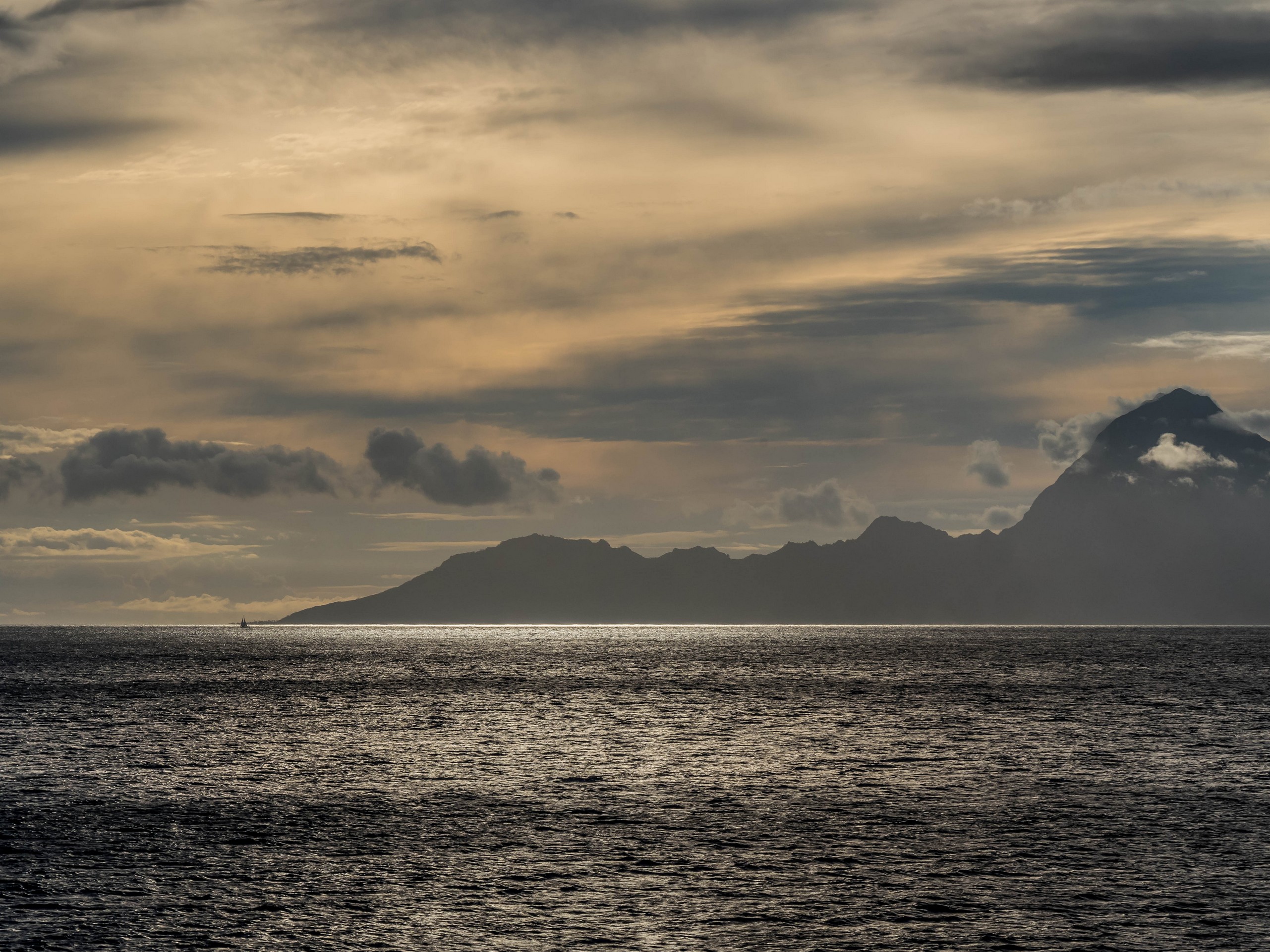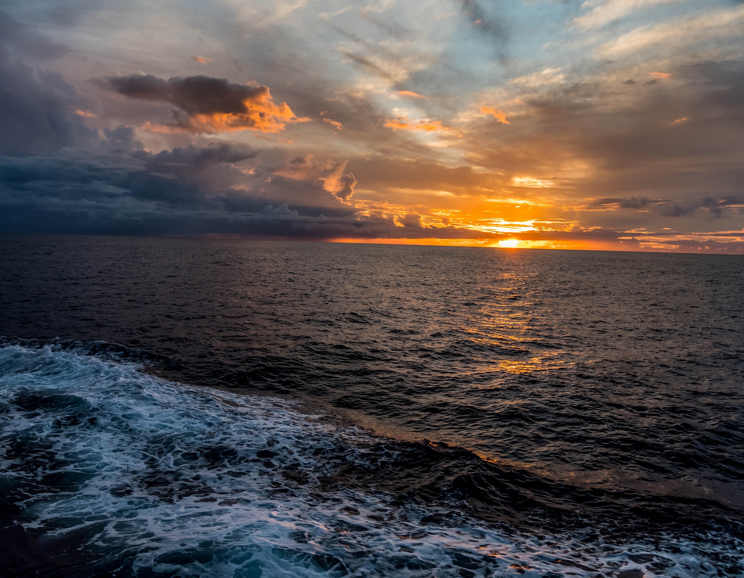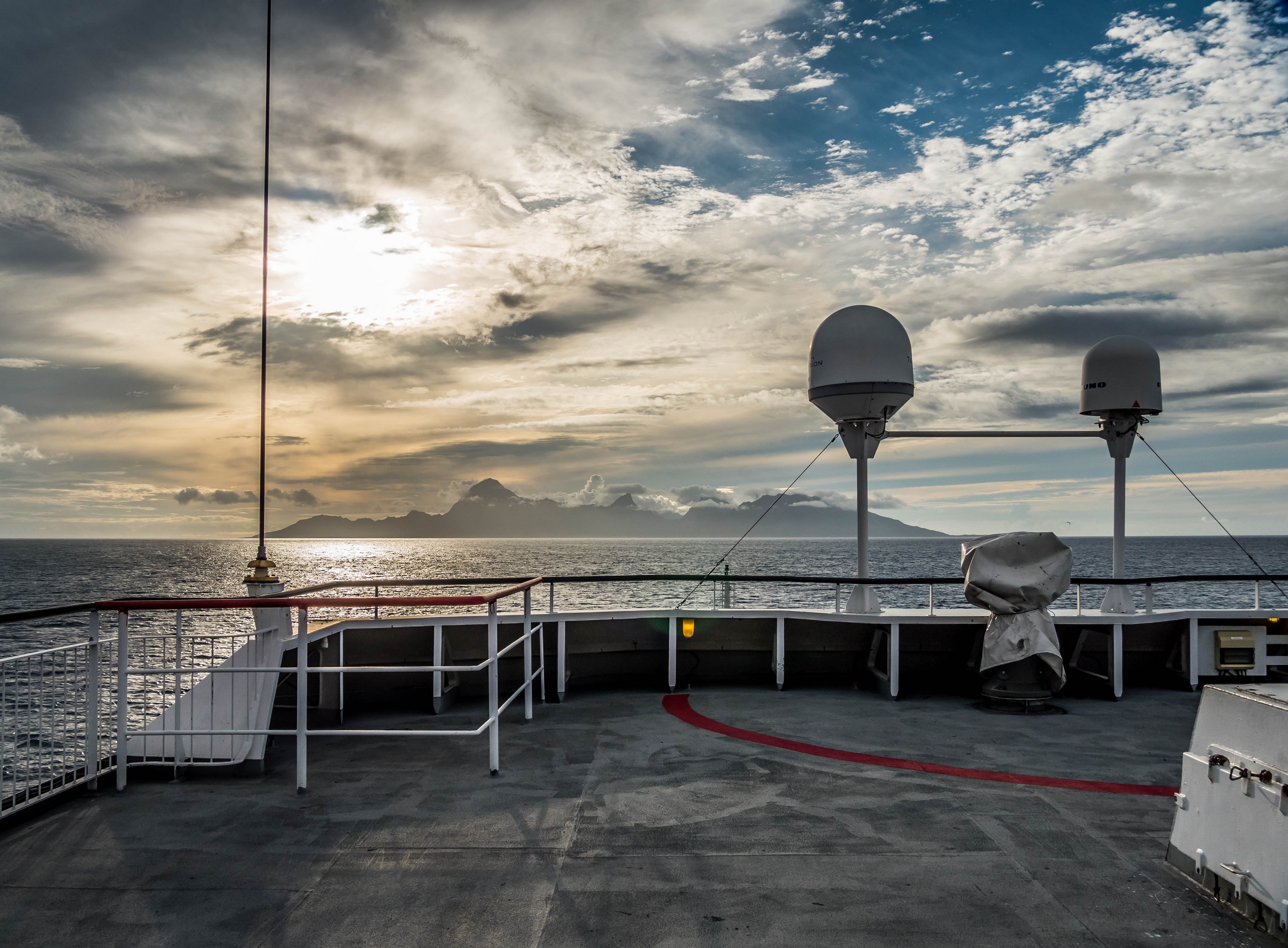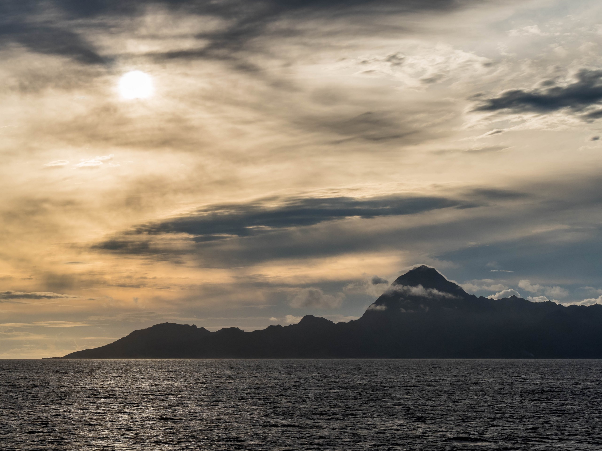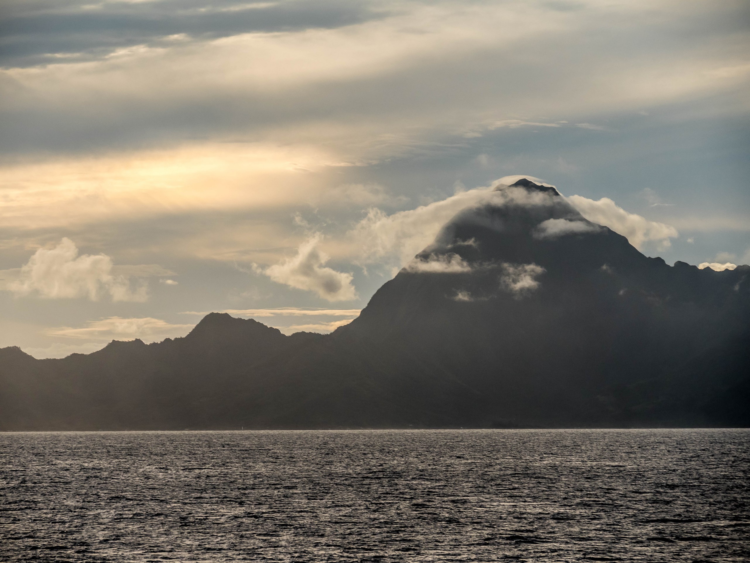 Le temps que le soleil se couche, nous laissons derrière nous Tahiti et Moorea et quittons les eaux calmes entre leurs deux lagons. La houle se fait plus forte et bientôt, il n’y aura plus qu’un océan d’un noir d’encre pour tous nous engloutir jusque demain.