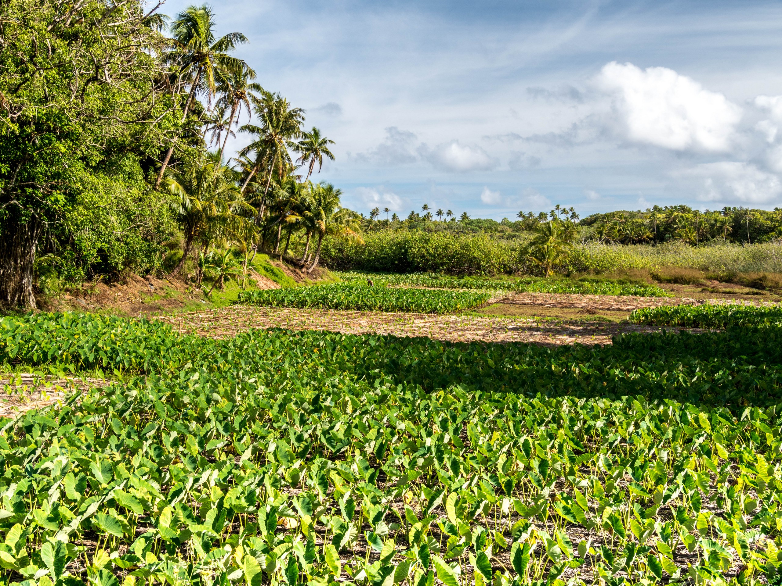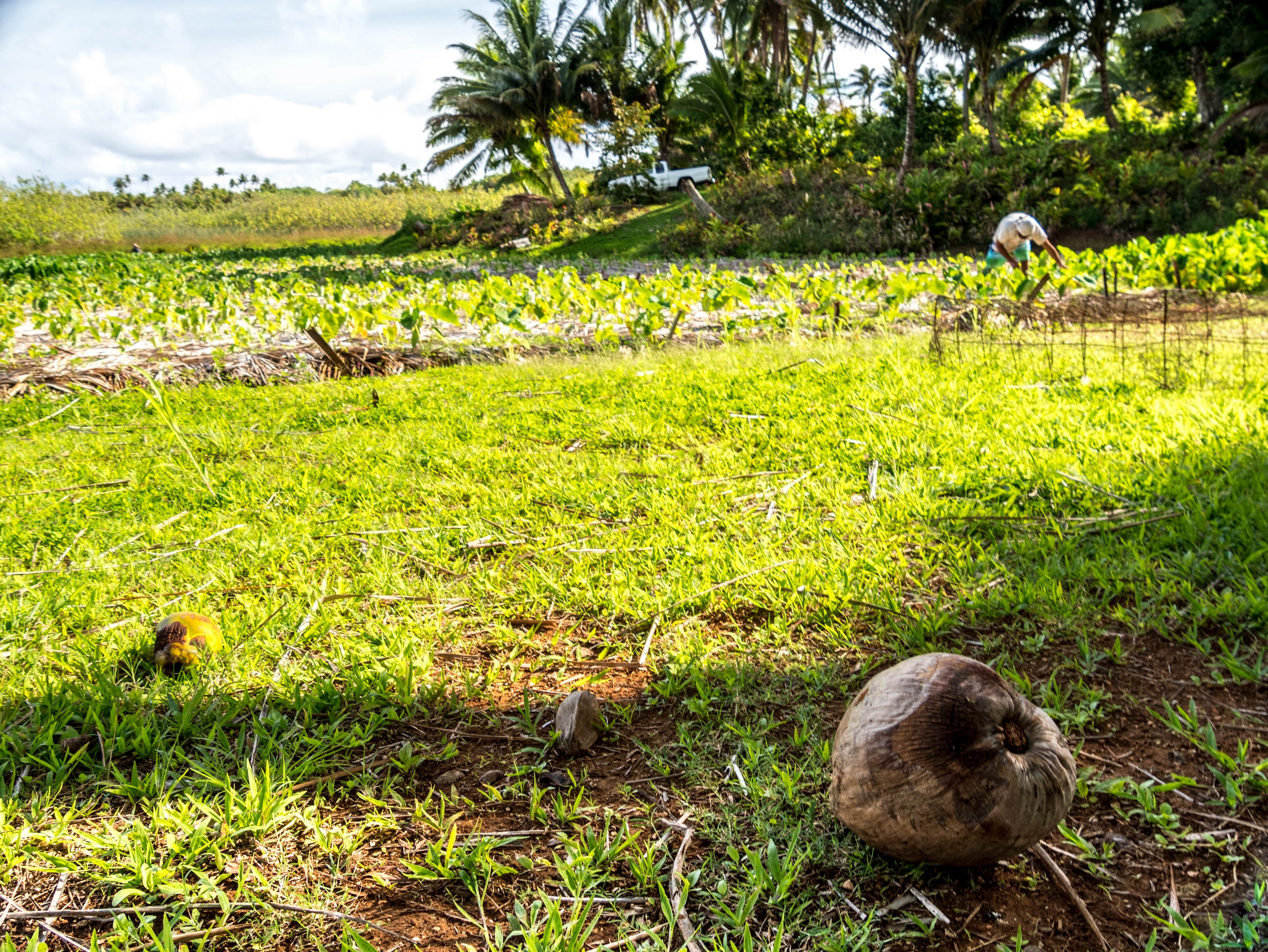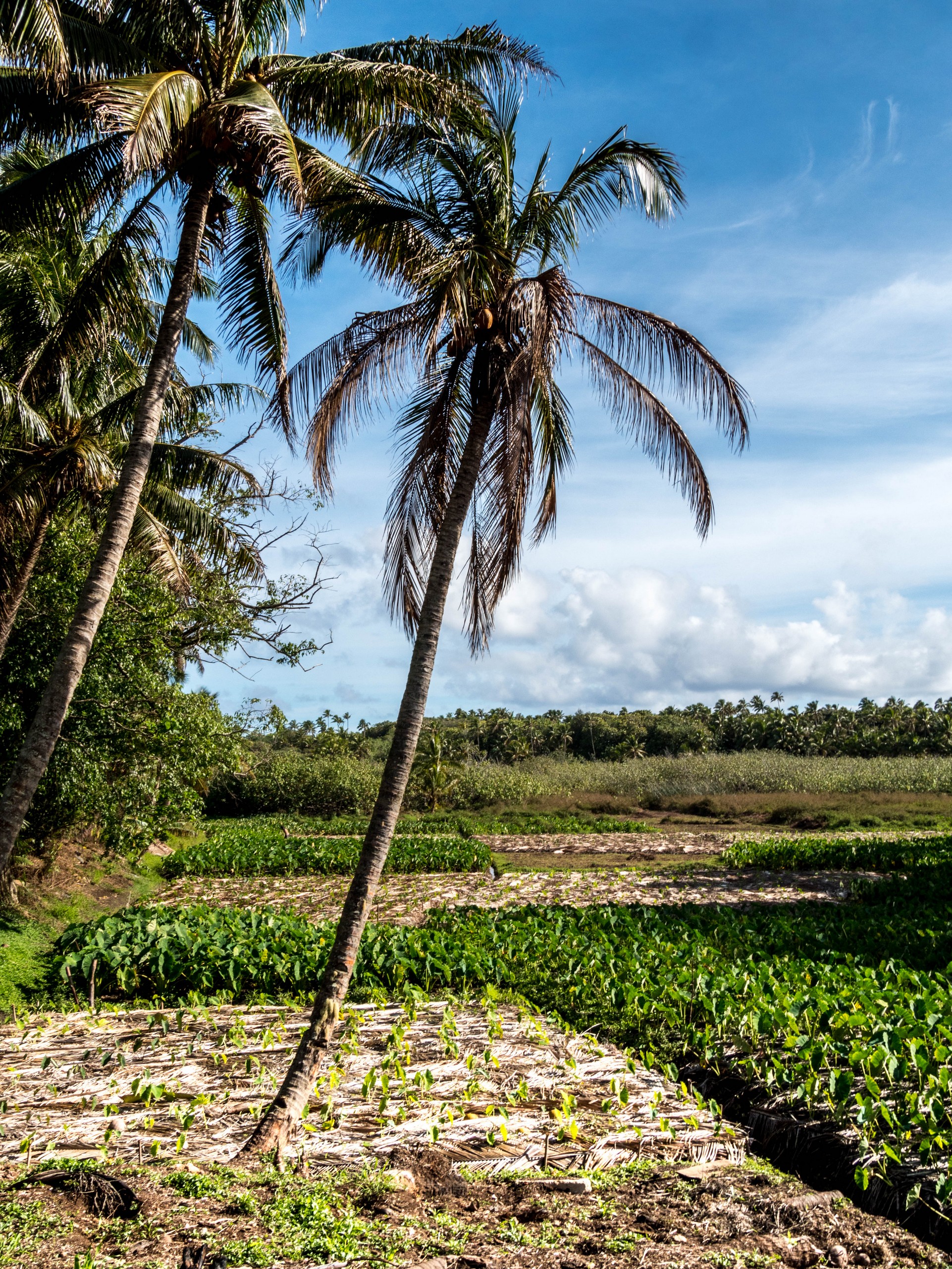 La première impression de Rimatara, celle d’une grande douceur, se vérifie. En passant par la « capitale » (il y a 3 villages), on croise de jolies maisons coquettes et fleuries et pas une maison qui n’a pas son buisson de tiare Tahiti, la fleur qui parfume le monoï. Rémi n’hésite pas d’ailleurs en nous en cueillir pour chacune. L’intérieur de l’île est verdoyant, rempli d’arbres fruitiers comme le pamplemoussier, le citronnier, le papayer, le noni ou le litchi. On y trouve aussi énormément de bananiers, de cocotiers et bien sûr, le tubercule roi des Australes : le taro, cultivé dans des tarodières, de grands espaces bien dégagés où la partie aérienne du taro offre des rangées toutes vertes sur fond de fleurs et de cocotiers. D’ailleurs, nous allons monter sur le point culminant de l’île (80 mètres, easy game) à la récolte de quelques pamplemousses qui restent après la saison. Les arbres sont déjà prêts pour la production suivante, certains sont déjà remplis de boutons de grosses fleurs et odorantes. Un peu plus loin, nous allons nous arrêter pour récolter quelques piments. C’est cette exubérance et l’abondance de la nature qui me fait toujours chaud au cœur quand je suis sous les tropiques. Un rien pousse en moins de temps qu’il ne faut pour le dire !