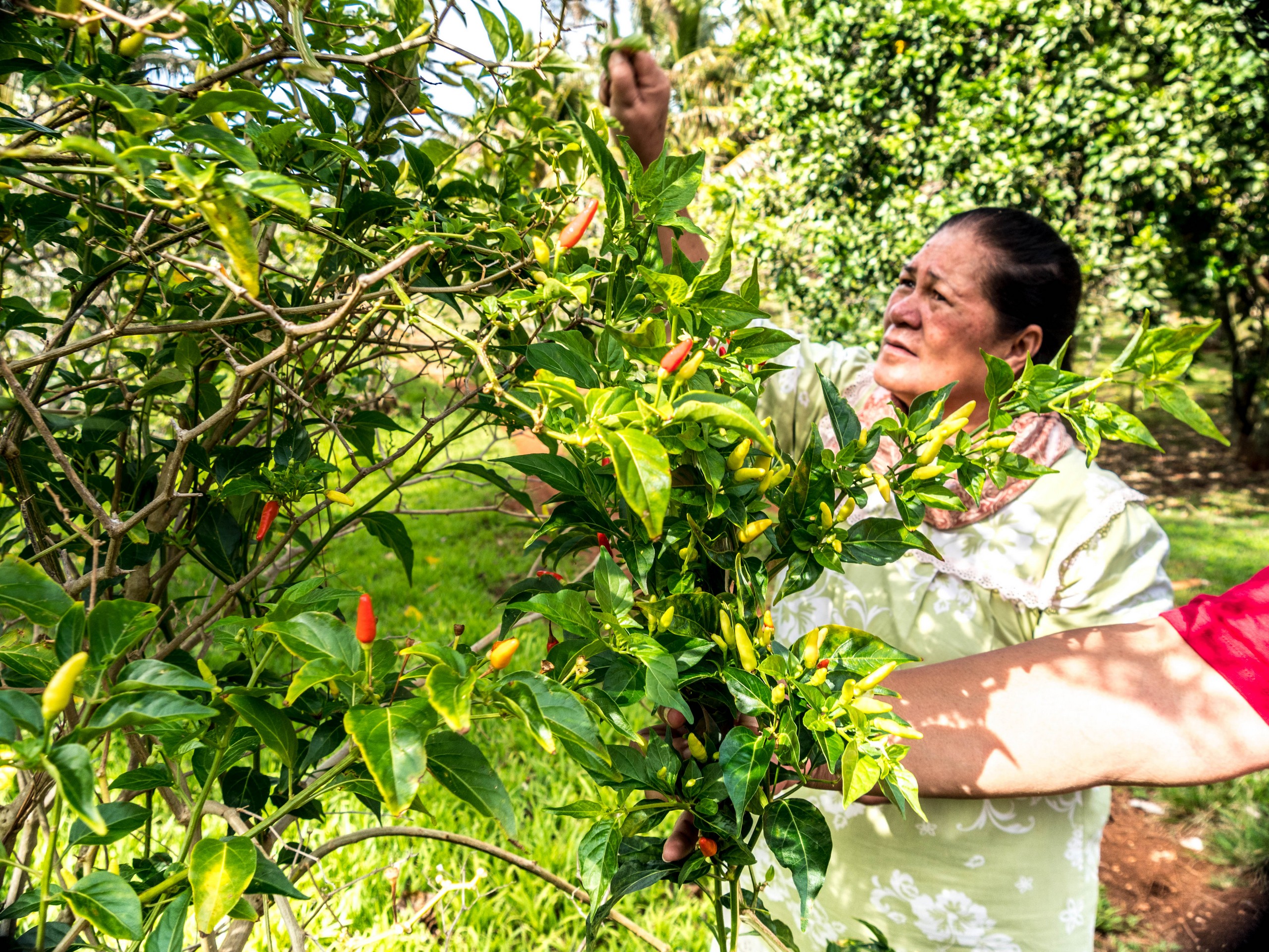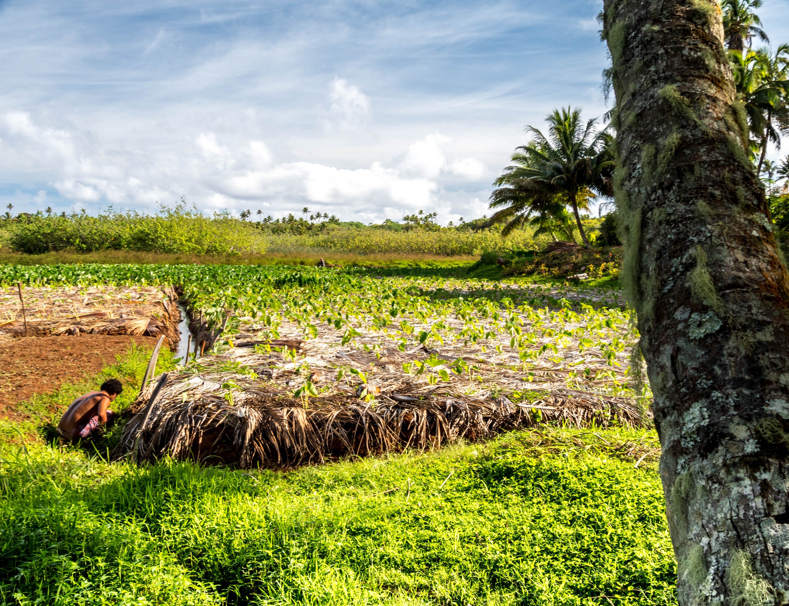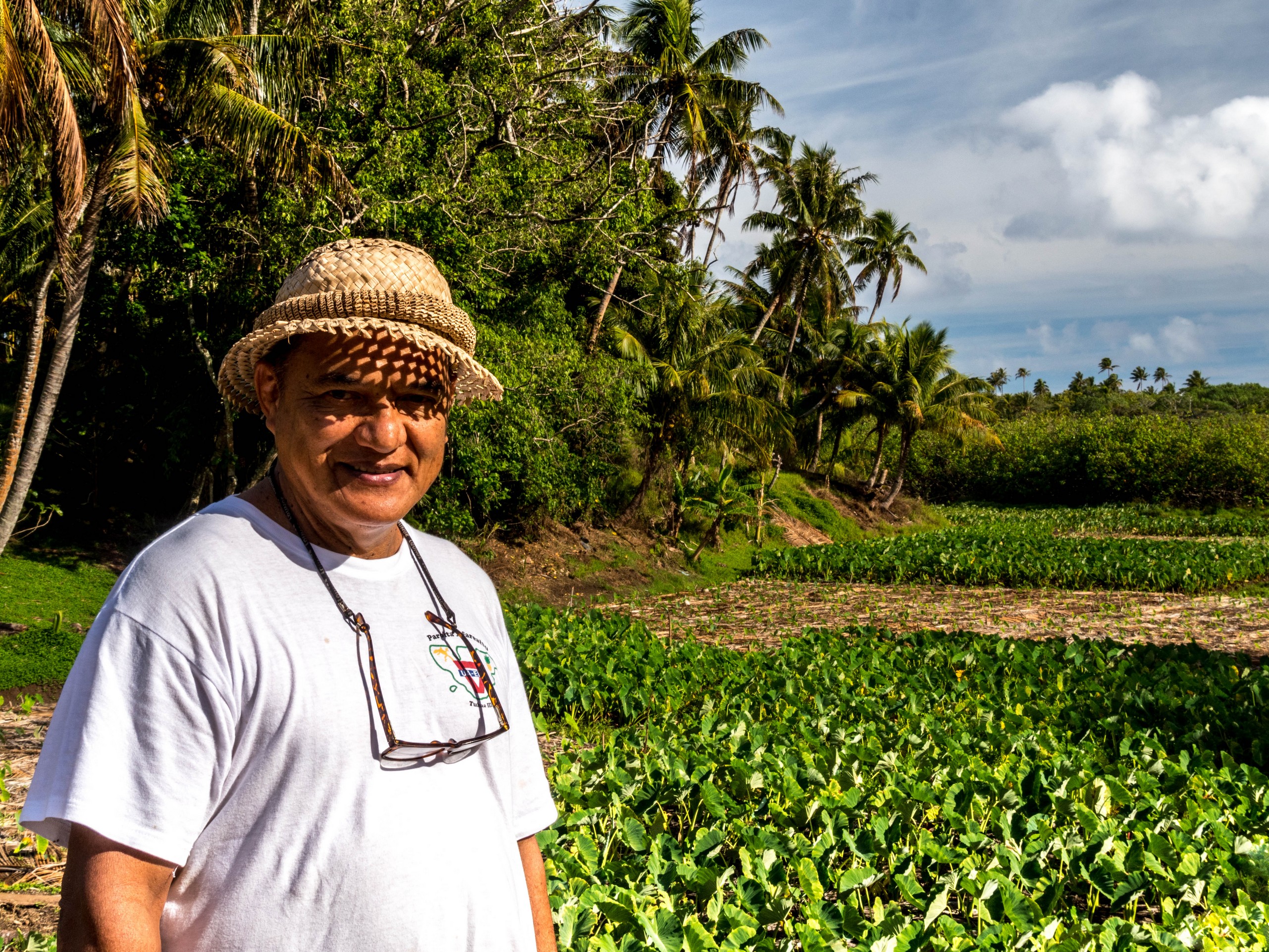 La première impression de Rimatara, celle d’une grande douceur, se vérifie. En passant par la « capitale » (il y a 3 villages), on croise de jolies maisons coquettes et fleuries et pas une maison qui n’a pas son buisson de tiare Tahiti, la fleur qui parfume le monoï. Rémi n’hésite pas d’ailleurs en nous en cueillir pour chacune. L’intérieur de l’île est verdoyant, rempli d’arbres fruitiers comme le pamplemoussier, le citronnier, le papayer, le noni ou le litchi. On y trouve aussi énormément de bananiers, de cocotiers et bien sûr, le tubercule roi des Australes : le taro, cultivé dans des tarodières, de grands espaces bien dégagés où la partie aérienne du taro offre des rangées toutes vertes sur fond de fleurs et de cocotiers. D’ailleurs, nous allons monter sur le point culminant de l’île (80 mètres, easy game) à la récolte de quelques pamplemousses qui restent après la saison. Les arbres sont déjà prêts pour la production suivante, certains sont déjà remplis de boutons de grosses fleurs et odorantes. Un peu plus loin, nous allons nous arrêter pour récolter quelques piments. C’est cette exubérance et l’abondance de la nature qui me fait toujours chaud au cœur quand je suis sous les tropiques. Un rien pousse en moins de temps qu’il ne faut pour le dire !