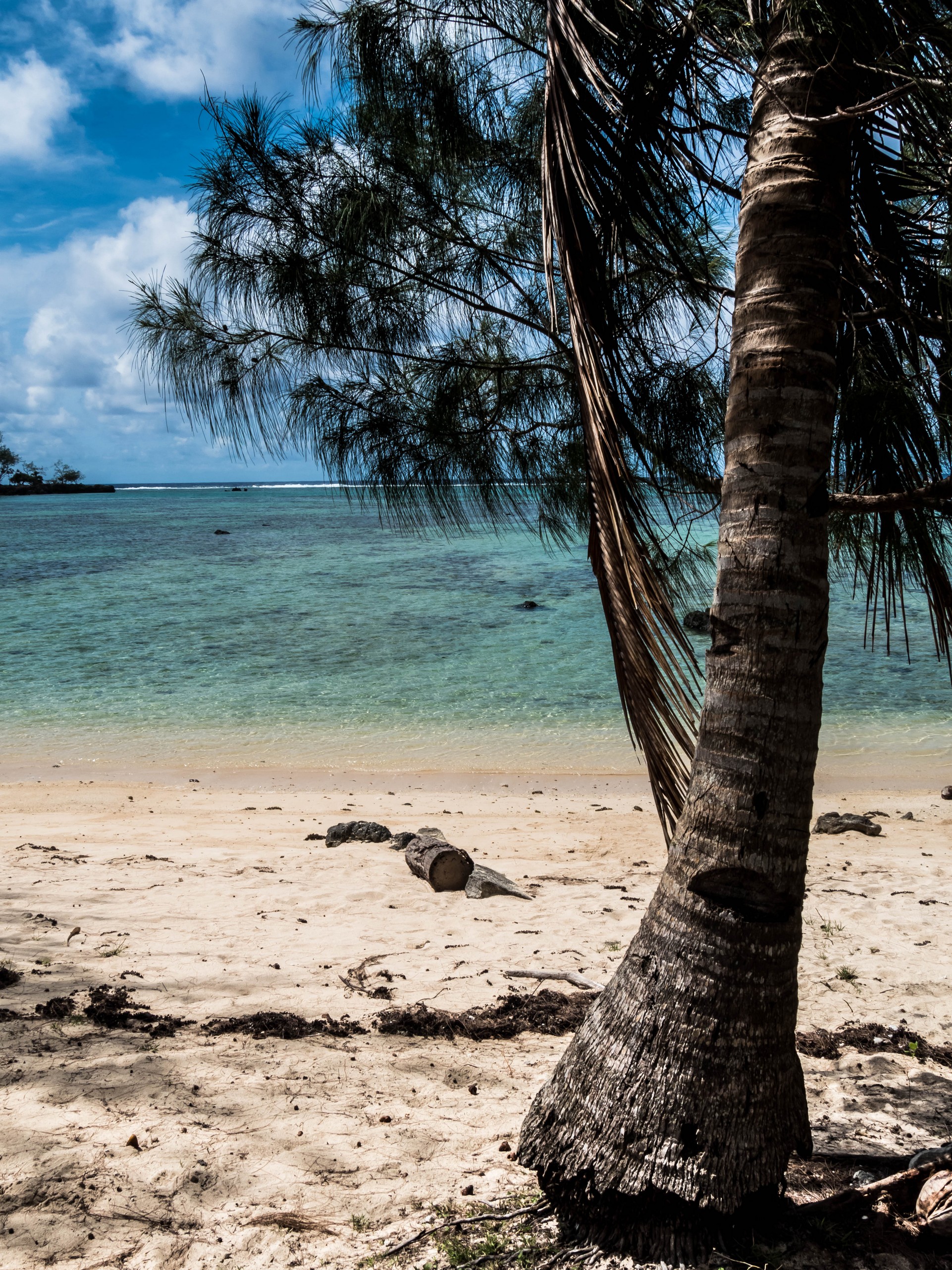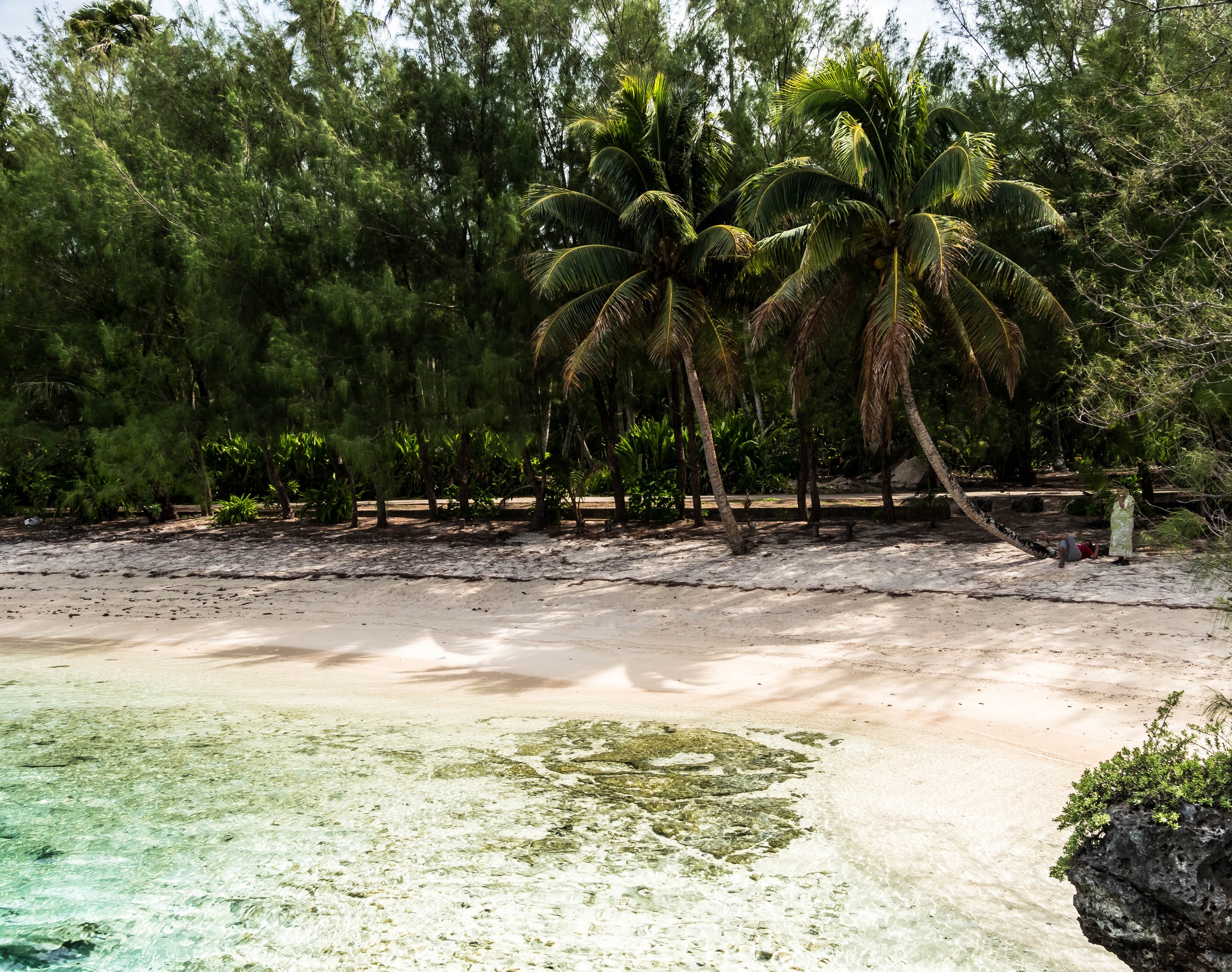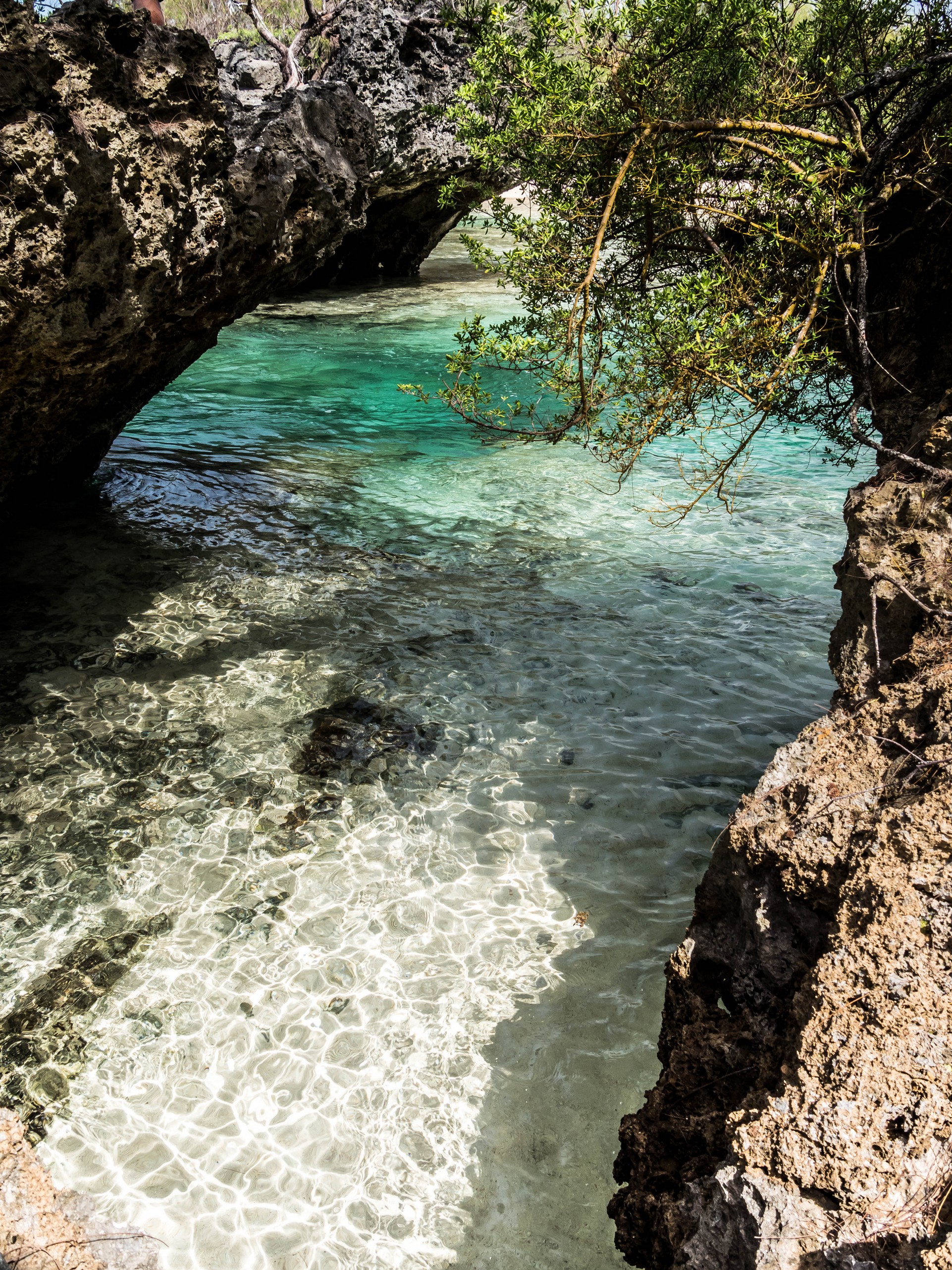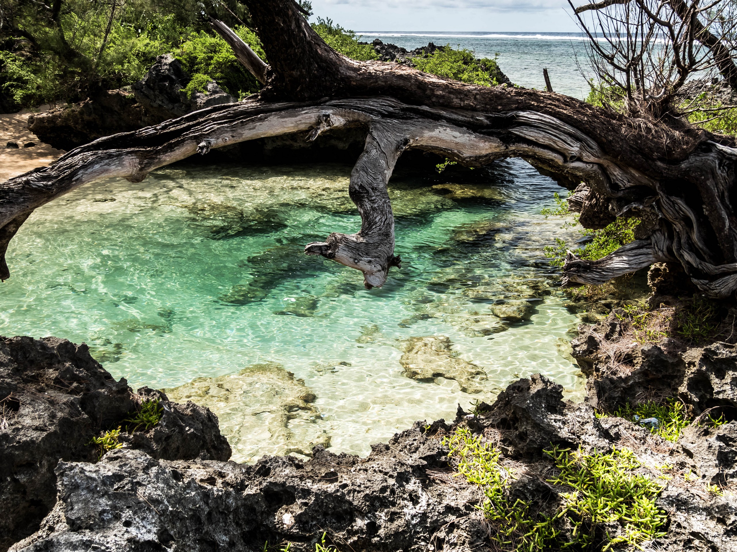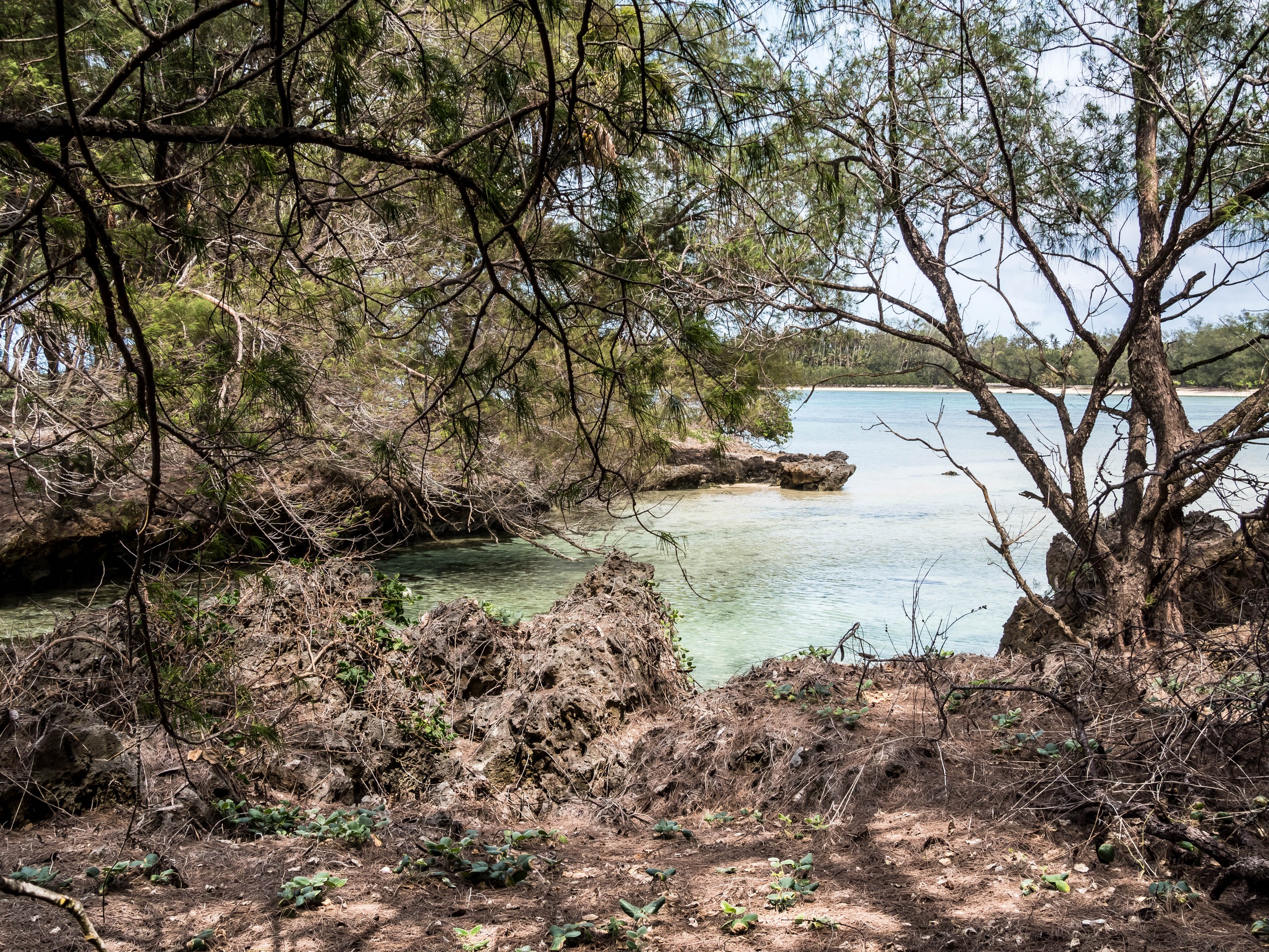 Rémi nous emmène ensuite vers la plus belle plage de l’île : la Baie des Vierges, Elle ressemble vraiment beaucoup à des calanques. C’est une suite de jolies criques, bien abritées, aux eaux turquoises, au sable blanc, avec des cocotiers et pins pour faire de l’ombre… Un endroit de rêve ! Et pas un chat, sauf nous ! D’étranges formations coralliennes créent une espèce de piscine, le Bain des Vierges, qui a donné son nom à la plage.