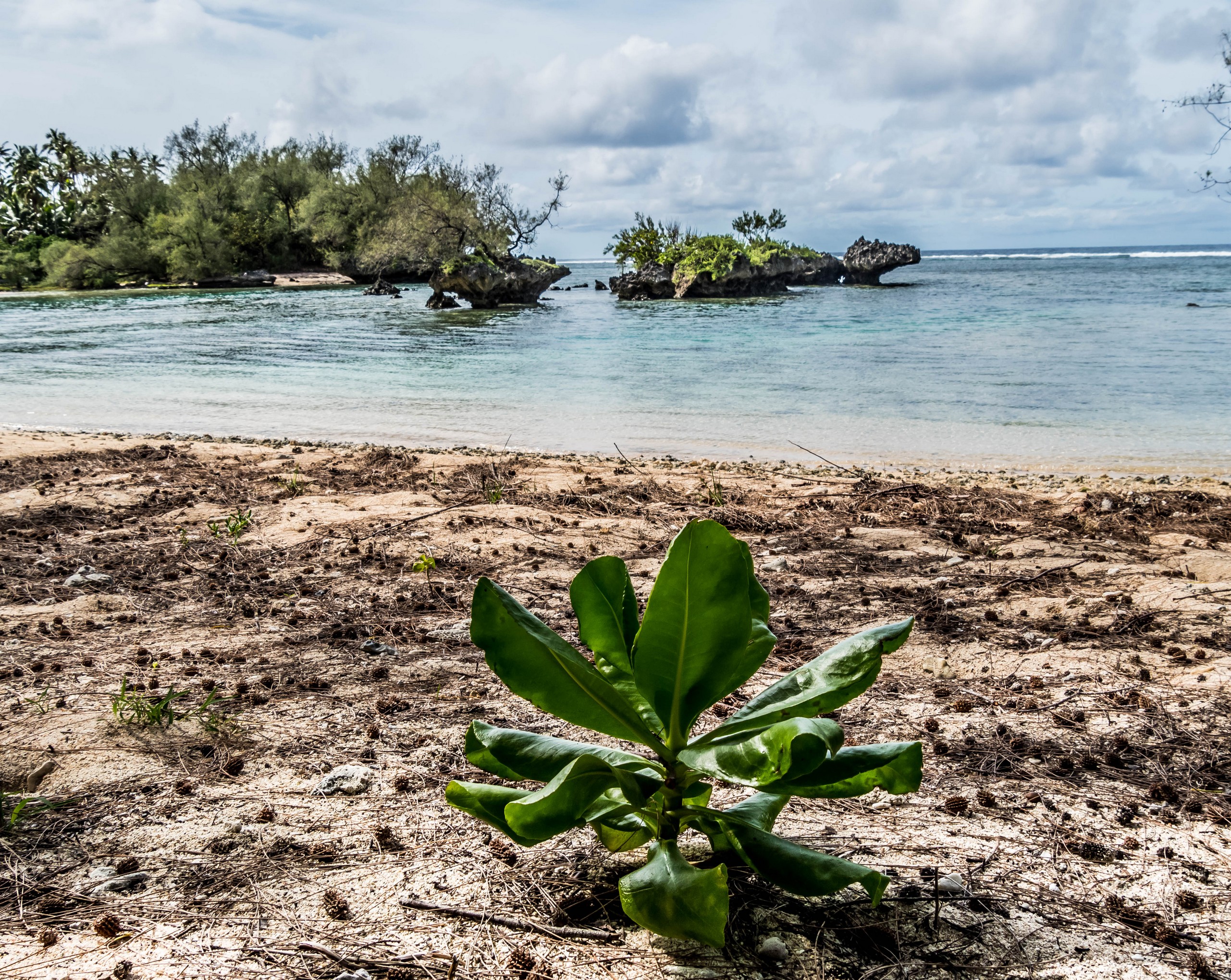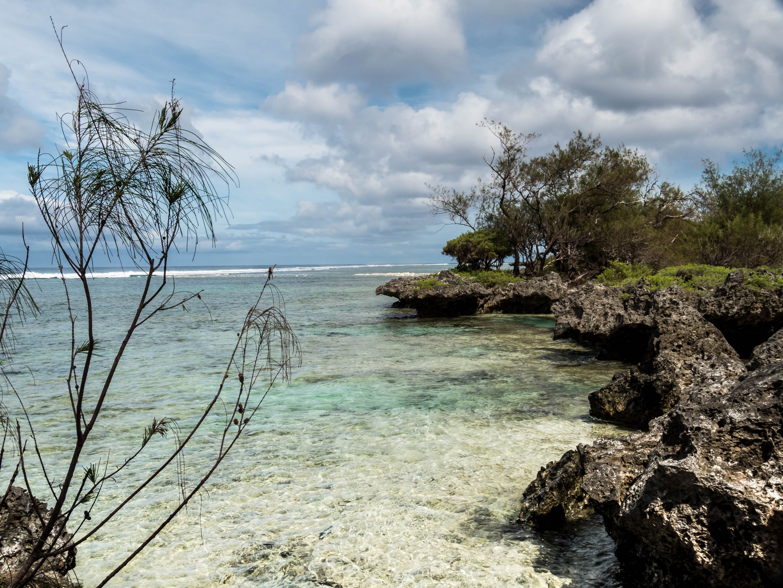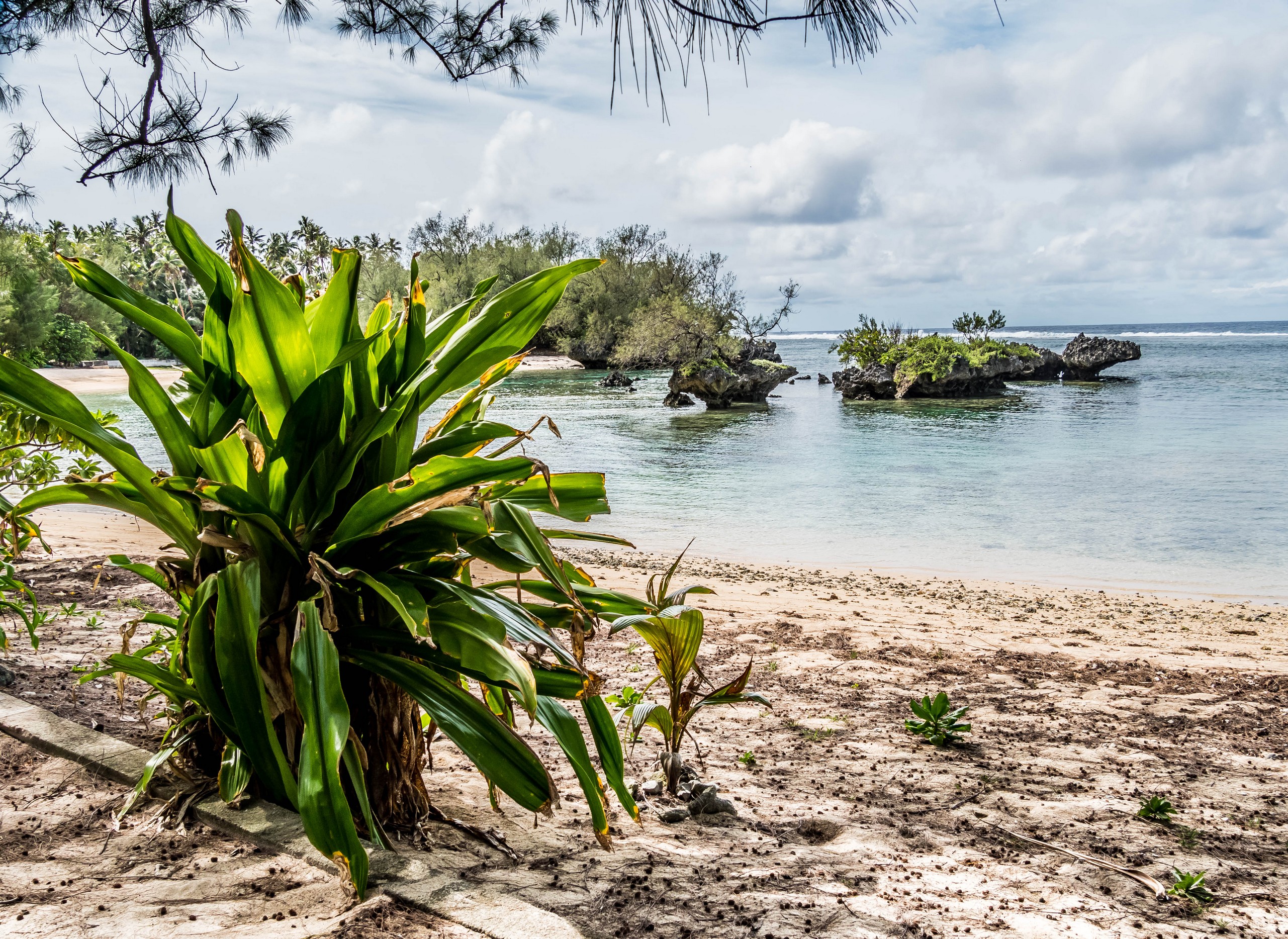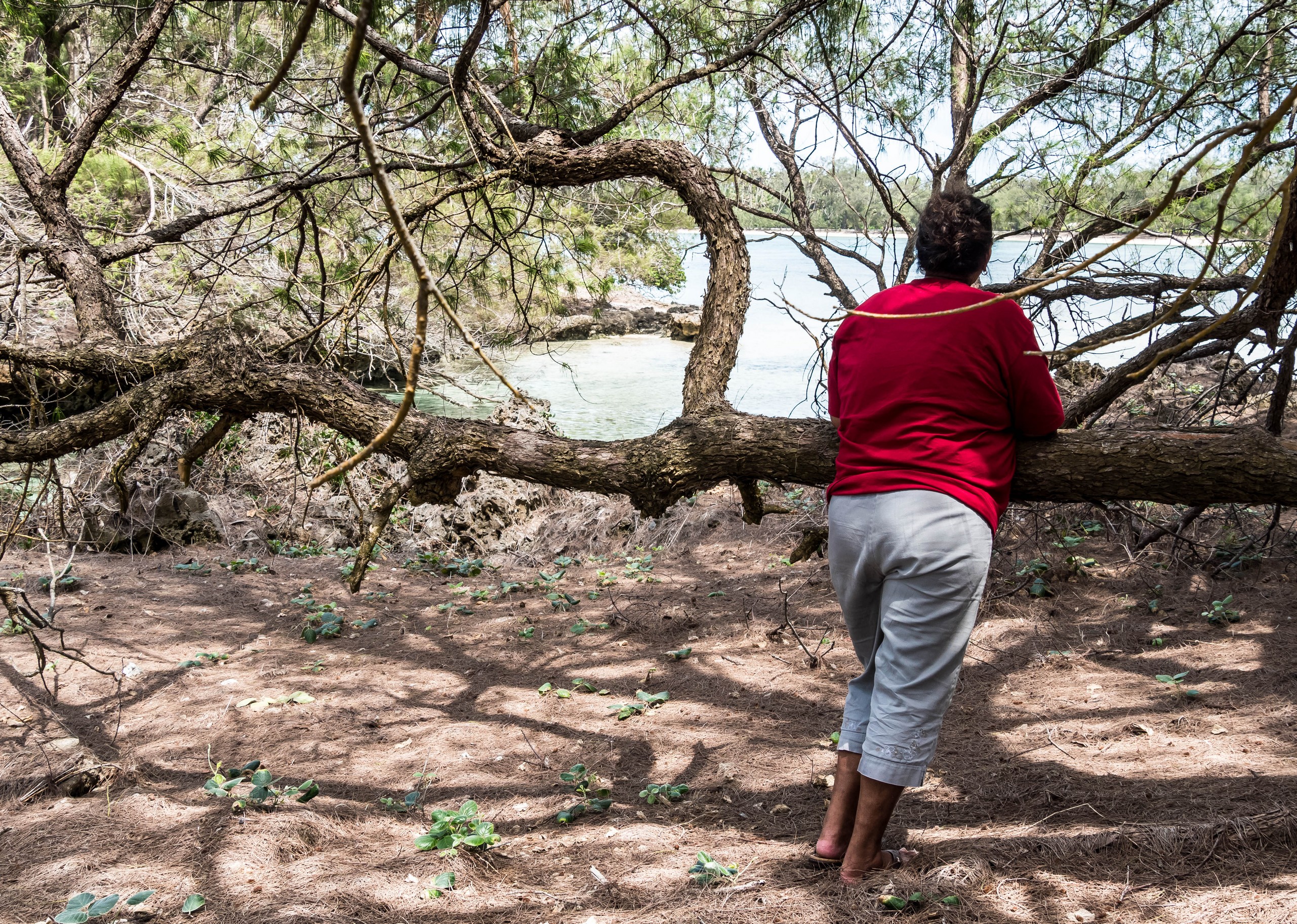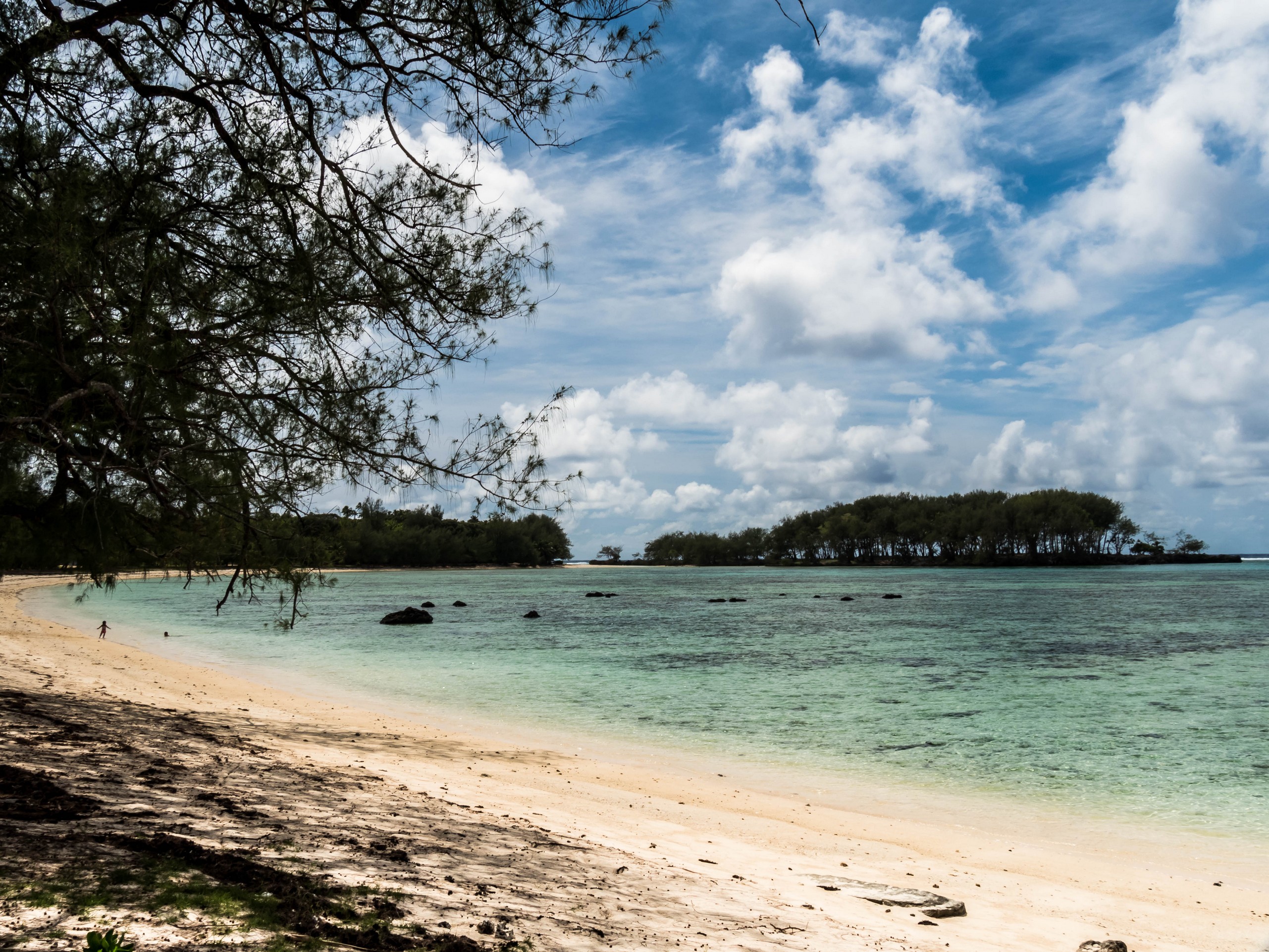 Rémi nous emmène ensuite vers la plus belle plage de l’île : la Baie des Vierges, Elle ressemble vraiment beaucoup à des calanques. C’est une suite de jolies criques, bien abritées, aux eaux turquoises, au sable blanc, avec des cocotiers et pins pour faire de l’ombre… Un endroit de rêve ! Et pas un chat, sauf nous ! D’étranges formations coralliennes créent une espèce de piscine, le Bain des Vierges, qui a donné son nom à la plage.