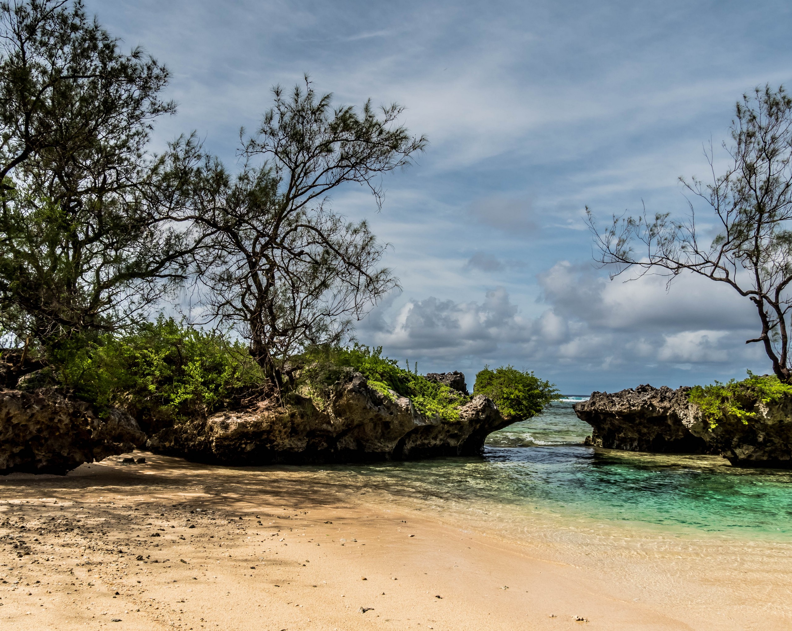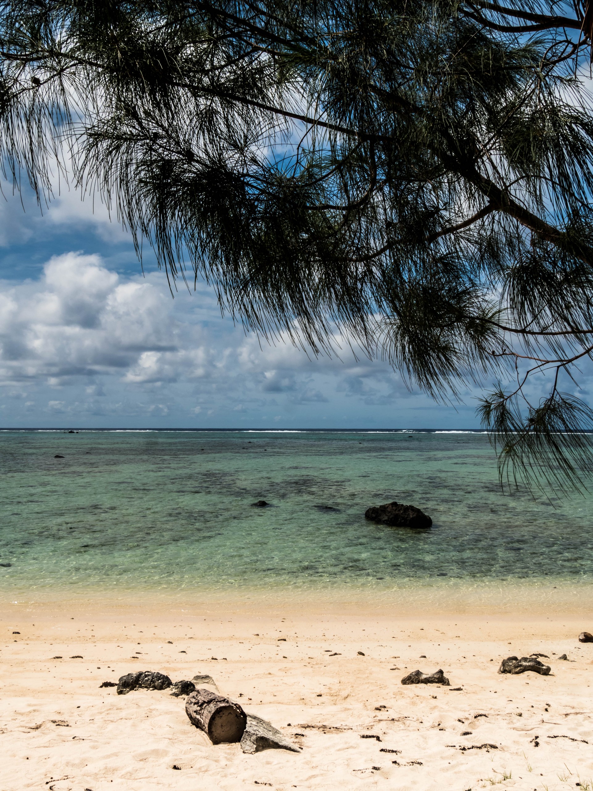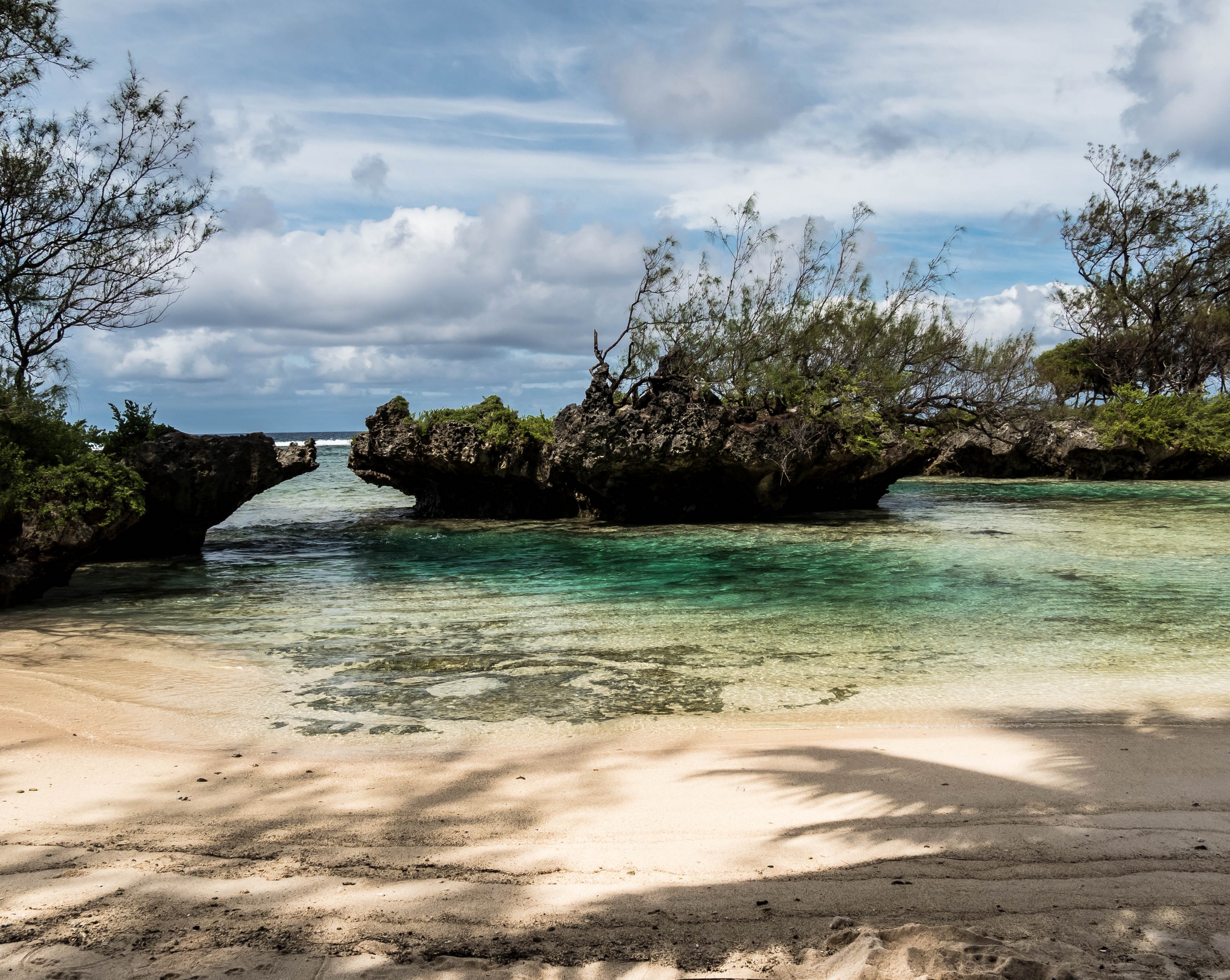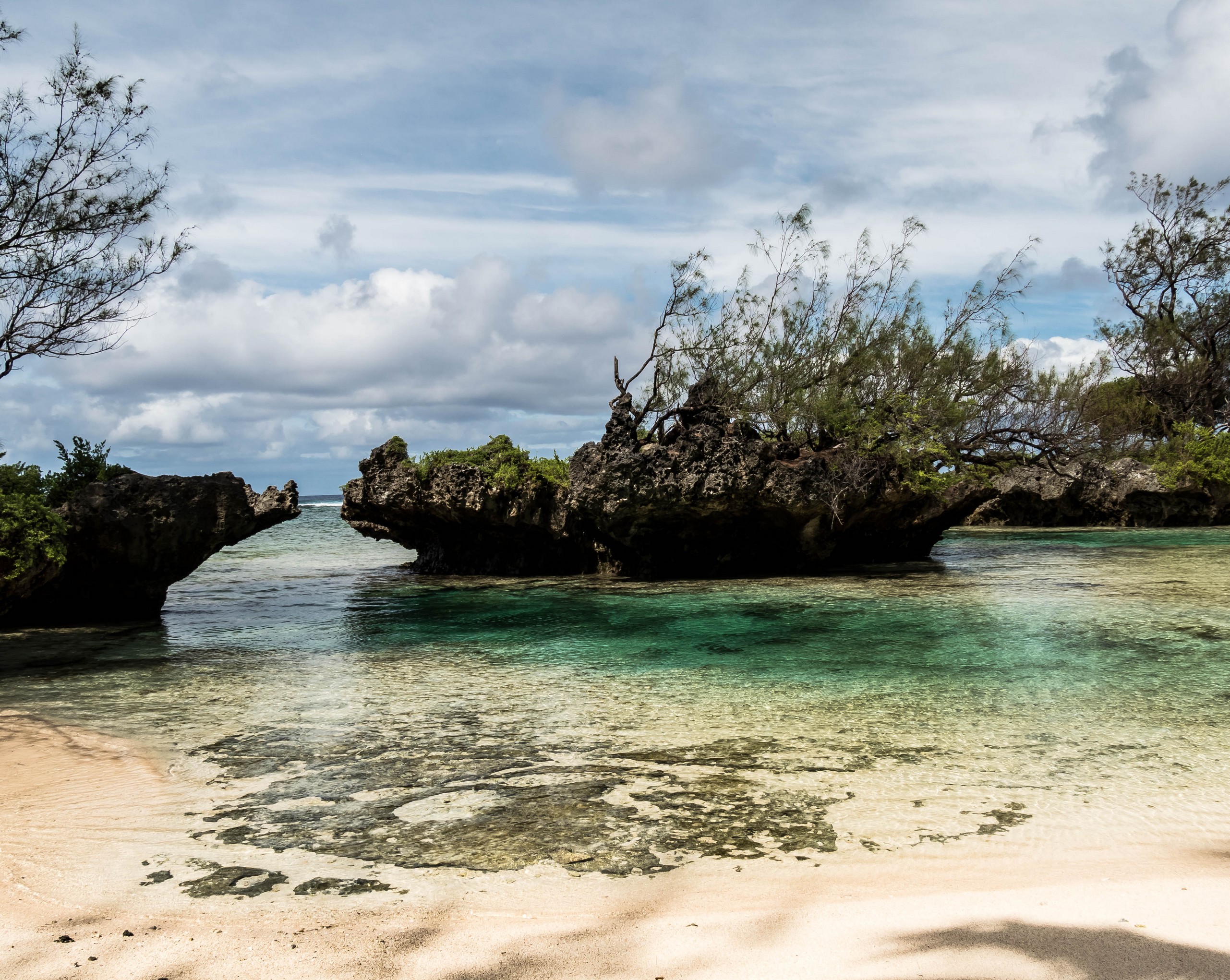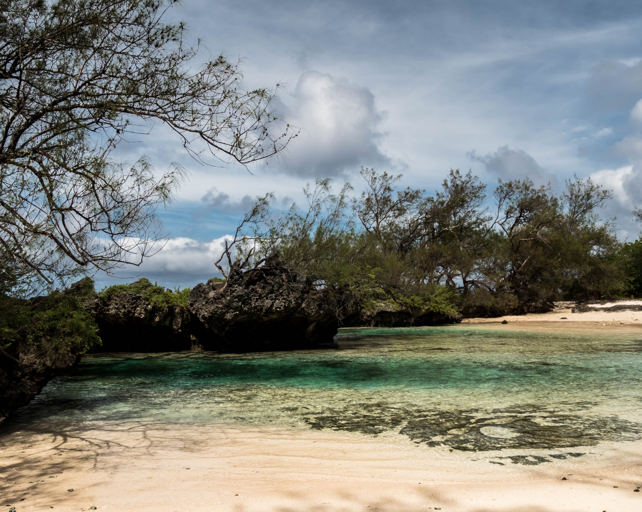 Rémi nous emmène ensuite vers la plus belle plage de l’île : la Baie des Vierges, Elle ressemble vraiment beaucoup à des calanques. C’est une suite de jolies criques, bien abritées, aux eaux turquoises, au sable blanc, avec des cocotiers et pins pour faire de l’ombre… Un endroit de rêve ! Et pas un chat, sauf nous ! D’étranges formations coralliennes créent une espèce de piscine, le Bain des Vierges, qui a donné son nom à la plage.
