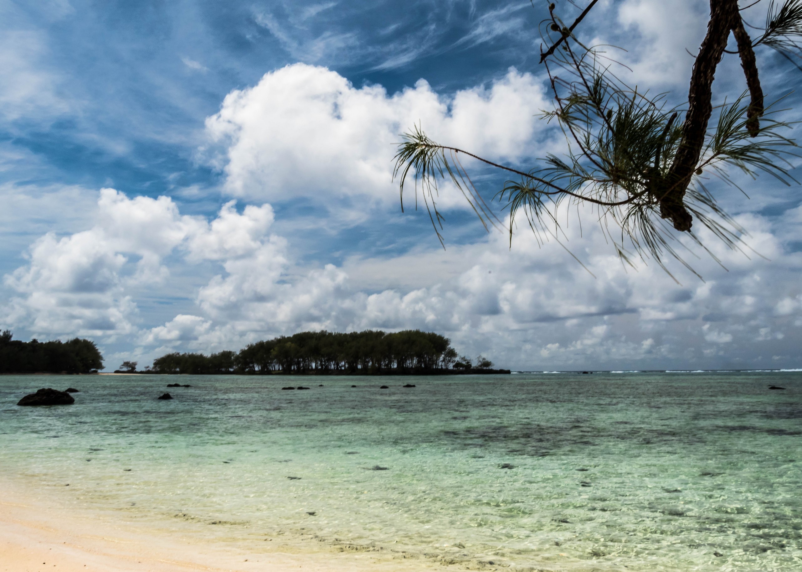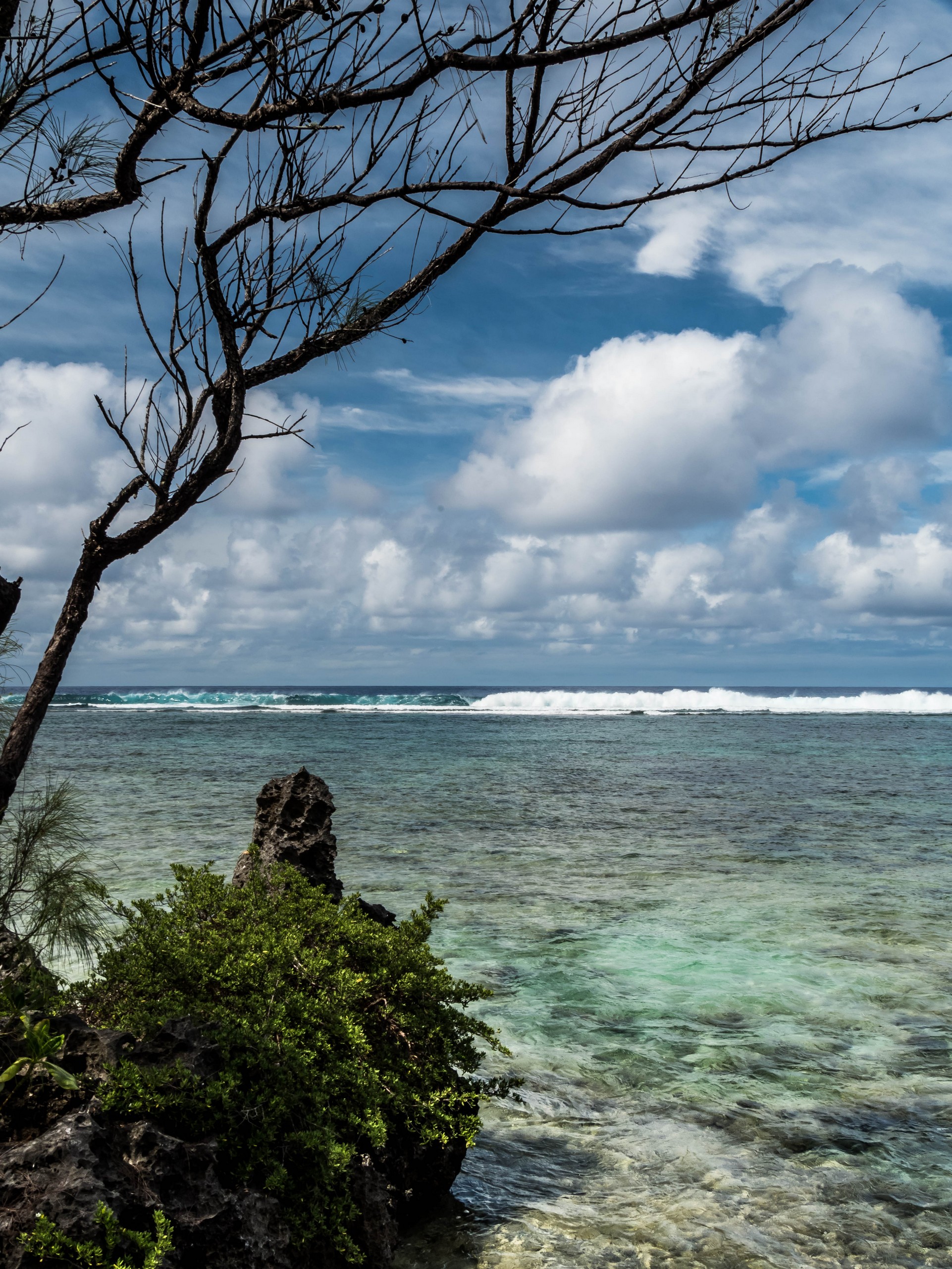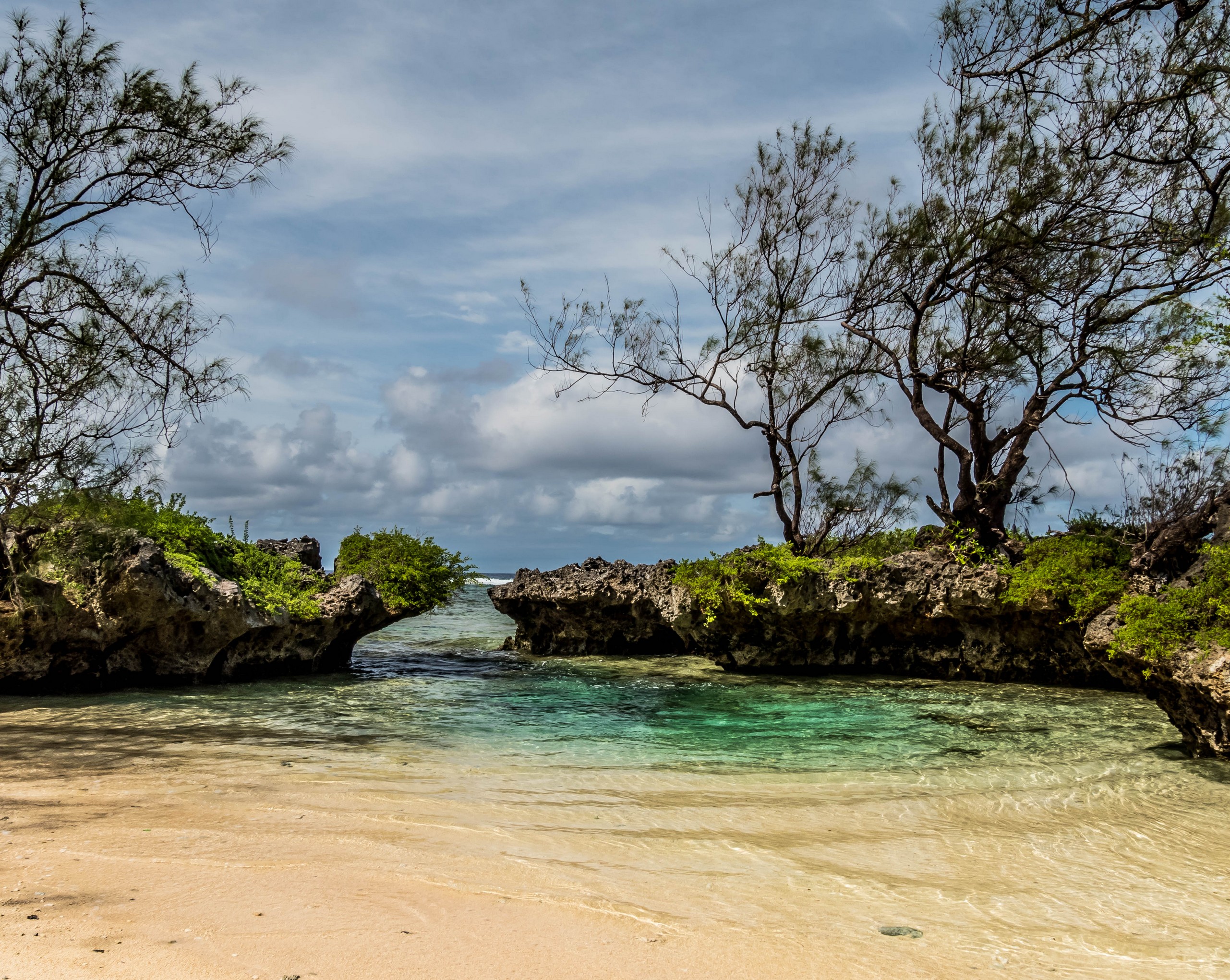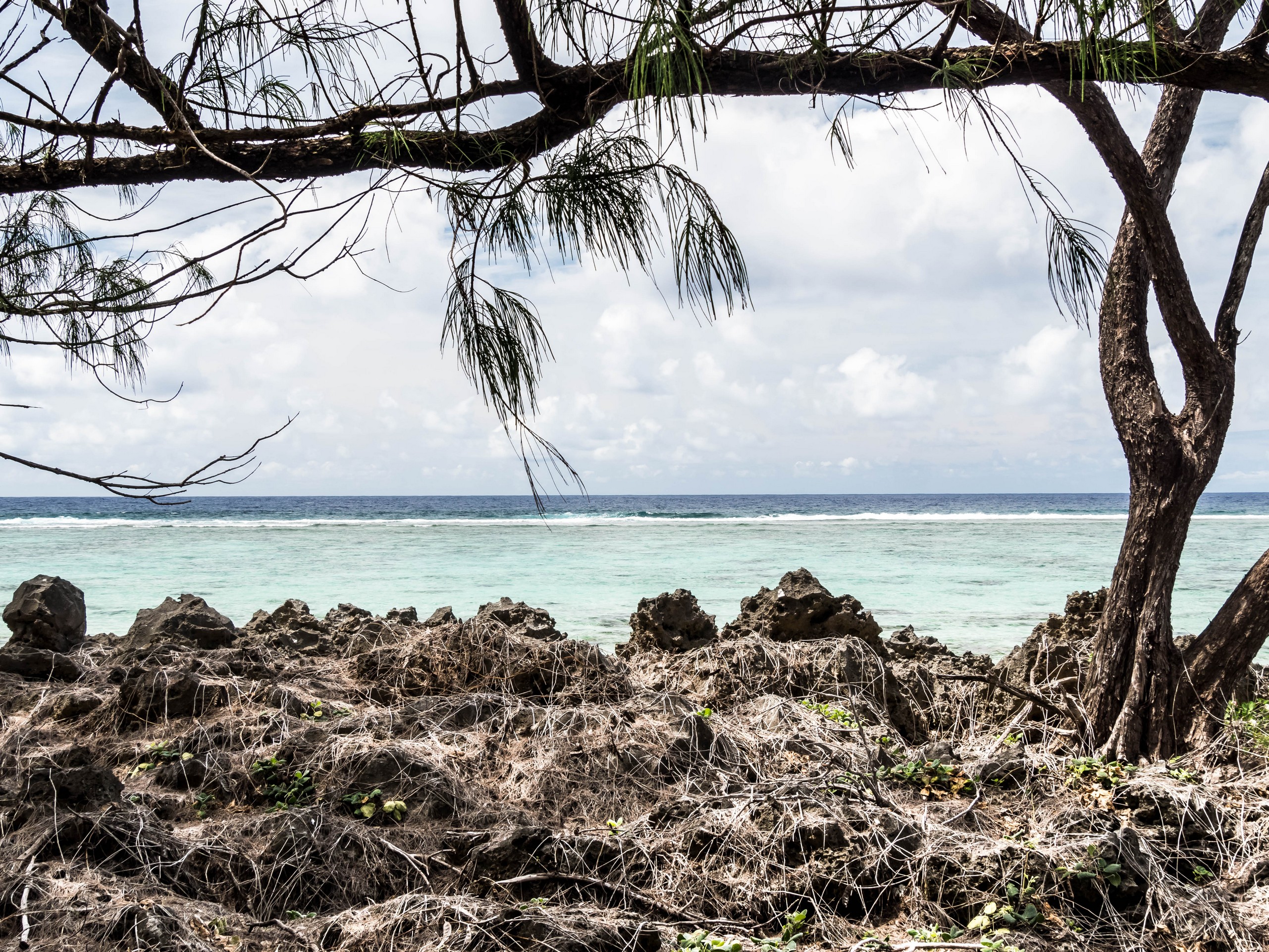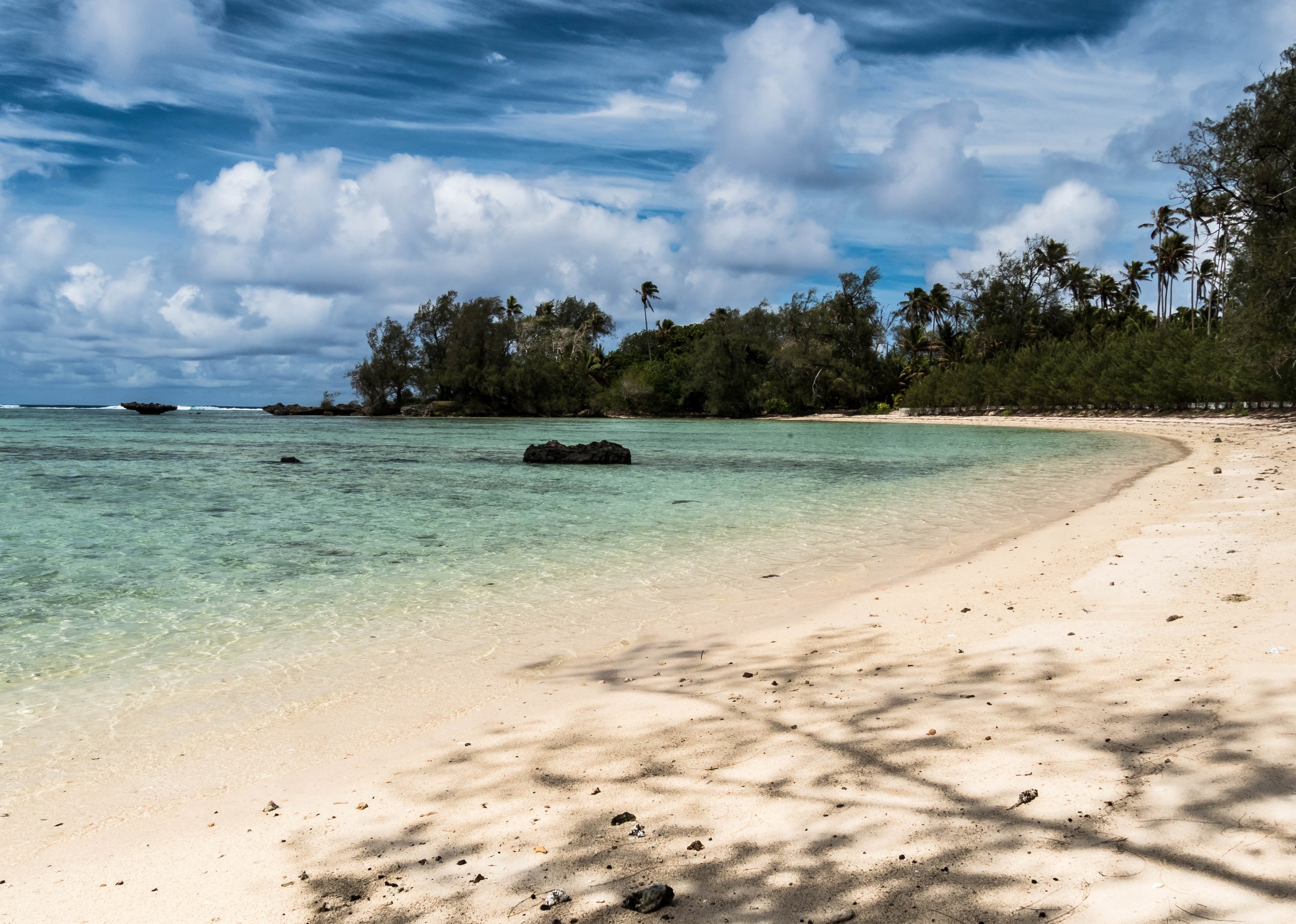 Rémi nous emmène ensuite vers la plus belle plage de l’île : la Baie des Vierges, Elle ressemble vraiment beaucoup à des calanques. C’est une suite de jolies criques, bien abritées, aux eaux turquoises, au sable blanc, avec des cocotiers et pins pour faire de l’ombre… Un endroit de rêve ! Et pas un chat, sauf nous ! D’étranges formations coralliennes créent une espèce de piscine, le Bain des Vierges, qui a donné son nom à la plage.