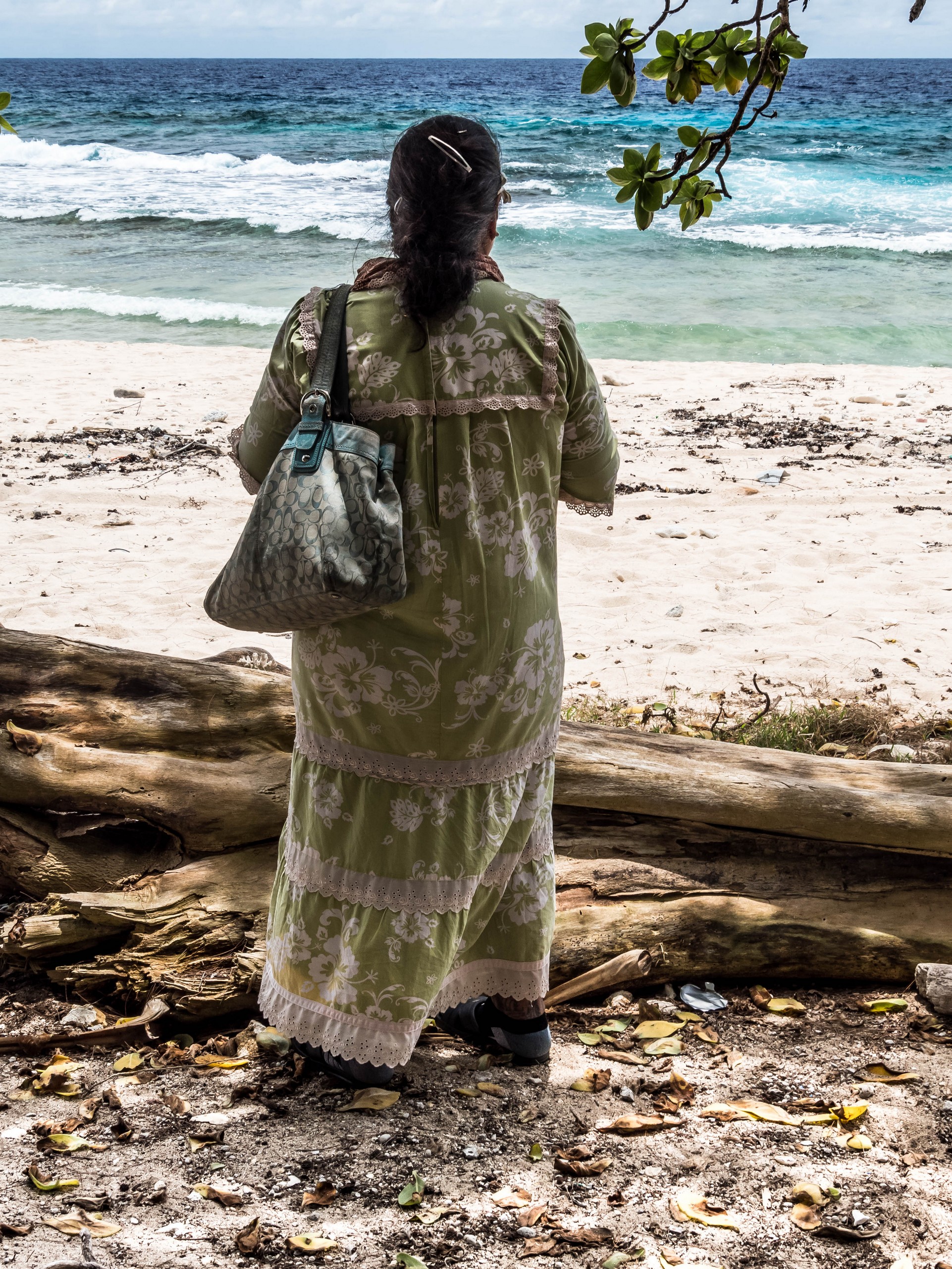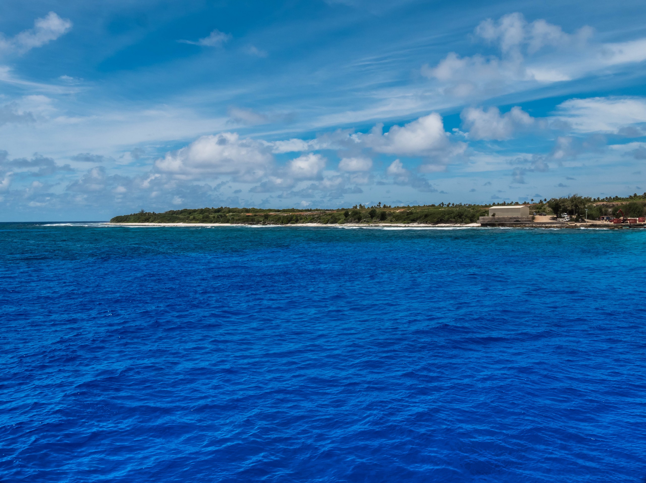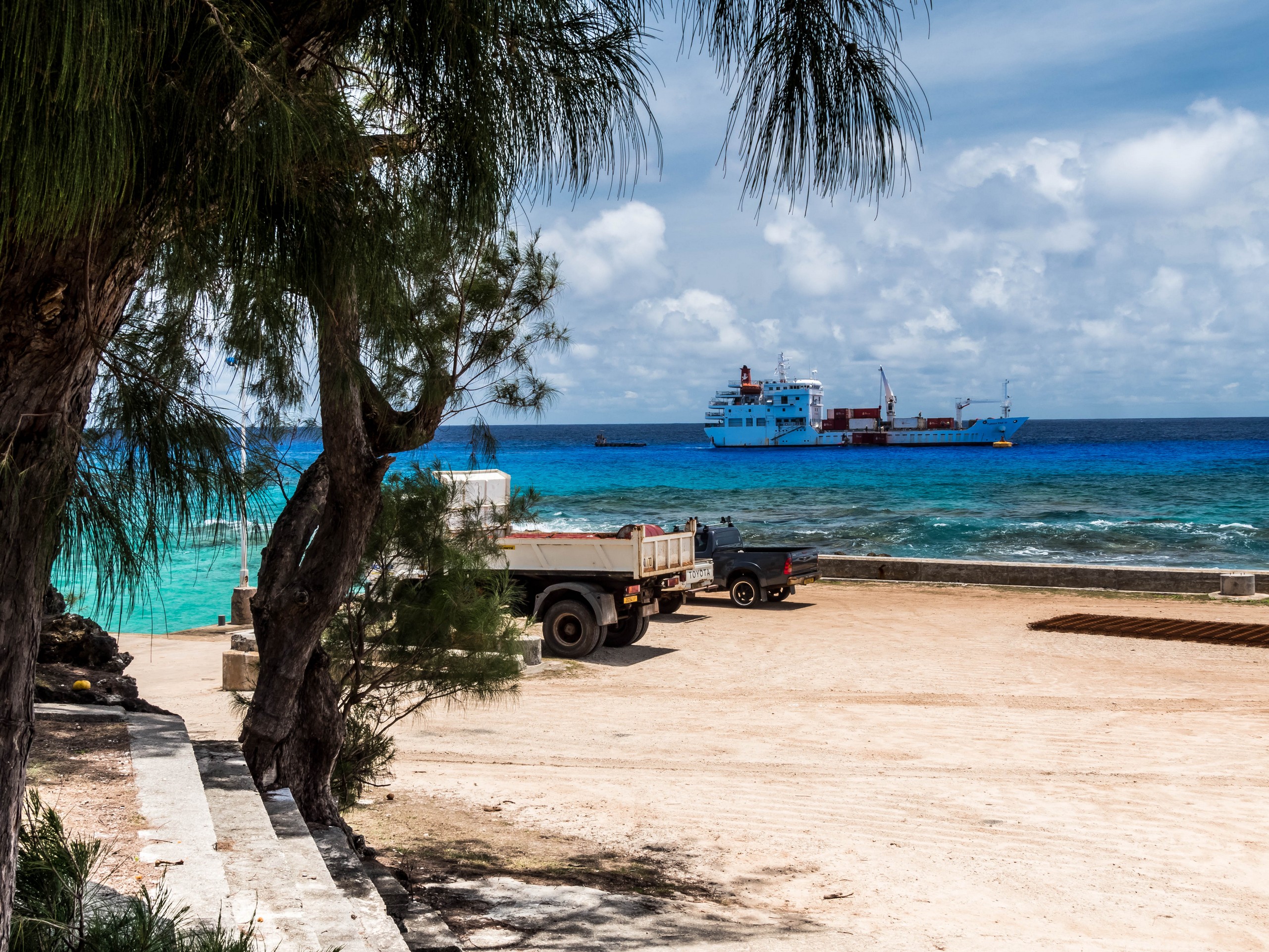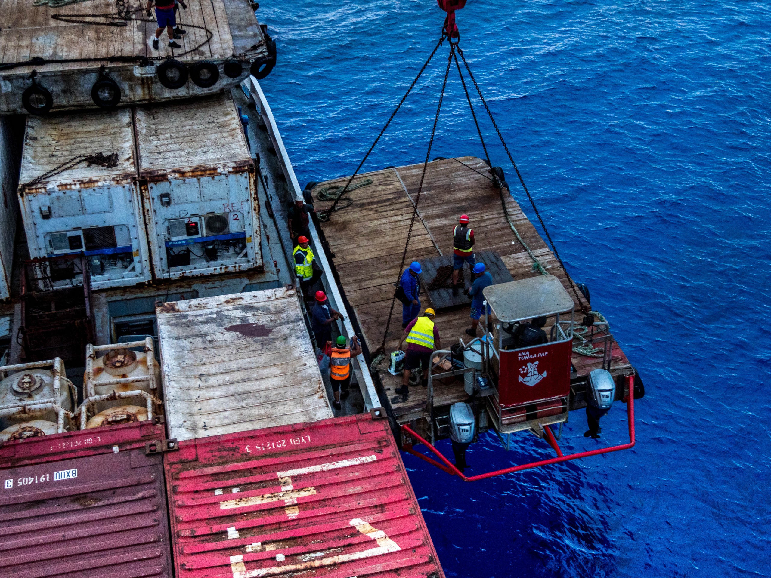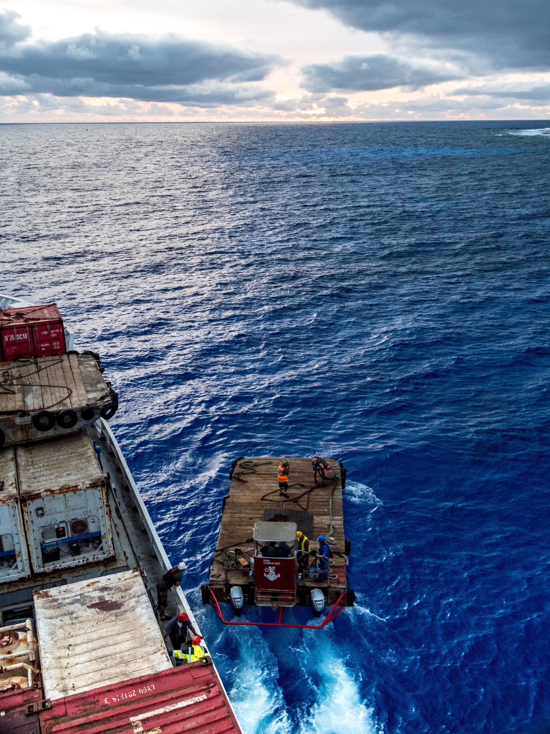 De retour au point d’embarcation, sous le soleil de l’après-midi, l’eau qui entoure Rimatara a pris une teinte que je n’avais encore jamais vue à une mer ou un océan : le bleu roy ! Ce bleu est tellement franc qu’il en fait mal aux yeux et hypnotise à la fois. Je regarde à nouveau le ballet des marins qui ramène les conteneurs sur le Tuha’a Pae. Il sont carrément perchés dessus pendant le transport sur la barge ! Je suis prise entre appréhension pour et admiration. Pendant qu’un marin resté à bords manoeuvre la grue du navire qui vient saisir et déposer ces morceaux légos géants, je m’éclipse pour ne pas les distraire.