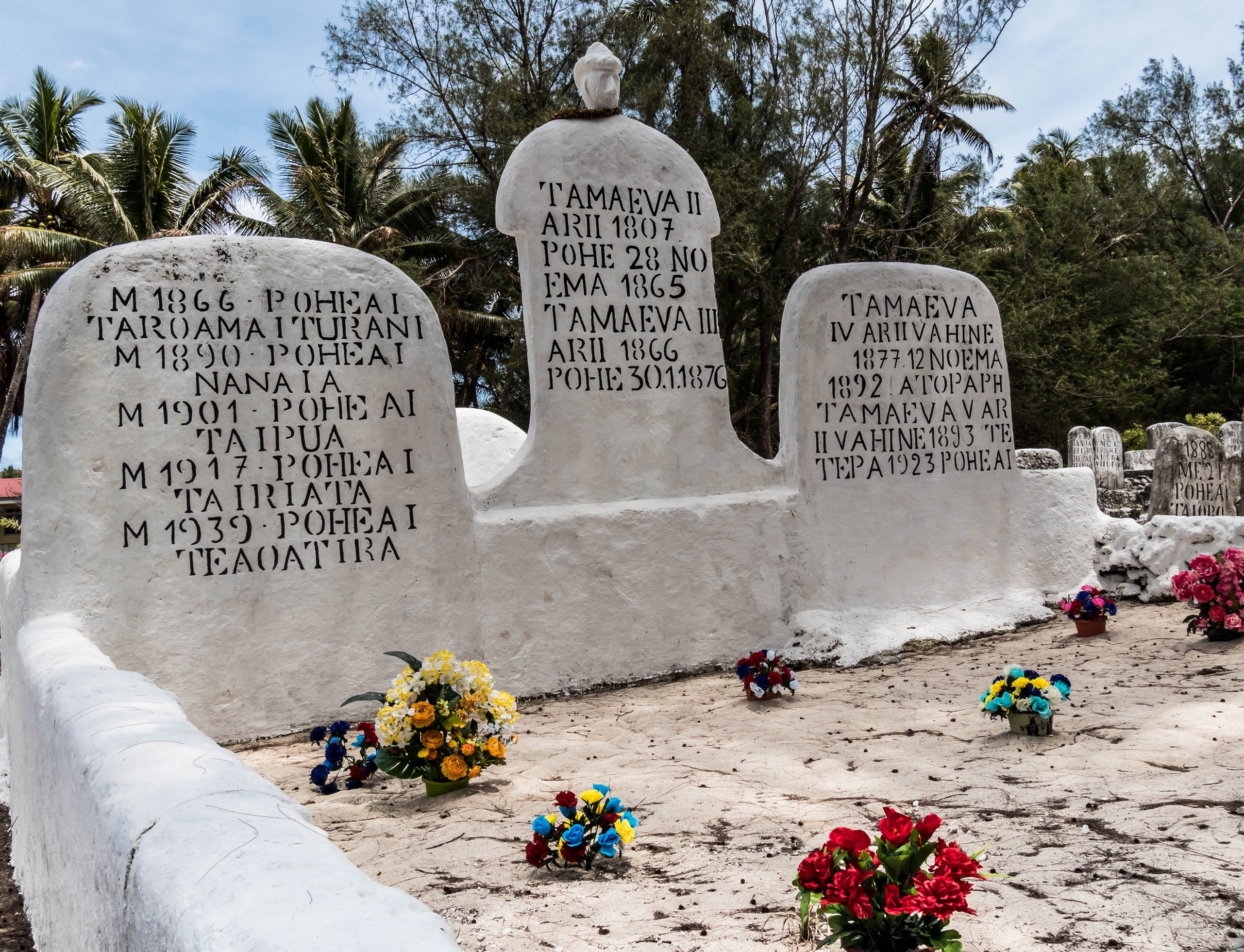 Avant de rentrer, nous allons nous arrêter au cimetière de Amaru. Sa particularité ? C’est là que son enterrés les derniers rois et reines de l’île. Les Tombes des rois et reines Tamaeva de Rimatara se dressent toutes blanches dans le cimetière. Ce sont des simples pierres mais de grandes tailles, qui dominent toutes les autres tombes. C’est que Rimatara fut l’île de Polynésie qui gardât une monarchie (jusqu’en 1901) avant que la France n’en prenne complètement le contrôle.