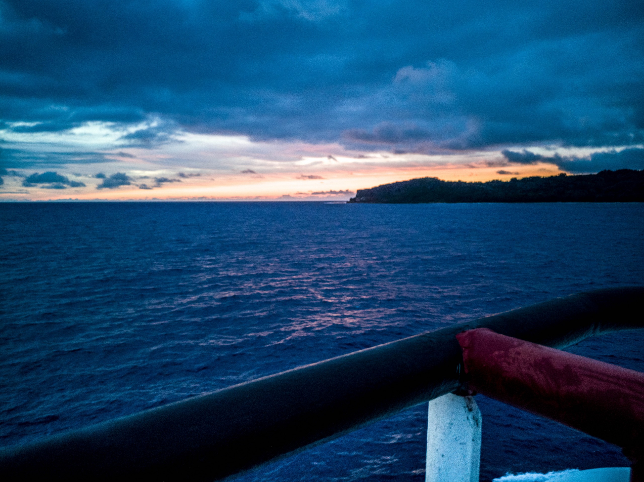 Quand nous quittons Rimatara, le soleil se couche derrière de gros voiles gris. Je suis restée longtemps après le dîner, seule à la poupe du navire pour profiter du spectacle. Je quitte cette île avec bien peu de chance de la revoir un jour. C’est un adieu que je fais à ce petit caillou attachant qui s’éloigne inexorablement. J’ai un pincement au cœur.