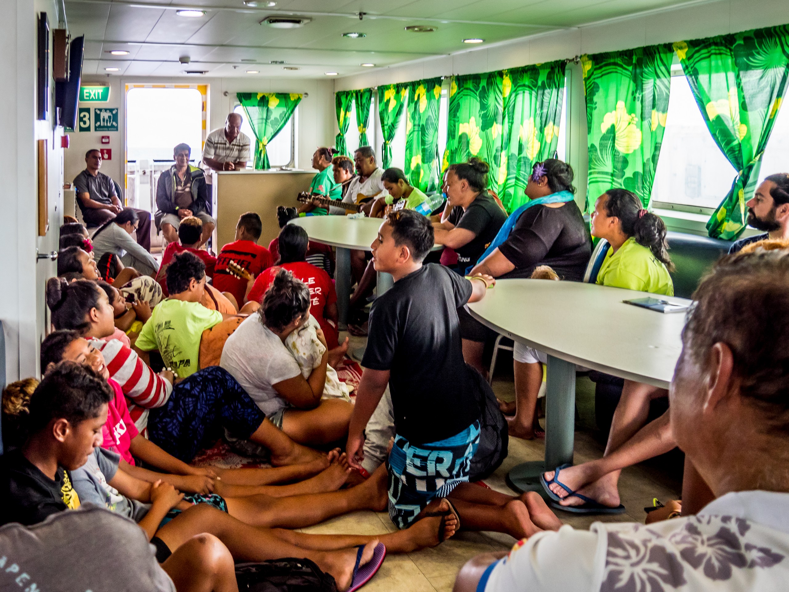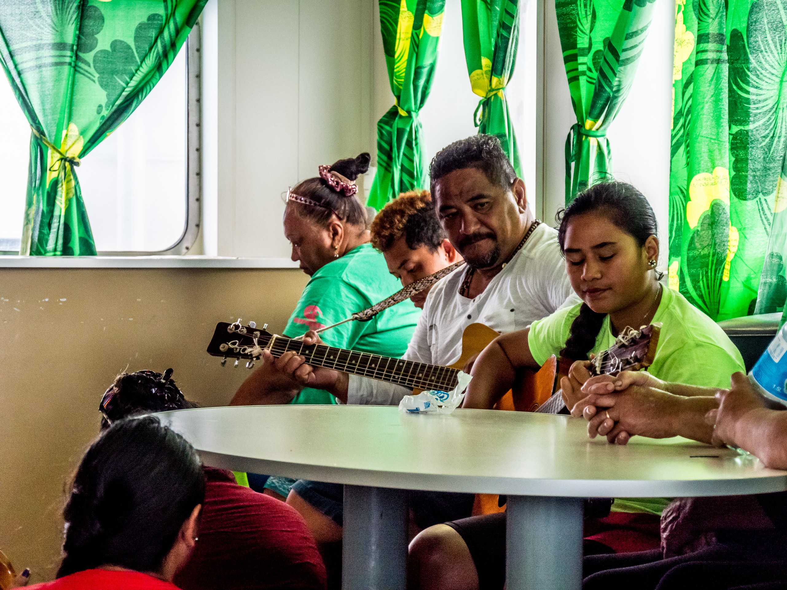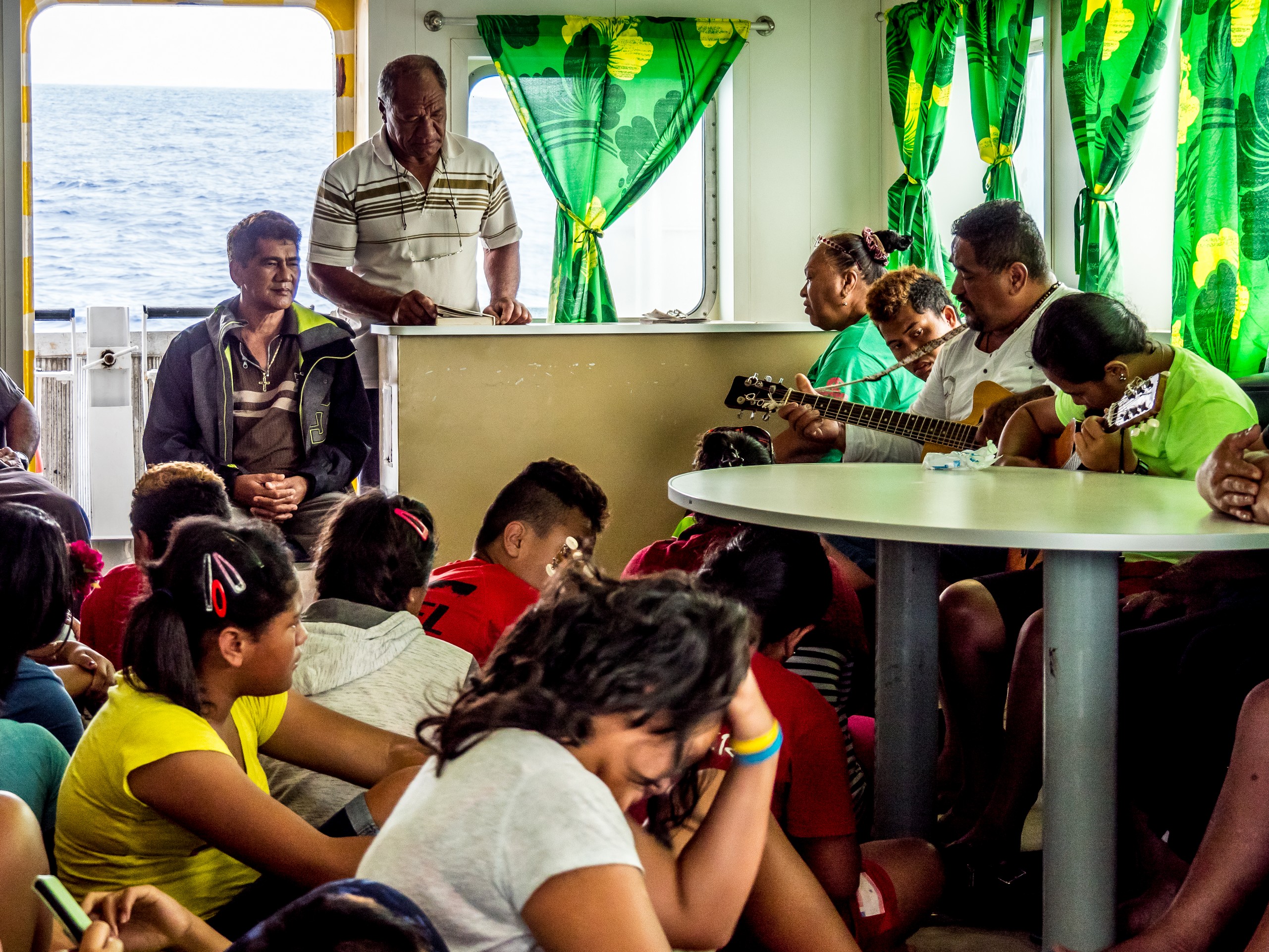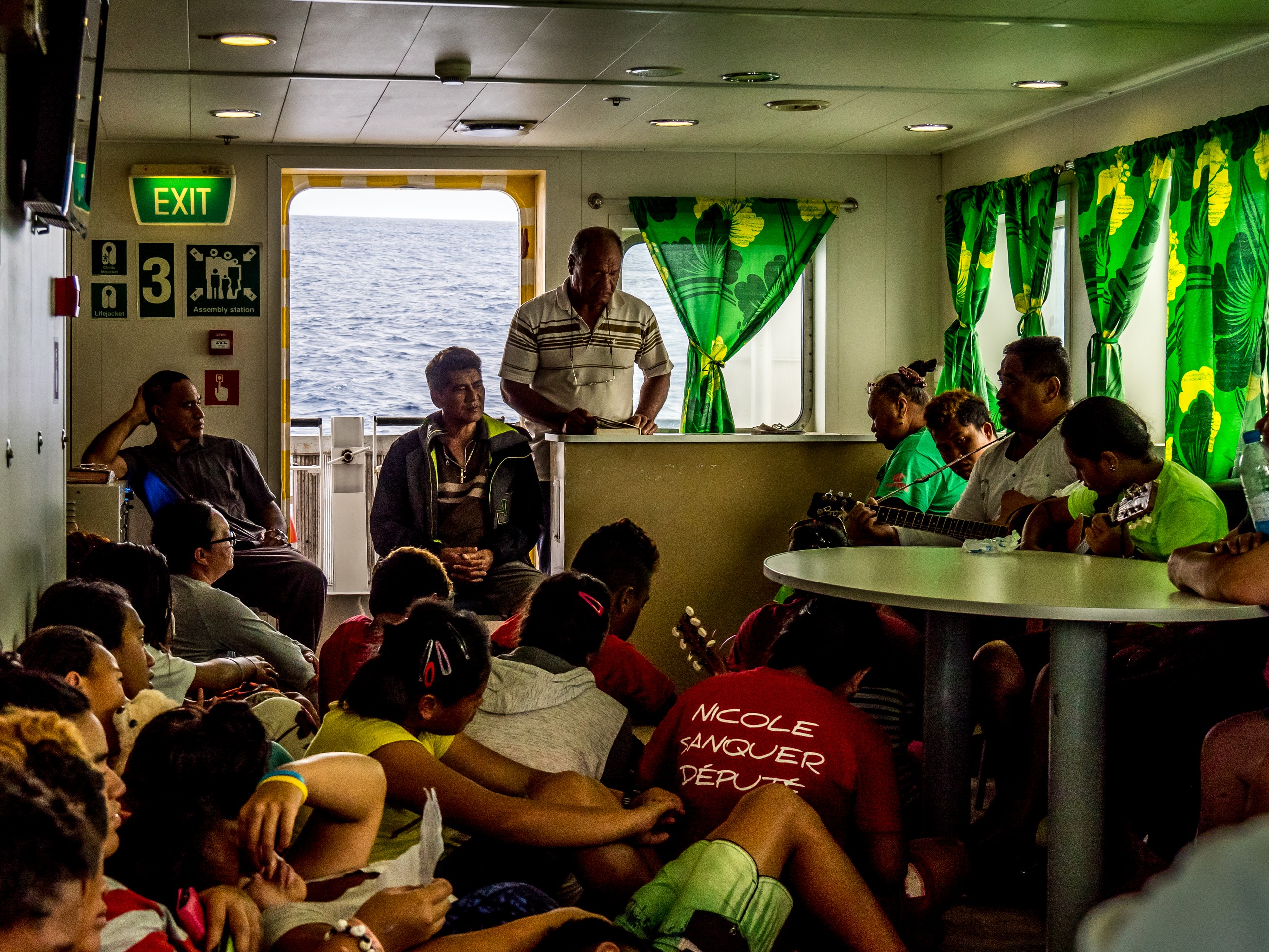 Soulagement de retrouver enfin une chambre et l’intimité qui va avec, et tristesse de quitter ce qui fut ma maison et un peu ma famille pendant 10 jours, Car il faut l’avouer, si les silhouettes et les mines patibulaires des matelots font a priori un peu peur, ce sont de vrais nounours, toujours le sourire et un mot gentil aux lèvres. Hier encore, avec les collégiens et lycéens, quelques passagers et l’équipage, on a eu droit à la messe. Une vraie messe du culte protestant avec les merveilleux chants polynésiens qui vont avec. Tout ce petit monde s’est concentré à l’arrière de la cafétéria, certains (les plus âgés), assis sur des chaises, d’autres (la plupart des élèves) à même le sol. C’est une petite masse humaine qui tapisse le plancher du pont. Michel et moi, les seuls Popa’a à assister au culte, nous restons debout, attentifs et souriants. Je me laisse bercer par la douceur de la langue tahitienne mais quand arrive le sermon, c’est en français qu’il est dit. C’est là que je réalise que c’est la première fois que j’assiste à une messe protestante… et s’il y a une chose en commun avec la version catholique, c’est que le sermon est tout aussi fastidieux à écouter. J’ai soudain des années de présence à l’église qui me reviennent en mémoire. Une sensation de déjà-vu qui va me saisir pendant plusieurs secondes. Je jette un oeil aux ados, eux aussi ont l’air d’attendre que ça passe avant de se réveiller pour chanter, c’est là que passe toute leur foi. Dieu sait à quel point je suis agnostique maintenant mais l’image de ce bateau plein de ferveur naviguant sur l’immense Pacifique, à des miles nautiques de tout, m’a profondément émue.