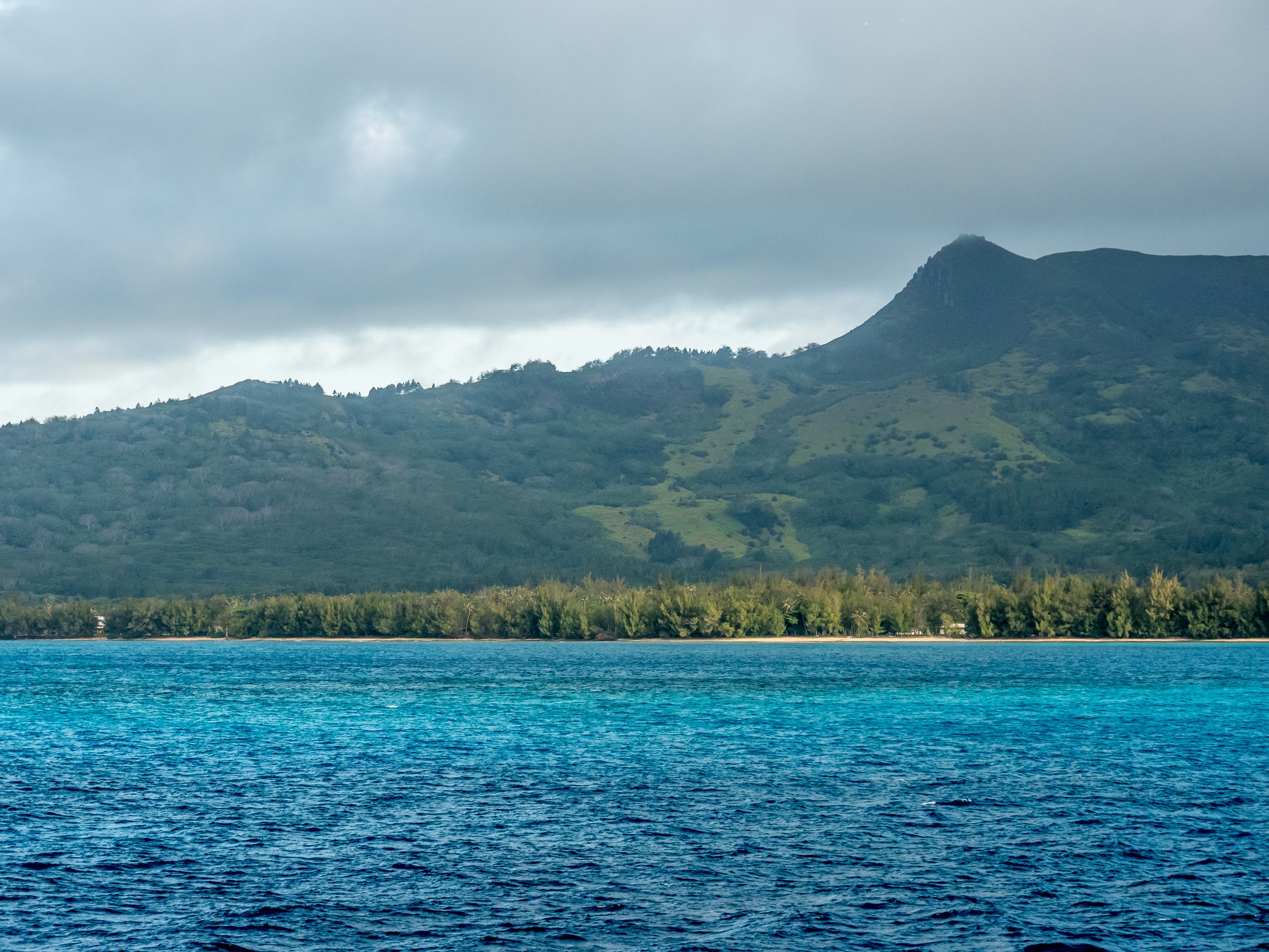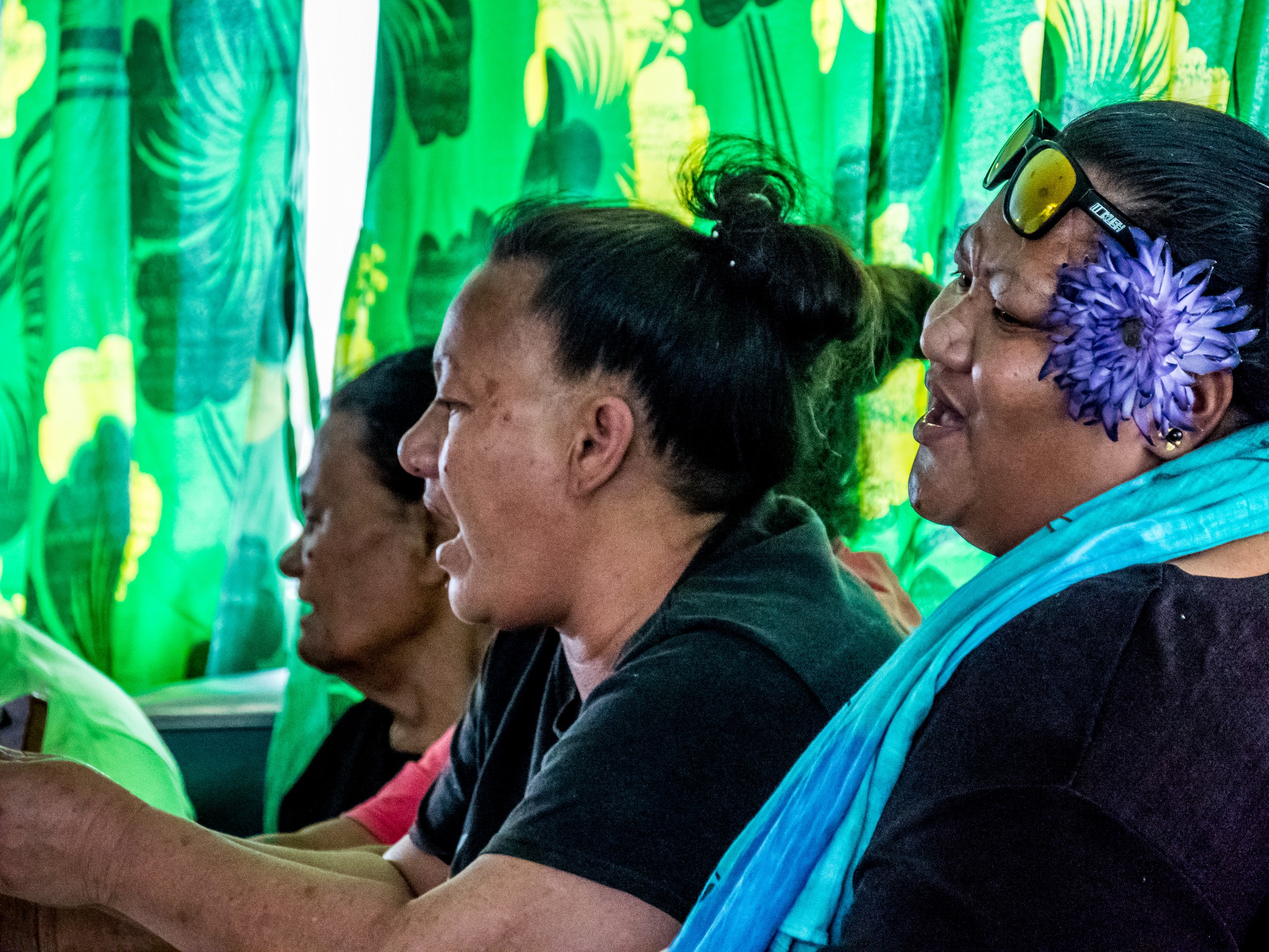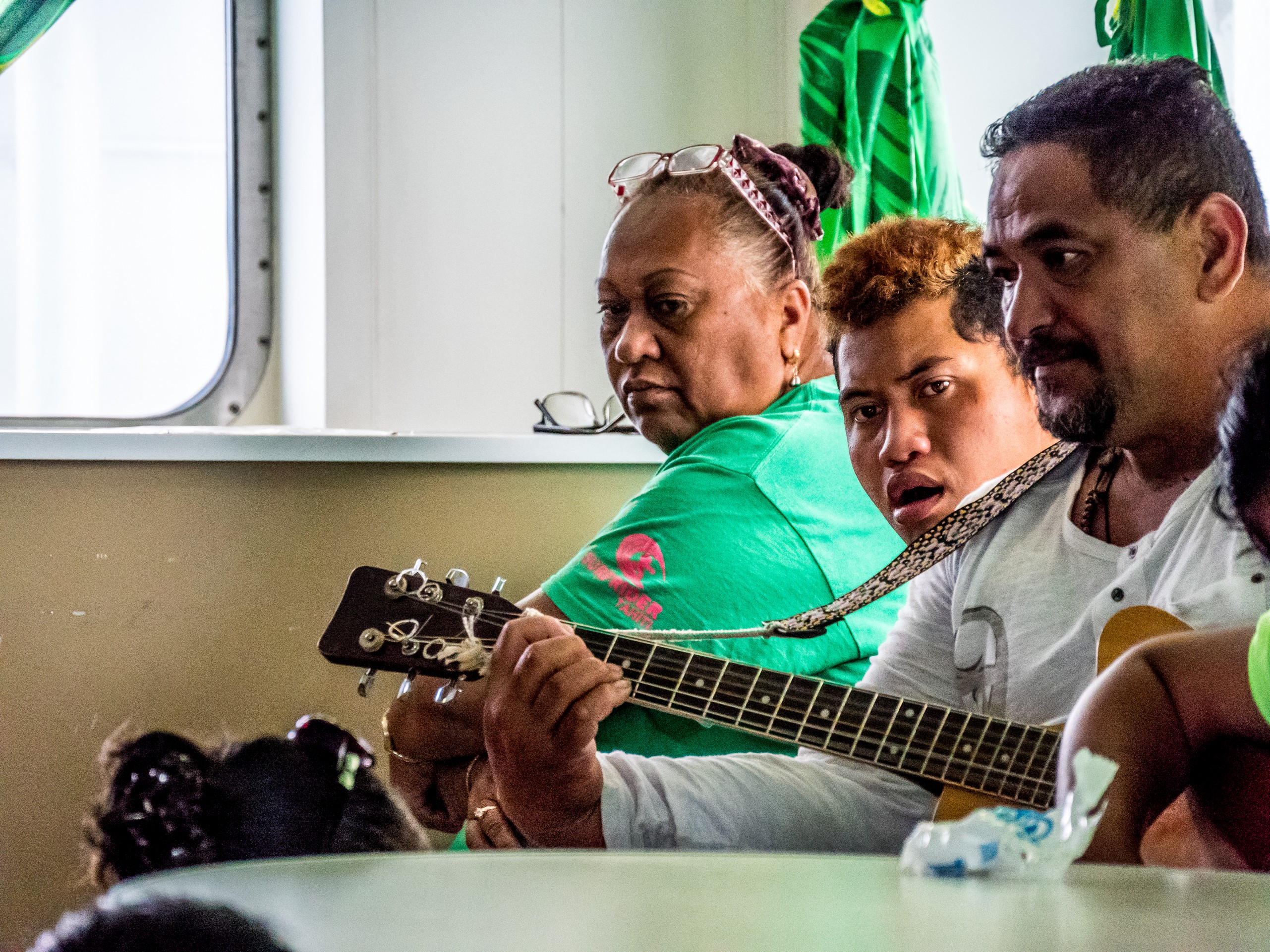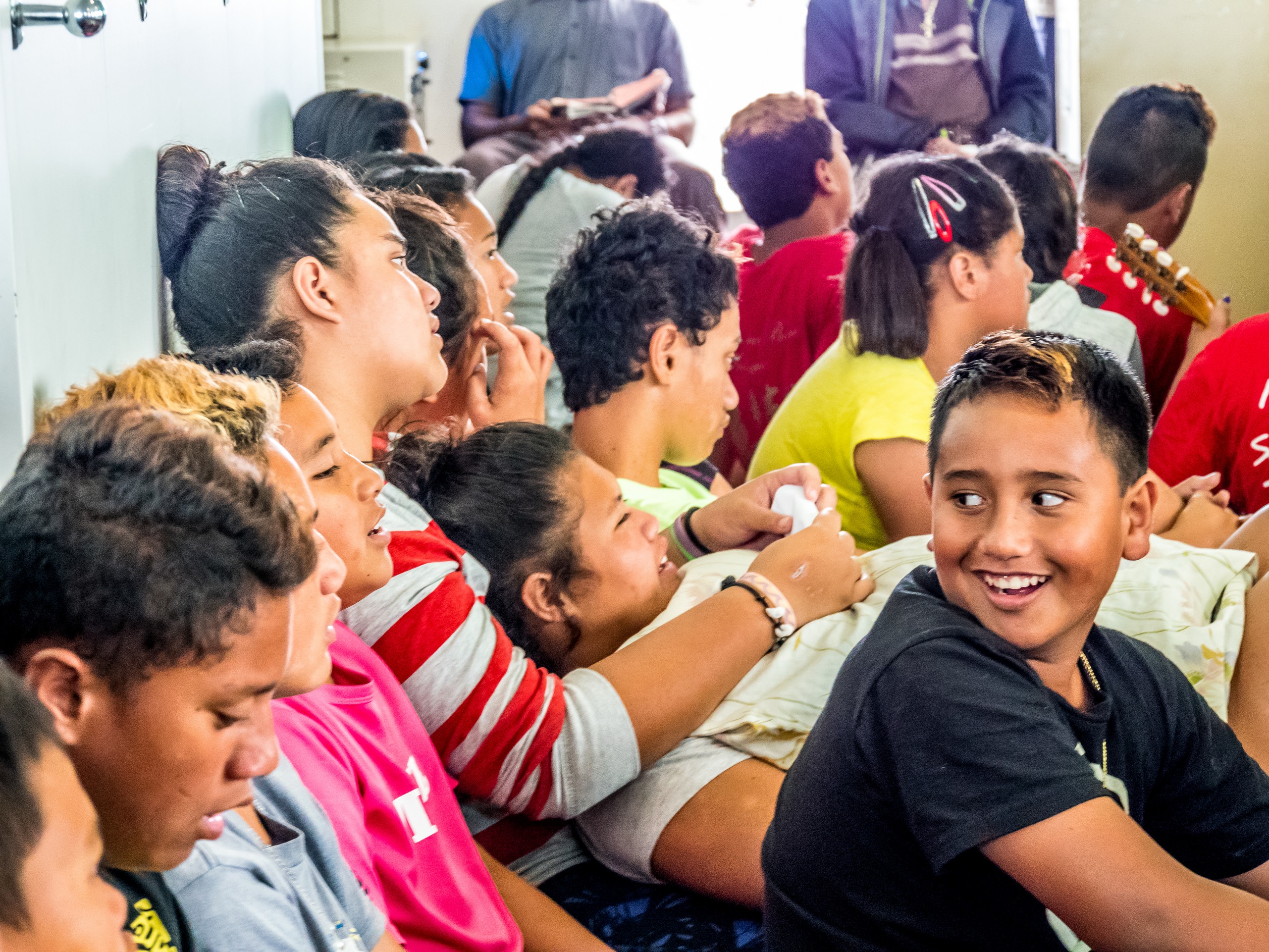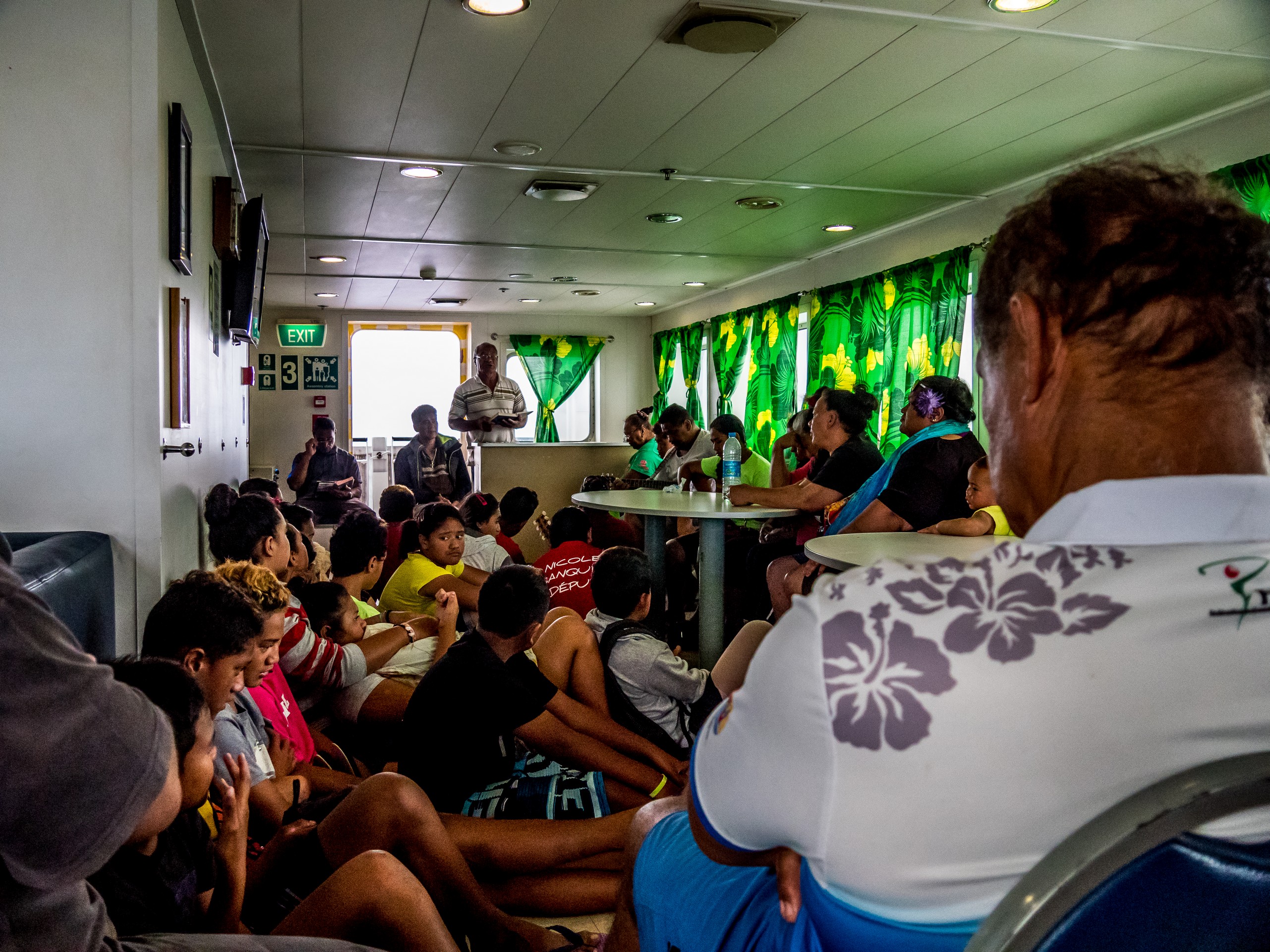 Soulagement de retrouver enfin une chambre et l’intimité qui va avec, et tristesse de quitter ce qui fut ma maison et un peu ma famille pendant 10 jours, Car il faut l’avouer, si les silhouettes et les mines patibulaires des matelots font a priori un peu peur, ce sont de vrais nounours, toujours le sourire et un mot gentil aux lèvres. Hier encore, avec les collégiens et lycéens, quelques passagers et l’équipage, on a eu droit à la messe. Une vraie messe du culte protestant avec les merveilleux chants polynésiens qui vont avec. Tout ce petit monde s’est concentré à l’arrière de la cafétéria, certains (les plus âgés), assis sur des chaises, d’autres (la plupart des élèves) à même le sol. C’est une petite masse humaine qui tapisse le plancher du pont. Michel et moi, les seuls Popa’a à assister au culte, nous restons debout, attentifs et souriants. Je me laisse bercer par la douceur de la langue tahitienne mais quand arrive le sermon, c’est en français qu’il est dit. C’est là que je réalise que c’est la première fois que j’assiste à une messe protestante… et s’il y a une chose en commun avec la version catholique, c’est que le sermon est tout aussi fastidieux à écouter. J’ai soudain des années de présence à l’église qui me reviennent en mémoire. Une sensation de déjà-vu qui va me saisir pendant plusieurs secondes. Je jette un oeil aux ados, eux aussi ont l’air d’attendre que ça passe avant de se réveiller pour chanter, c’est là que passe toute leur foi. Dieu sait à quel point je suis agnostique maintenant mais l’image de ce bateau plein de ferveur naviguant sur l’immense Pacifique, à des miles nautiques de tout, m’a profondément émue.