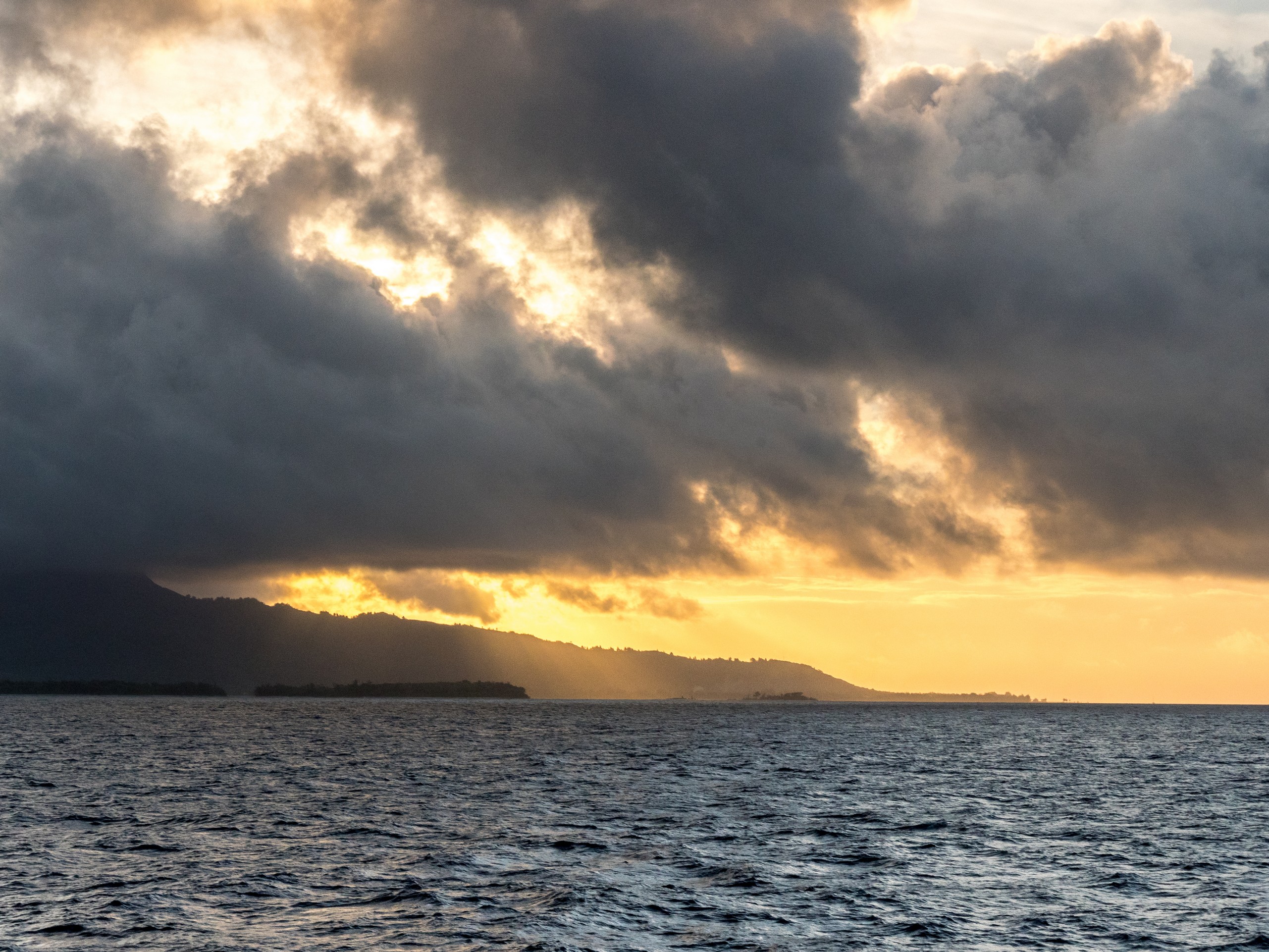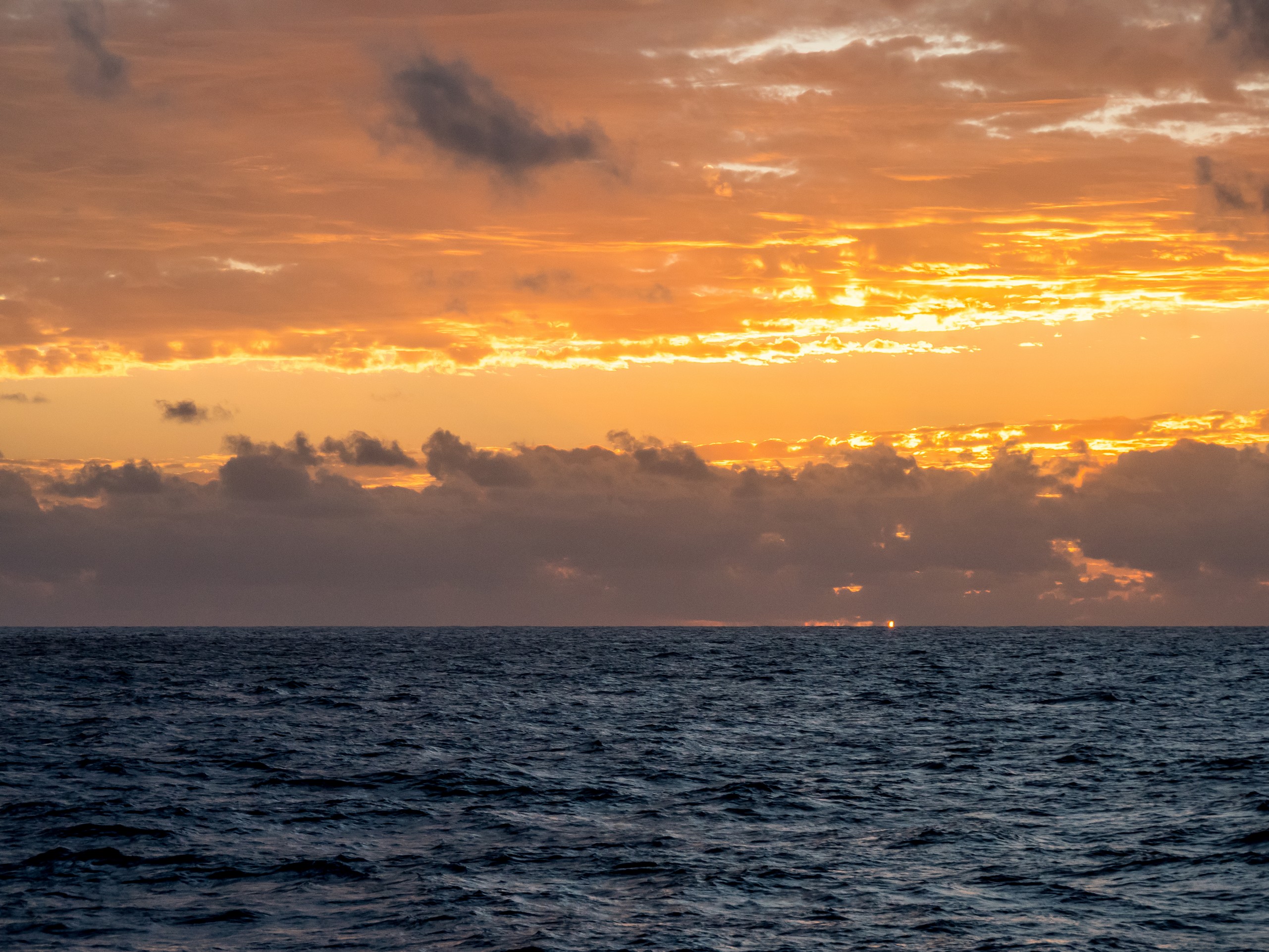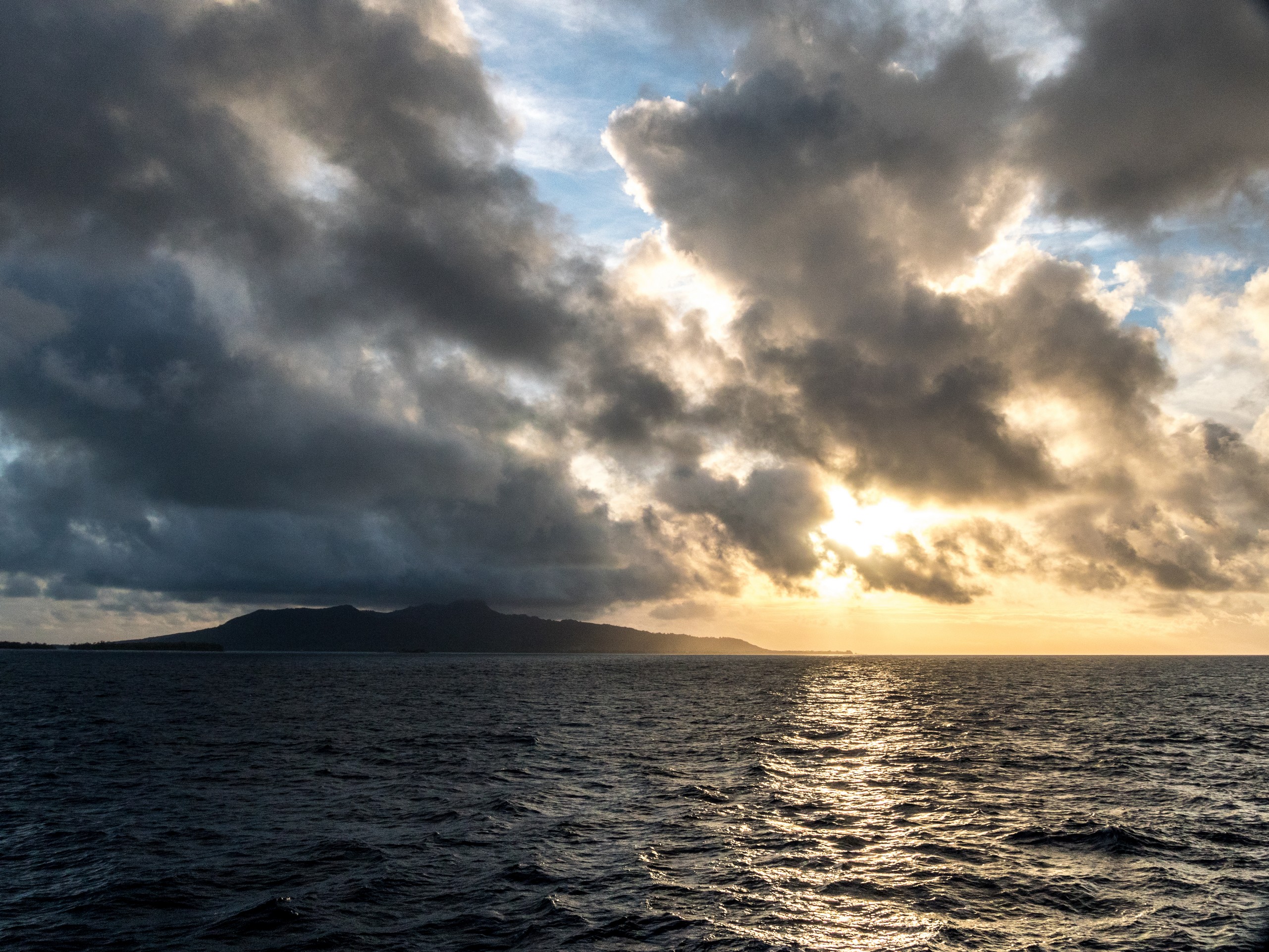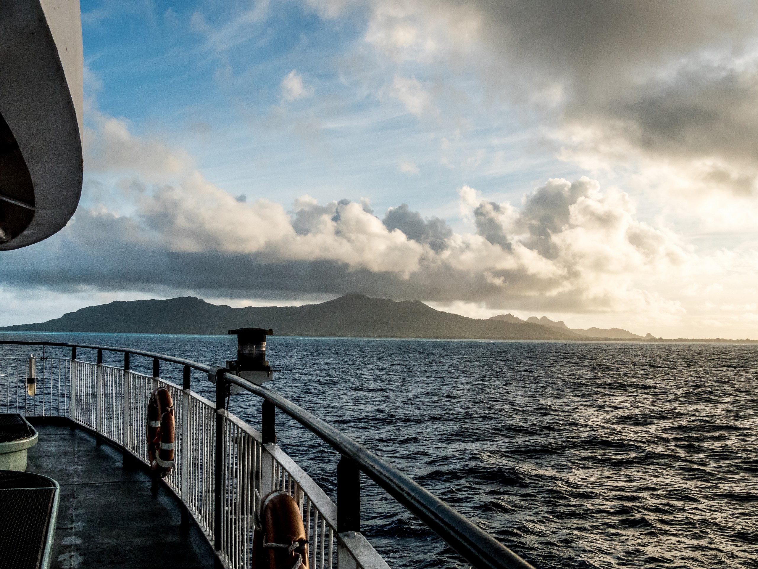 Dernier coucher de soleil sur l’océan. Pour ça, j’ai voulu rester jusqu’au bout sur un des ponts extérieurs, à l’abri du vent, à lire et regarder le jeu du soleil sur la mer jusqu’à ce qu’il disparaisse derrière un voile de nuage et l’île de Tubai. Ce soir est mon dernier à bords du Tuha’a Pae IV et j’hésite entre tristesse et soulagement.