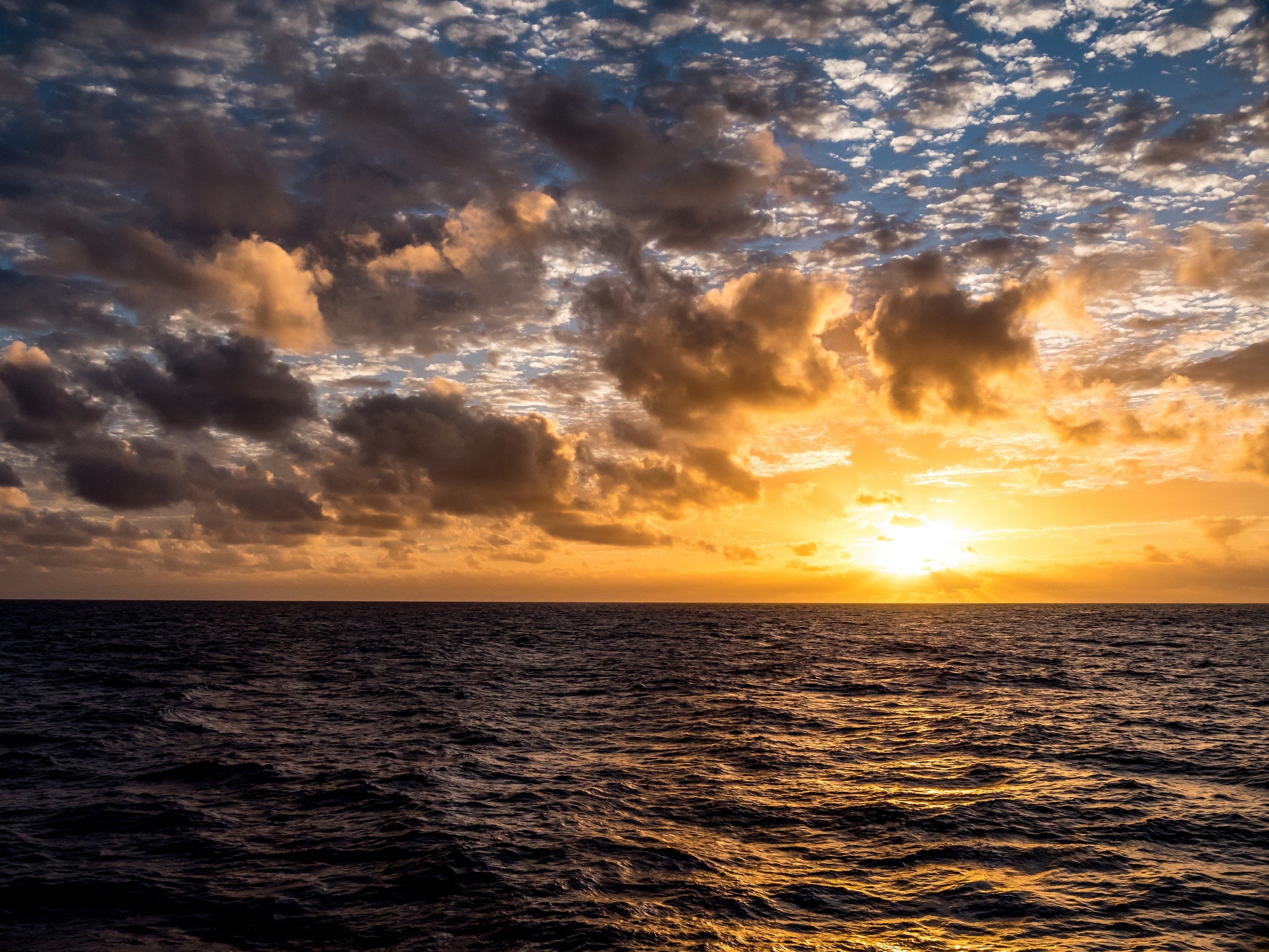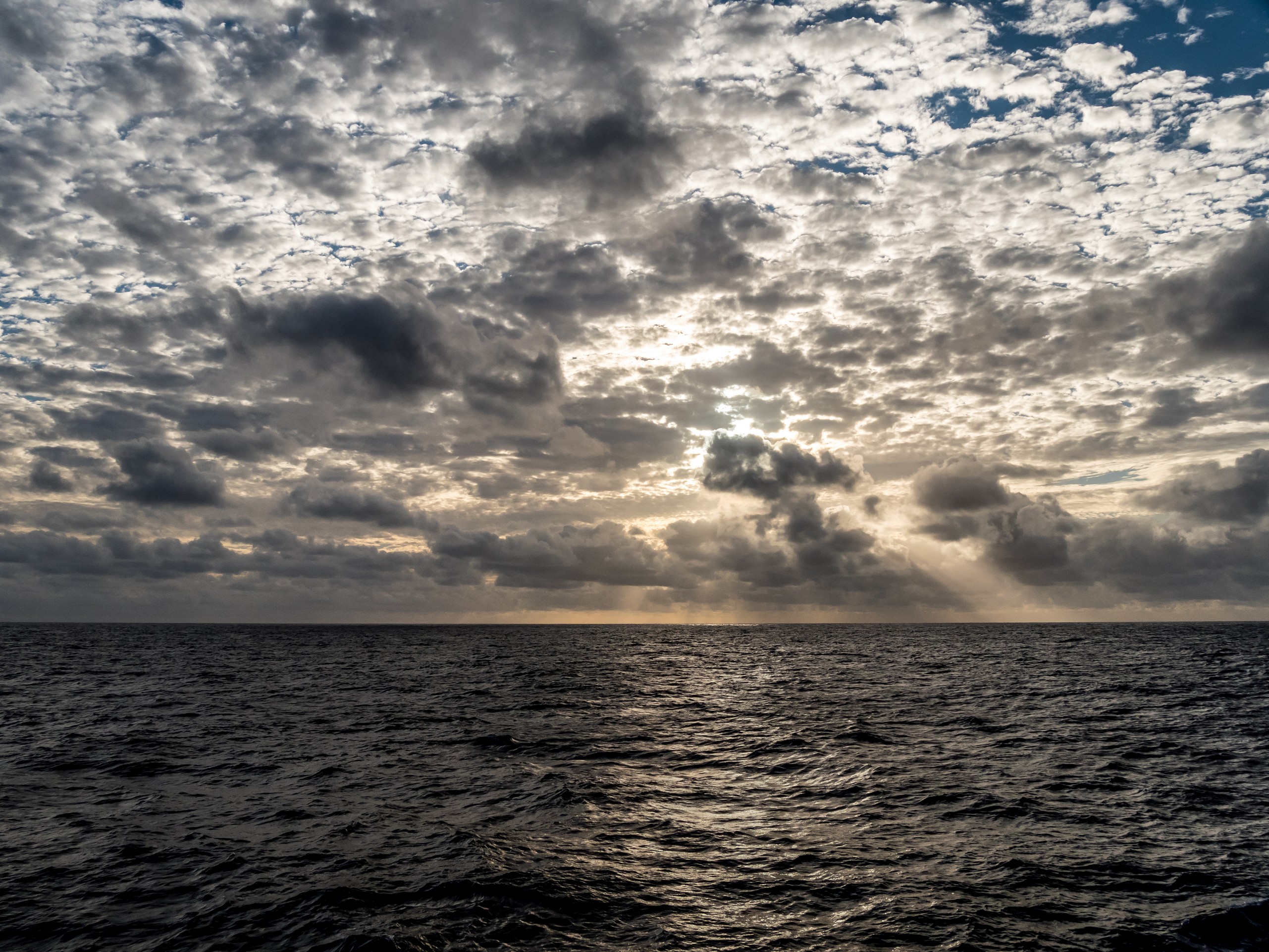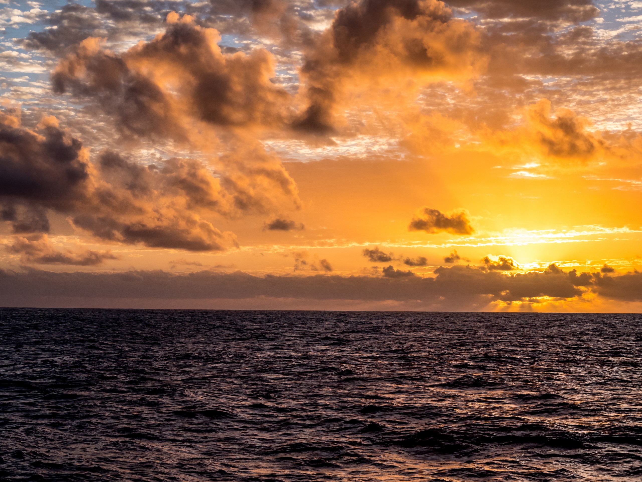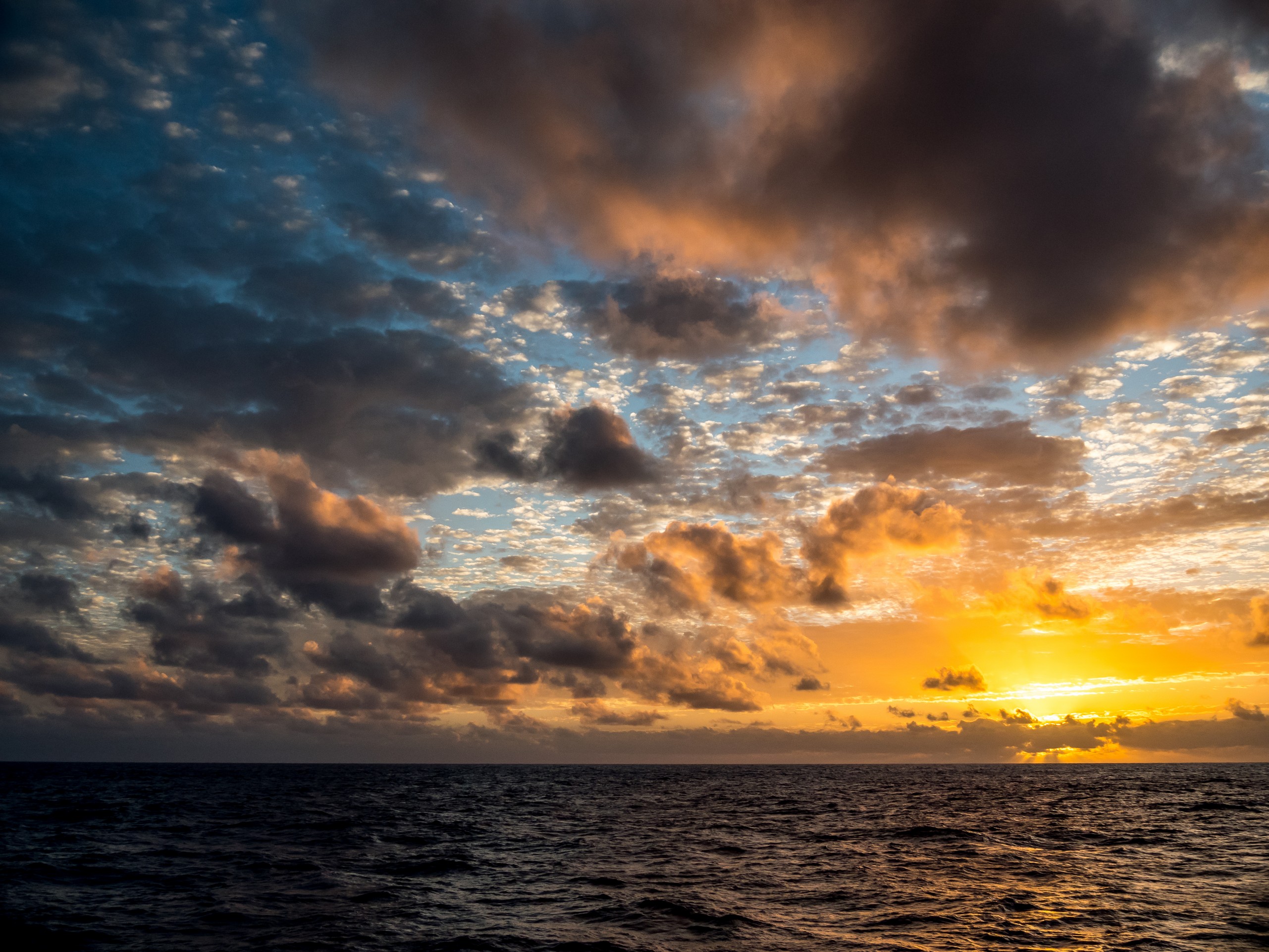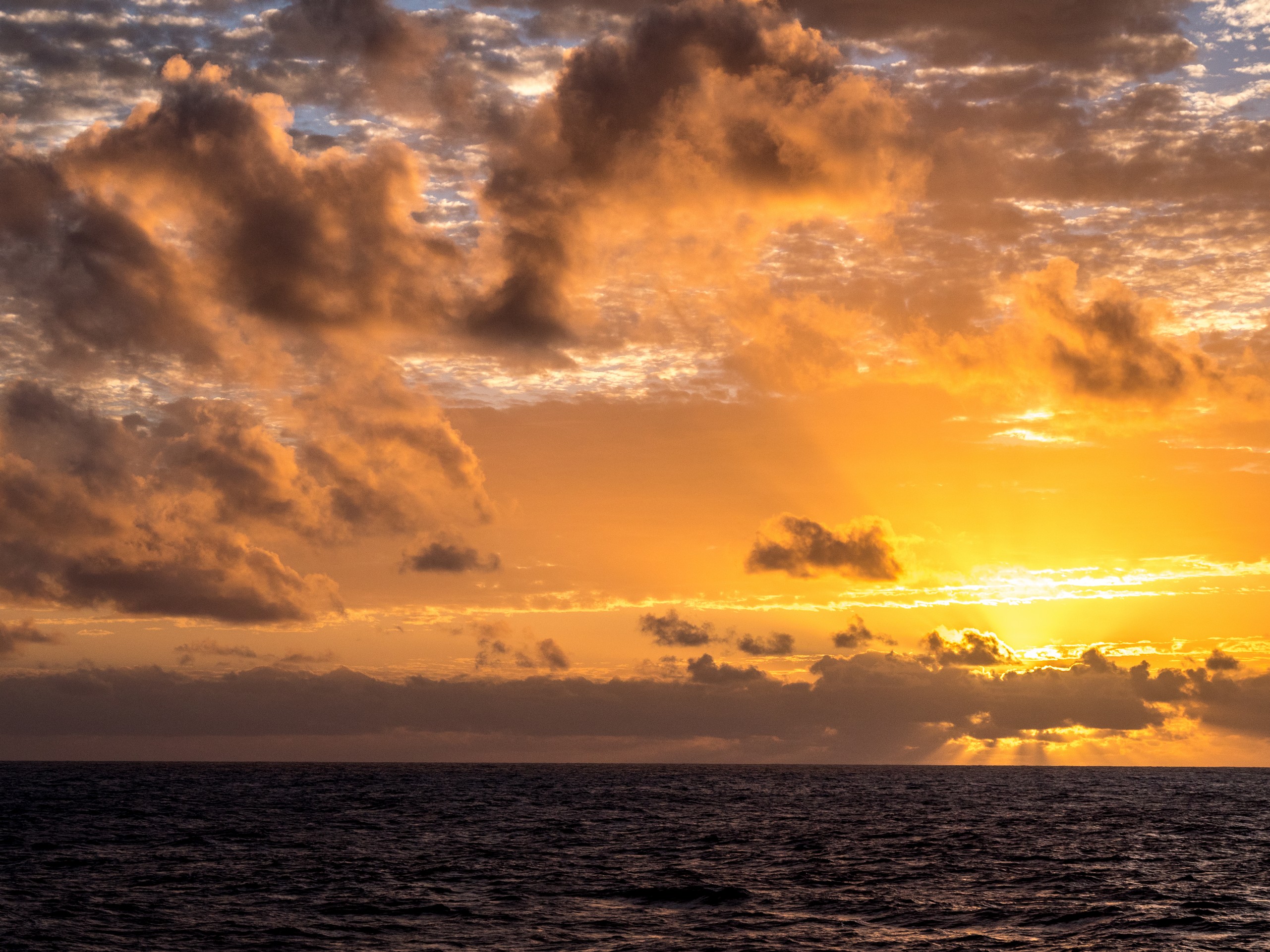 Dernier coucher de soleil sur l’océan. Pour ça, j’ai voulu rester jusqu’au bout sur un des ponts extérieurs, à l’abri du vent, à lire et regarder le jeu du soleil sur la mer jusqu’à ce qu’il disparaisse derrière un voile de nuage et l’île de Tubai. Ce soir est mon dernier à bords du Tuha’a Pae IV et j’hésite entre tristesse et soulagement.