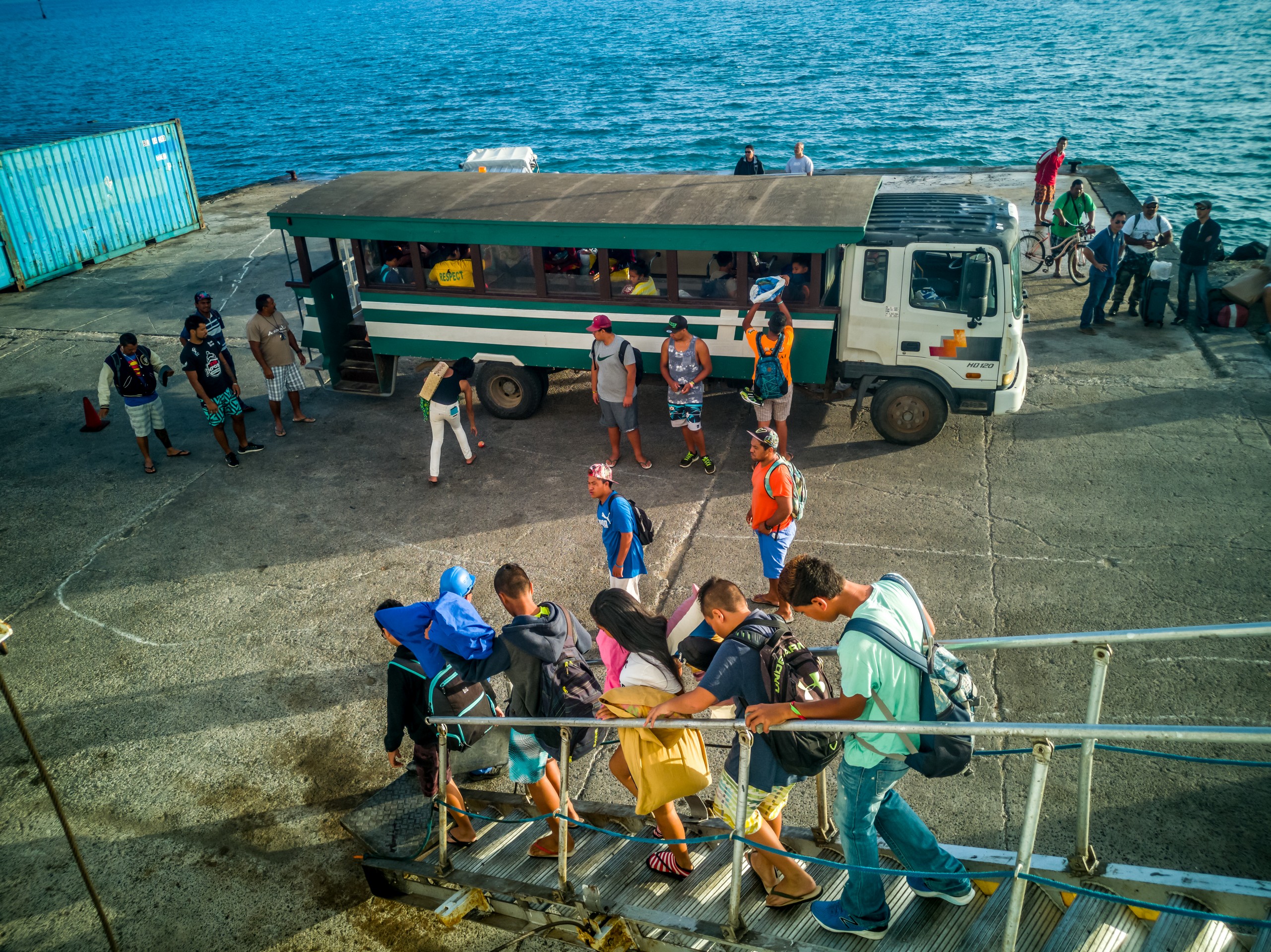 En me levant, je jette un oeil sur mon voisin de couchette, un grand garçon qui a passé toute la traversée prostré sur sa couchette, saisi par le mal de mer. Il a passé quasi 48 heures sans manger, malgré les pilules contre le mal des transports que je lui avais proposé. Je le vois soulagé et souriant d’être enfin à terre. Et j’imagine qu’il doit déjà se dire qu’il va devoir à nouveau subir ce calvaire d’ici quelques semaines. Mes petits curieux, eux, étaient trop au taquet pour dire au revoir. Je les ai regardé embarquer dans un Truck, la camionnette qui sert de ramassage scolaire en Polynésie avec attendrissement et soulagement. Complètement KO, après une promenade matinale pour me rendre à la banque de Tubuai, je suis revenue sur le bateau, décidée à siester ferme. Je n’étais pas la seule. Et ainsi à filé la journée jusqu’à cet ultime coucher de soleil.