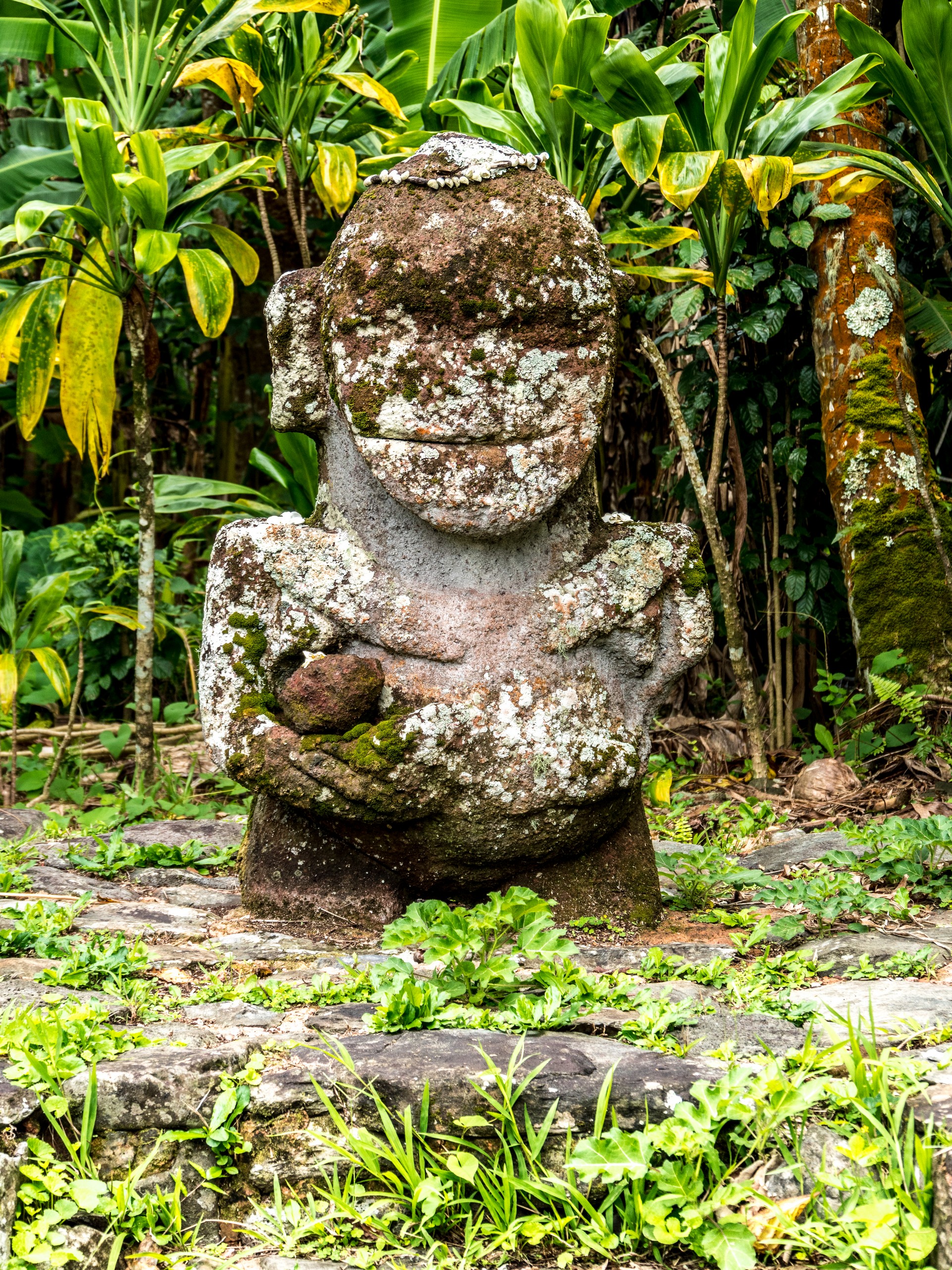Mes escapades à vélo, mon engin de liberté à moi, resteront gravées dans mon souvenir. La veille encore, j’avais fait le tour complet de l’île, m’arrêtant où bon (et beau) me semblait. J’étais allée saluer le Tiki Souriant, dissimulé dans un jardin sur la route entre Rairua et Mahanatoa. Un drôle de tiki car ces sculptures sont presque toujours solennelles. Ici, il a un sourire jusqu’aux oreilles et est coiffé d’un grand coquillage. Un témoignage rare de l’art polynésien d’antan.