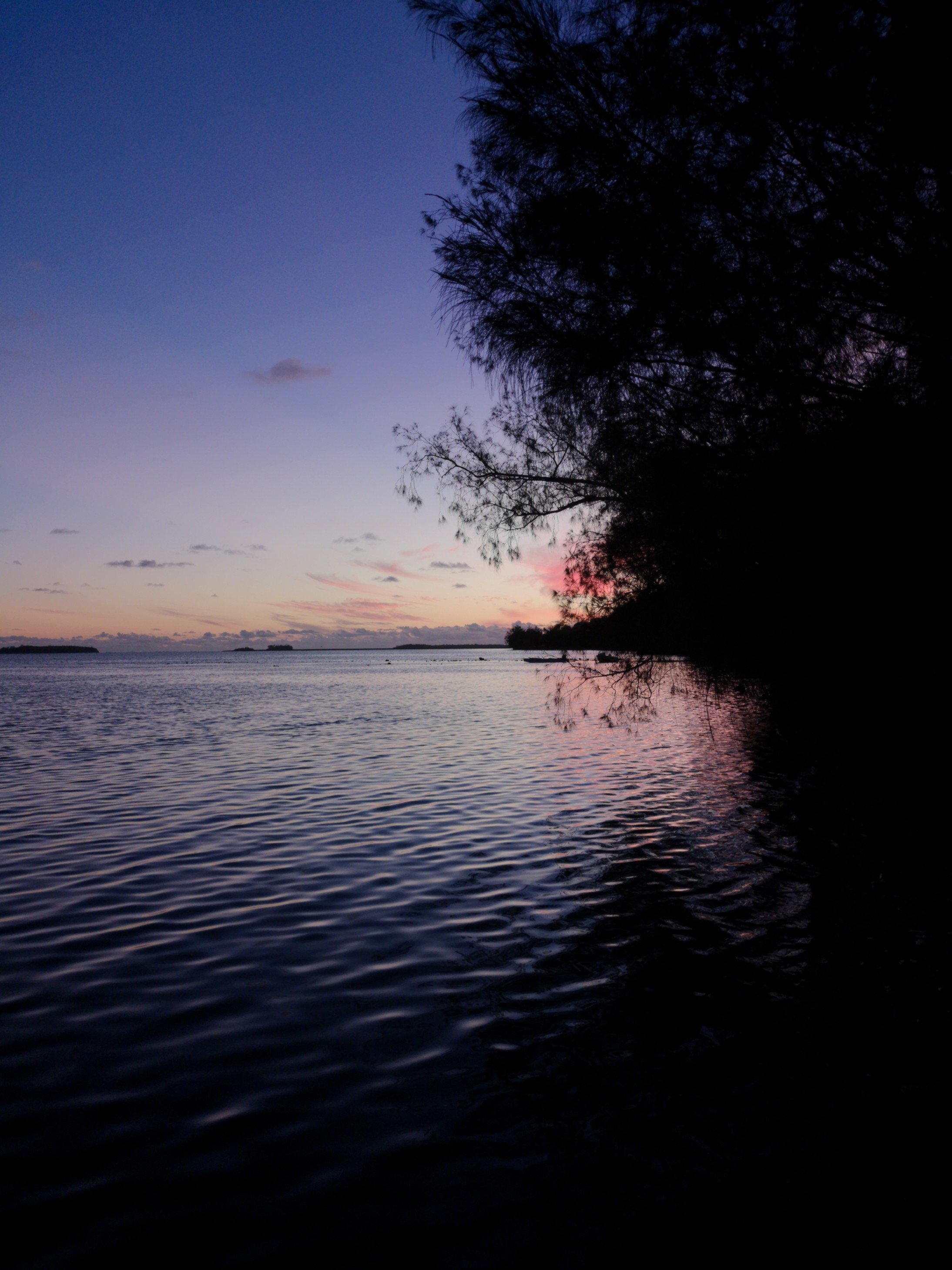 Pour la dernière fois, je m’assieds sur la petite table en bois construite pour les pensionnaires d’Odile. C’est l’ultime soirée à Raivavae et je pourrais chanter le blues. Pour la dernière fois, je prends ce moment rien que pour moi. Cette heure magique en attendant le crépuscule à coucher mes aventures sur cet écran, les sensations toutes fraîches, les yeux encore emplis de soleil. Pour la dernière fois, je vais scruter le lagon, le regarder changer de couleur avant qu’il ne plonge presque dans le noir. Je vais le regarder se parer de rose, d’orange, de lilas tout comme le ciel de l’ouest. La même activité, mais avec chaque jour une issue différente avec plus ou moins de nuages, plus ou moins d’intensité et plus ou moins de vent. Ce moment pour moi est une des choses qui va énormément me manquer.