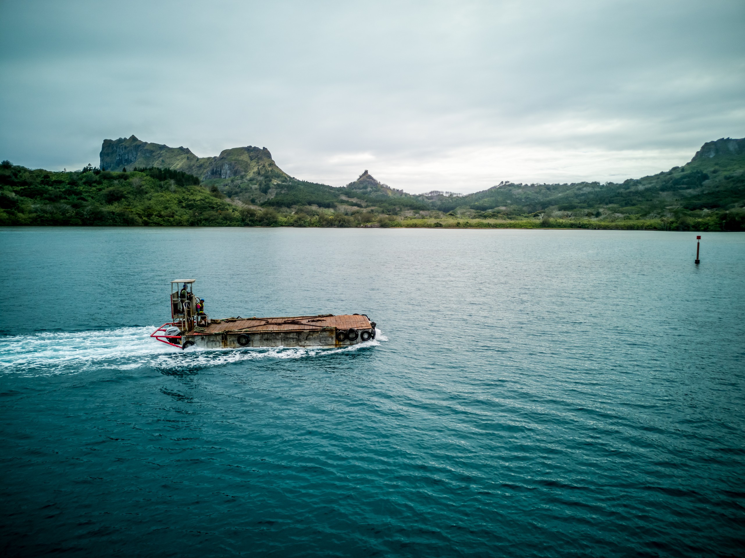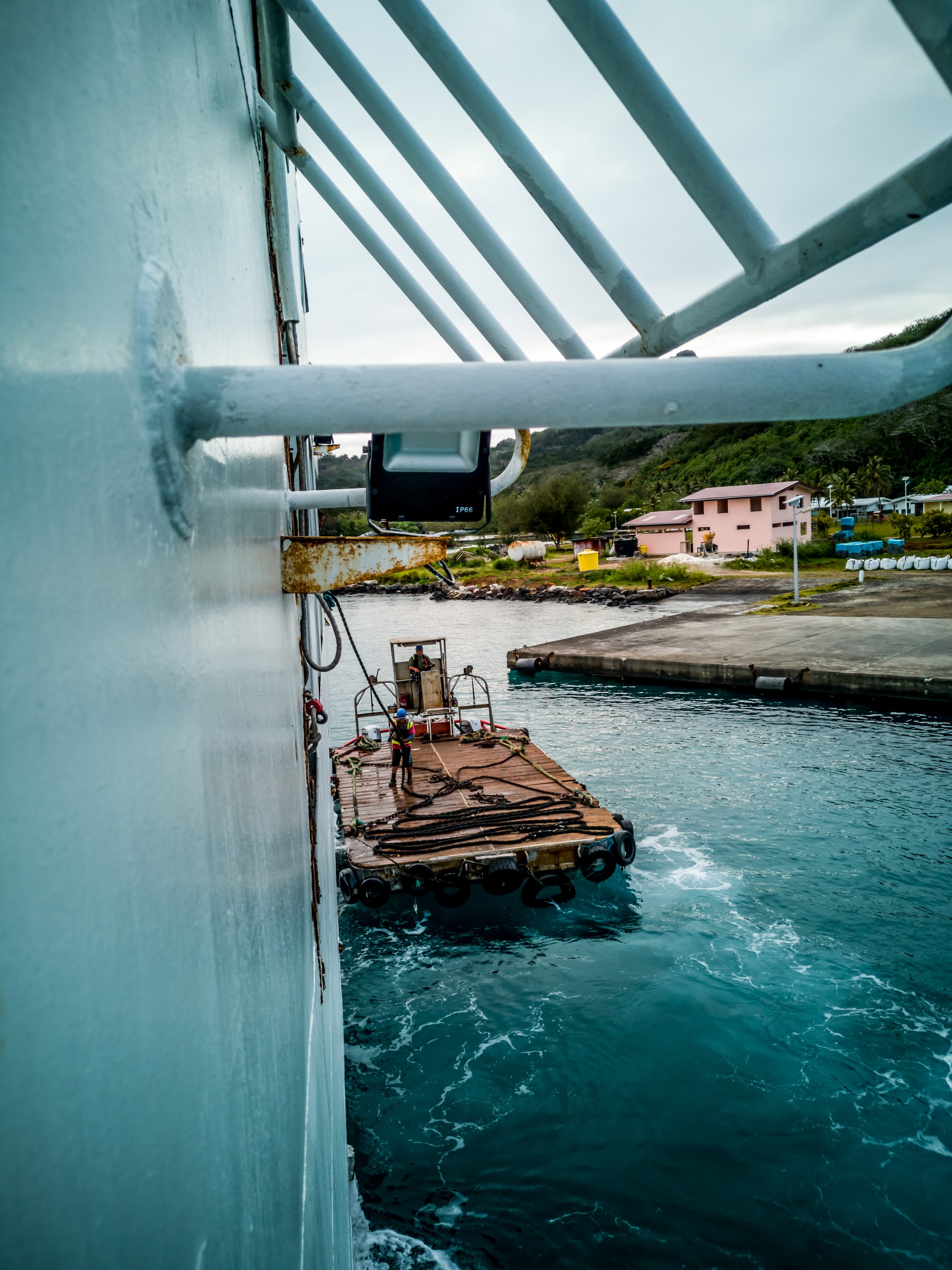 Malgré une nuit de sommeil pas trop mauvaise, j’ai de la peine à sortir de mon sac de couchage. A moitié réveillée à 3h30, j’ai bien senti le gros moteur qui se coupait quelques instants plus tard, signe que nous arrivions. Le temps de s’engager dans une passe à travers le lagon qui entoure Raivavae, et le Tuha’a Pae IV sera à destination. Comme tous les matins depuis que je suis sur le bateau, je file sur un des ponts pour découvrir le paysage qui s’offre à moi : sous un ciel un peu gris, Raivavae se révèle montagneuse et belle comme une promesse. On ne m’aurait pas donc abusée !