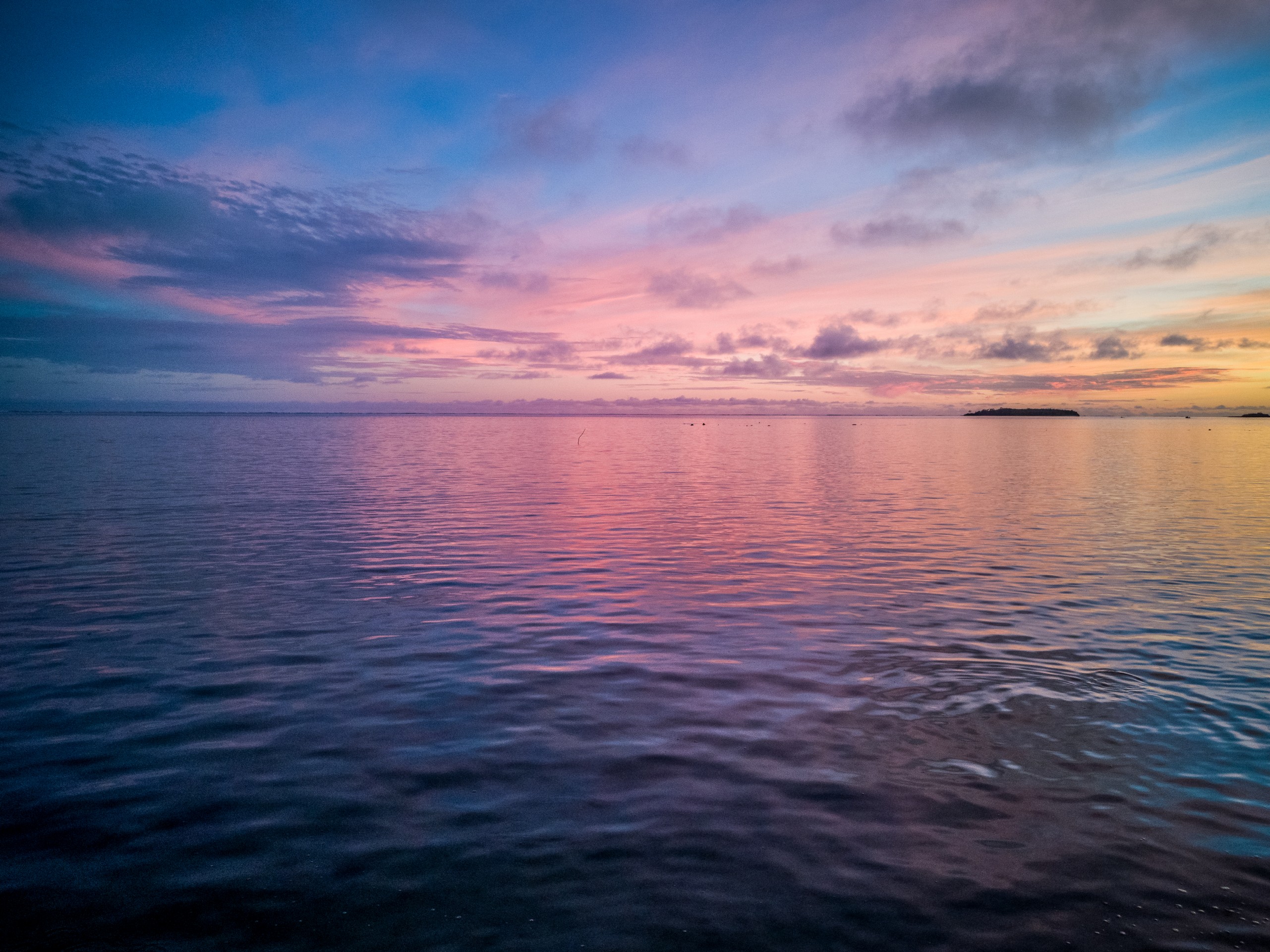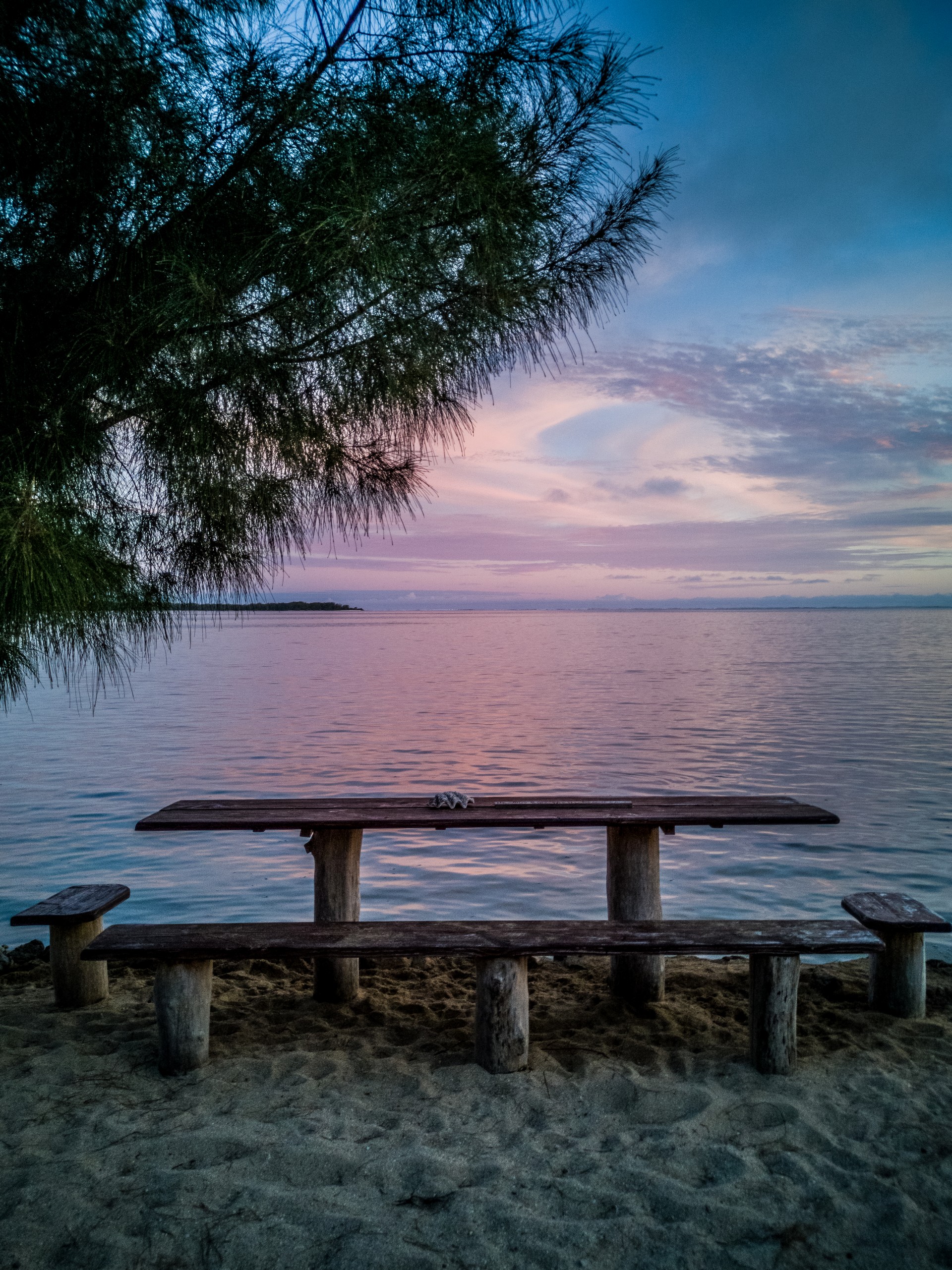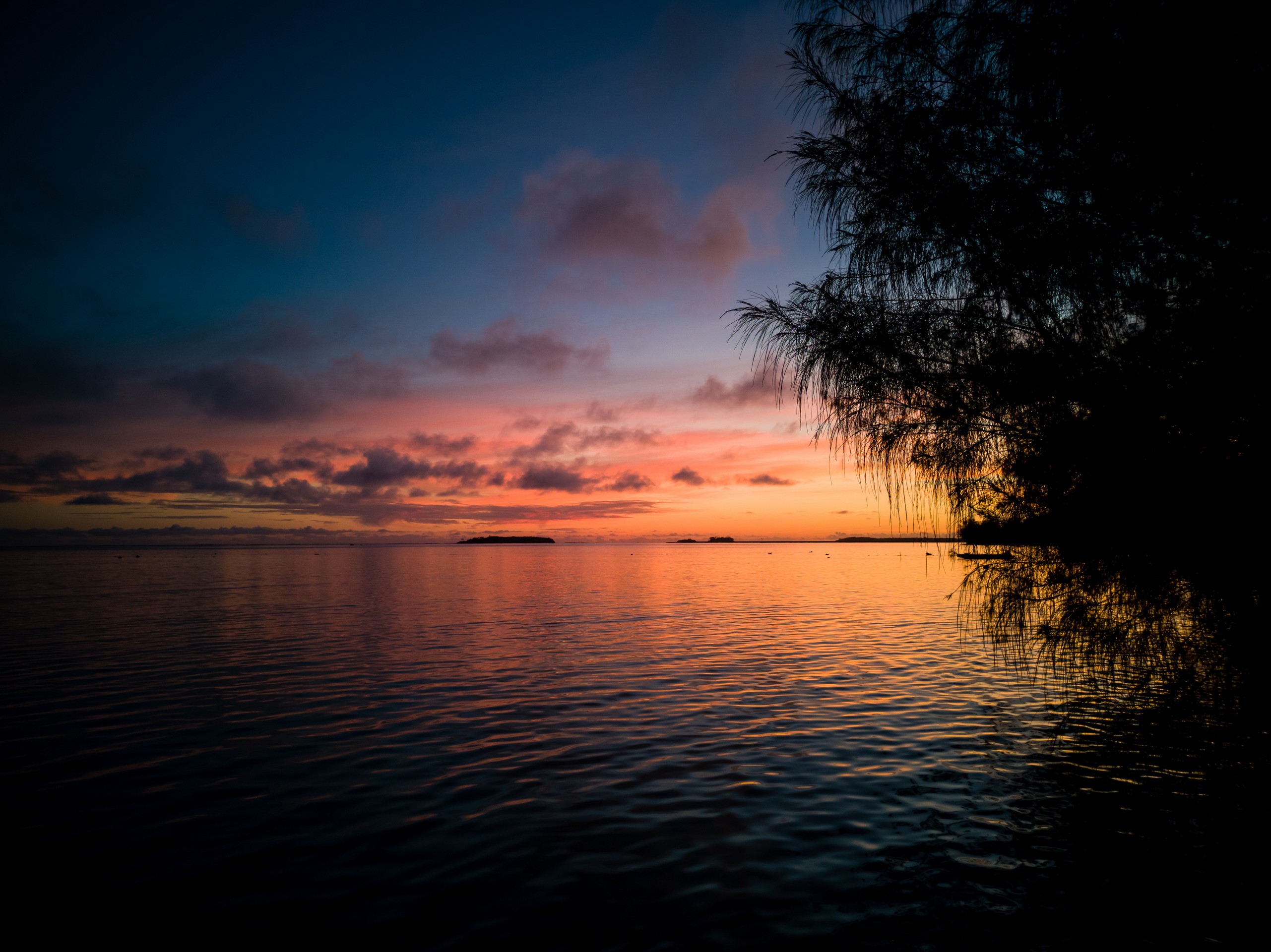 Je rentre à la pension après une bonne heure de promenade pour profiter pleinement du coucher du soleil, demain, j’aurai l’occasion de visiter un peu plus l’île.. Le ciel et le lagon de Raivavae étincelaient au couchant. Juste devant la pension, Odile a fait installer une table et des bancs, face au lagon. L’endroit rêvé pour écrire les lignes de ce carnet de bords des Australes. Si tu étais passé.e par là, Lectrice, Lecteur, tu m’aurais trouvée là le nez au vent, inspirée, distraite par les couleurs du ciel et de la mer et par les sauts des poissons hors de l’eau. Etre face à un lagon est une drôle de chose. On entend le doux clapotis des vagues et c’est toujours calme mais au loin, là où se trouve les motus et la barrière, on entend l’océan qui gronde comme une bête qui n’aurait pas de répit. Il fait presque noir quand Odile allume la lumière du porche, signal que le repas est prêt.