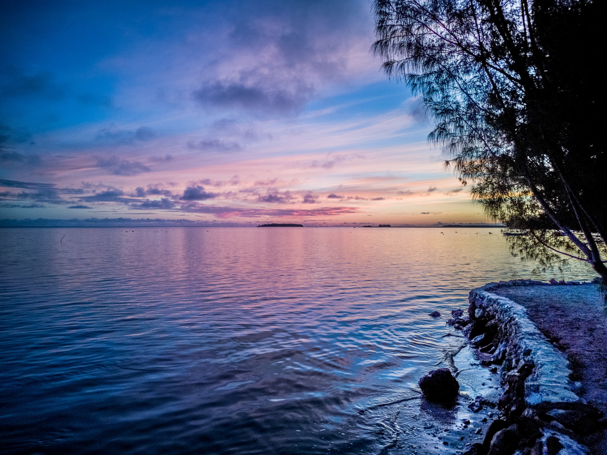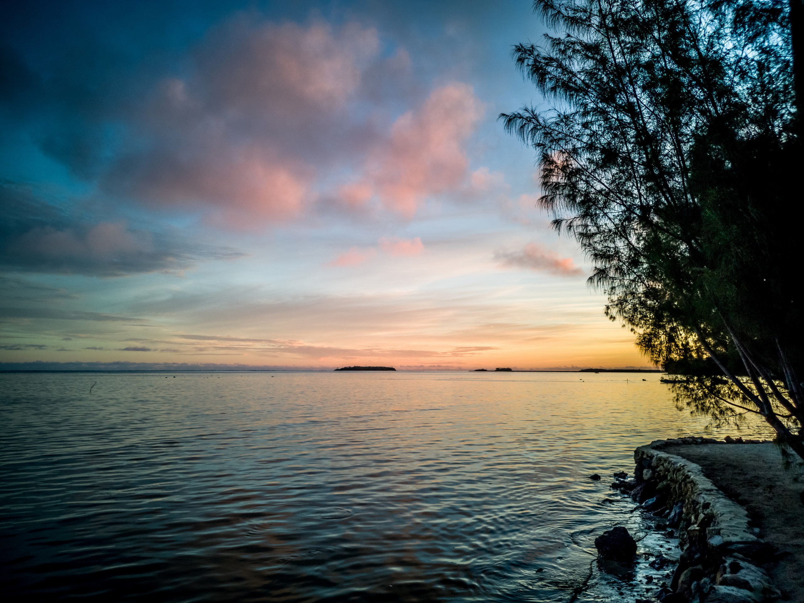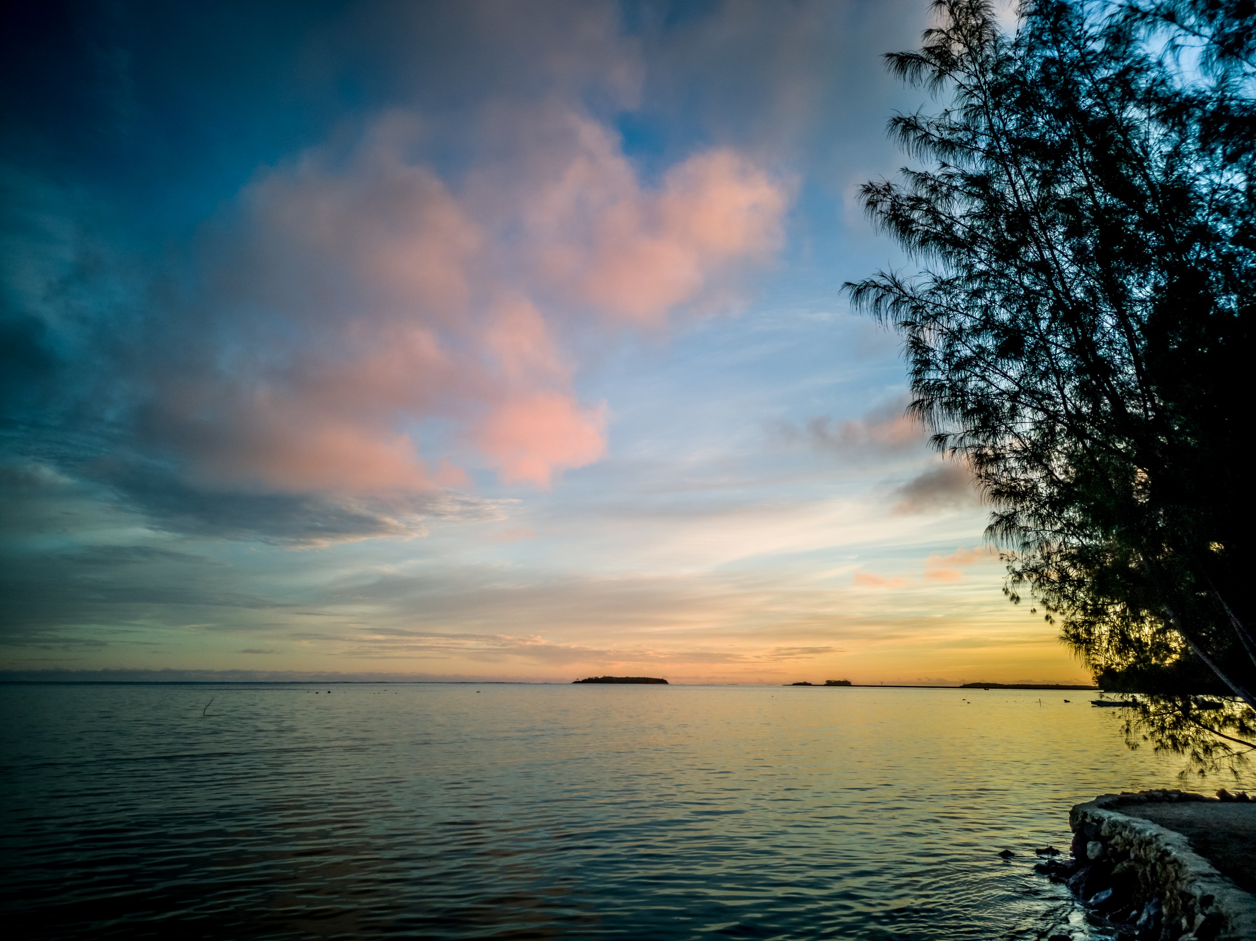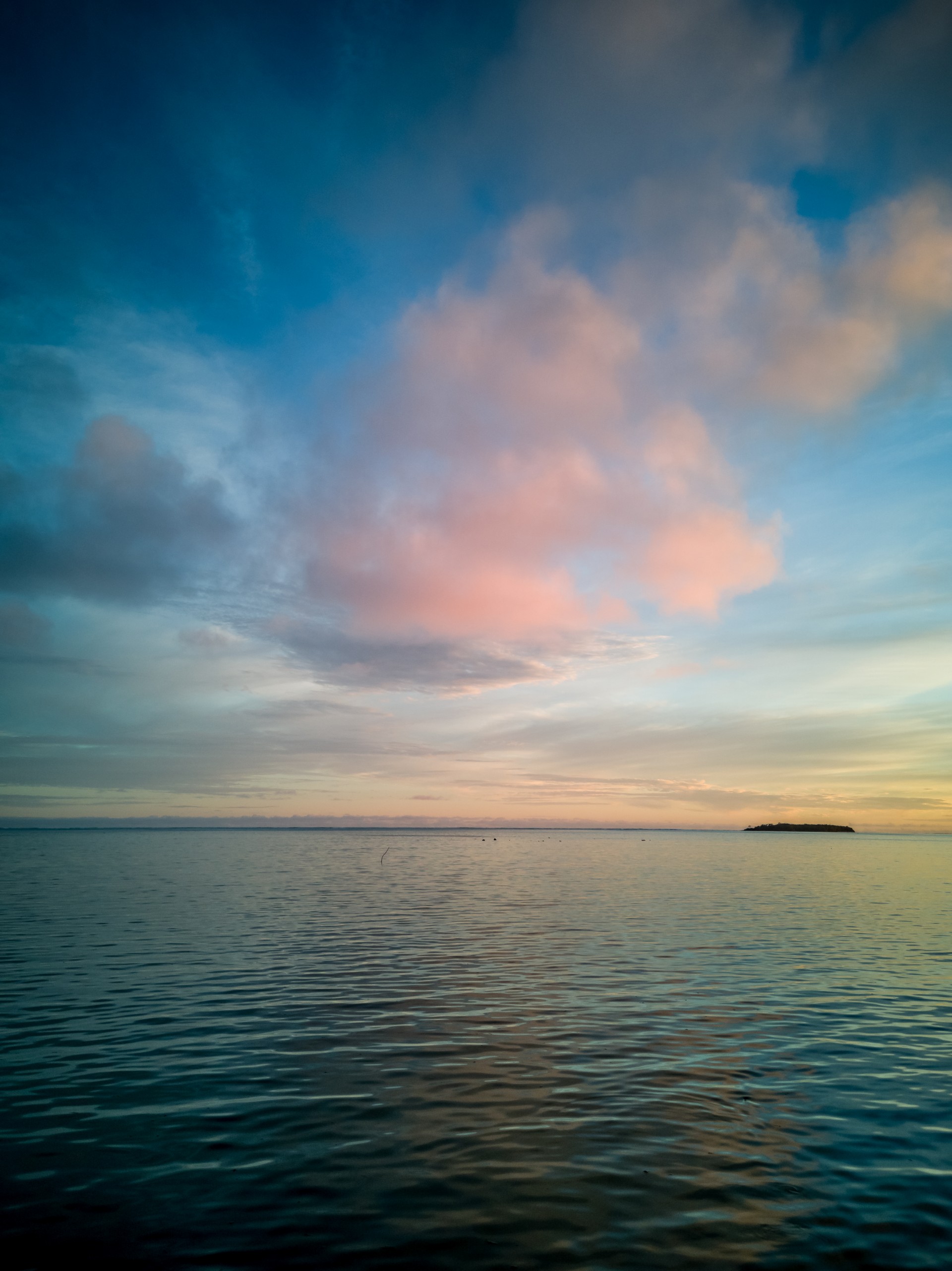 Je rentre à la pension après une bonne heure de promenade pour profiter pleinement du coucher du soleil, demain, j’aurai l’occasion de visiter un peu plus l’île.. Le ciel et le lagon de Raivavae étincelaient au couchant. Juste devant la pension, Odile a fait installer une table et des bancs, face au lagon. L’endroit rêvé pour écrire les lignes de ce carnet de bords des Australes. Si tu étais passé.e par là, Lectrice, Lecteur, tu m’aurais trouvée là le nez au vent, inspirée, distraite par les couleurs du ciel et de la mer et par les sauts des poissons hors de l’eau. Etre face à un lagon est une drôle de chose. On entend le doux clapotis des vagues et c’est toujours calme mais au loin, là où se trouve les motus et la barrière, on entend l’océan qui gronde comme une bête qui n’aurait pas de répit. Il fait presque noir quand Odile allume la lumière du porche, signal que le repas est prêt.