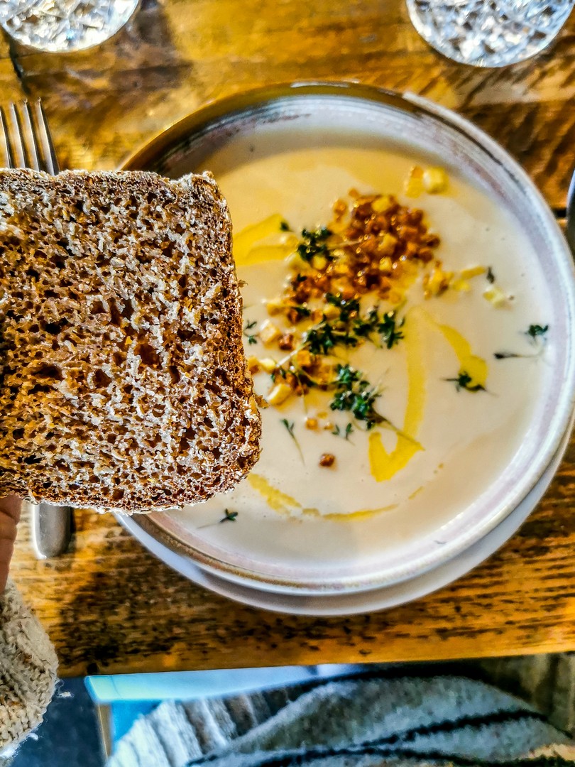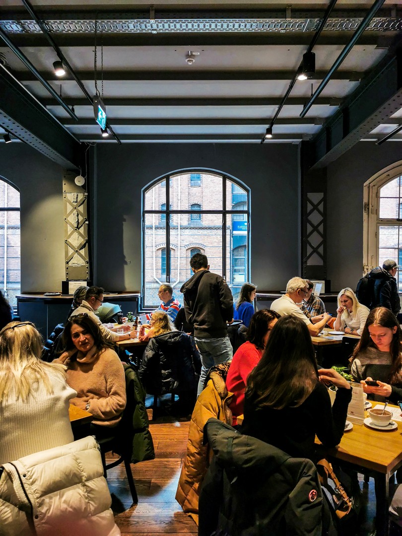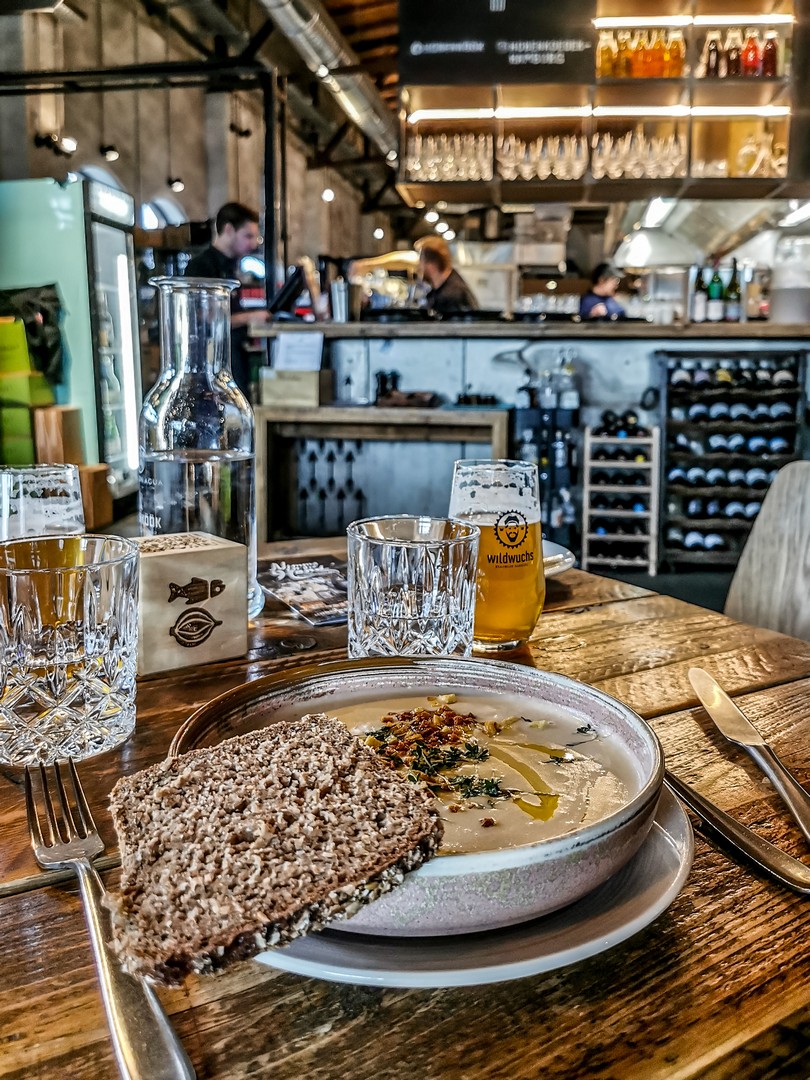 Marché couvert et restaurant à la fois, Hobenköök est la petite perle d’Oberhafen, située dans d’anciens hangars. Ici, les ingrédients sont bios (les vins aussi), locaux et cuisinés avec amour, du petit déjeuner, au dîner, jusqu’au souper avec une carte plus élaborée. On mange dans une partie du marché, façon food-court, dans une ambiance bohème (grosses tables en bois, déco indus…) et détendue. Du coup, le lieu est assez populaire. Je me souviens par contre encore très bien de ma soupe de chou-fleur, c’est bon signe.