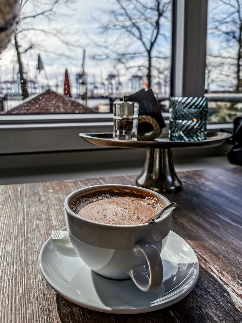 A deux pas de l’Elbstrand (la plage de l’Elbe), cette brasserie tout ce qu’il y a de plus classique (tables en bois, banquettes…) a pour elle de disposer d’une grande terrasse aux beaux jours et de grandes fenêtres en hiver avec vue sur la plage. Evidemment, une ambiance marine y flotte, ce qui lui apporte un côté charmant. Le petit chocolat chaud pris à la sortie du bateau-taxi alors que nous tombait dessus une petite drache d’hiver a fait le plus grand bien.