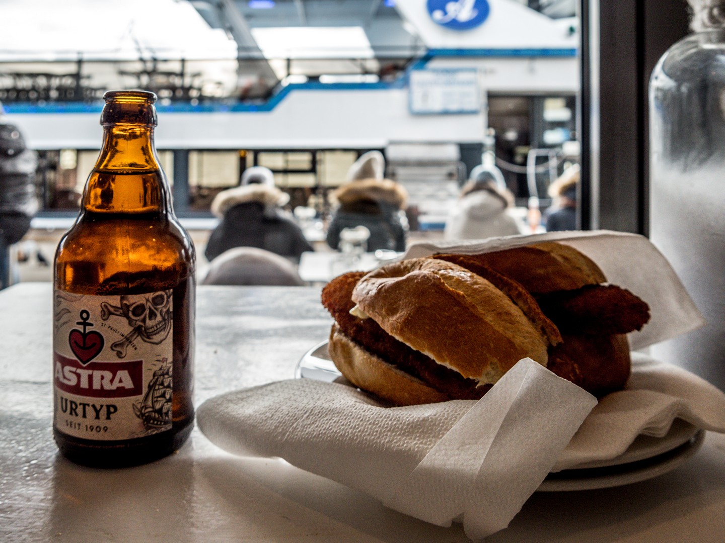Comment venir à Hambourg sans essayer un fischbrödchen, ce petit pain fourré au poisson, ou au crustacé, avec une petite sauce ? Le meilleur endroit pour ça, c’est chez Brücke 10, sur les anciens docks de St. Pauli. Au hareng, au maquereau, mariné en saumure, grillé ou frit, au crabe et crevettes, chacun avec son accompagnement (herbes, oignons, sauce rémoulade ou tartare, c’est selon), ce petit pain est un emblème de Hambourg à lui tout seul. Il est soit à emporter au stand (et on peut le déguster tranquille face à l’Elbe) soit à dévorer à l’intérieur (et là, on vous recommande le comptoir devant les fenêtres) avec bien entendu, une bouteille d’Astra, la bière locale. Tout Hambourg s’y retrouve. On y vient en famille, entre amis, avant ou après s’être baladés le long des quais du fleuve et l’ambiance est hyper conviviale. Si vous ne devez manger qu’une fois à Hambourg, c’est ici qu’il faut le faire.