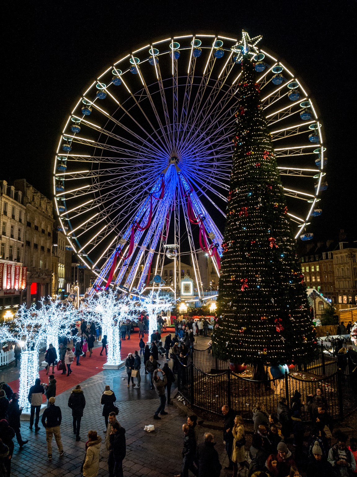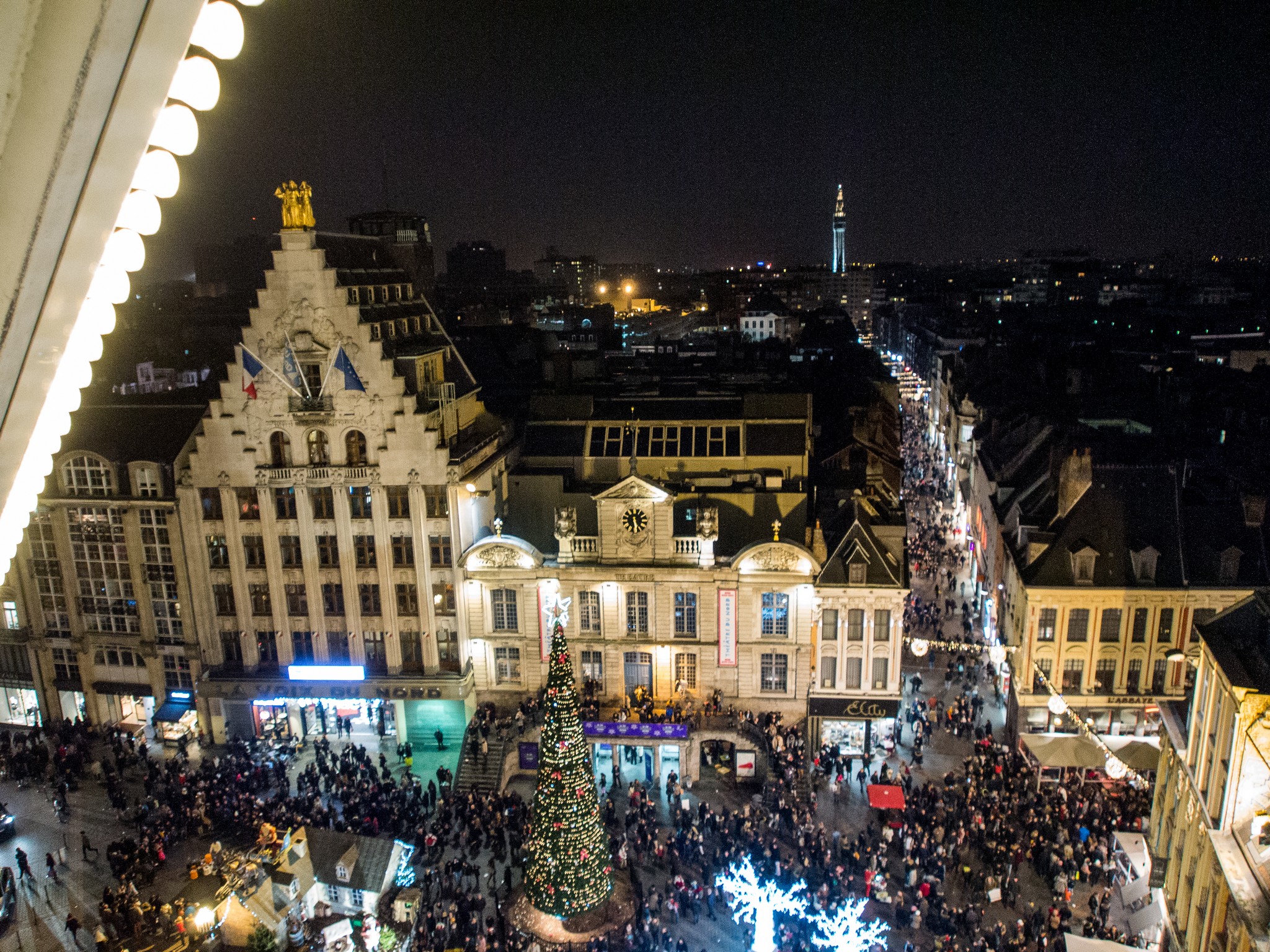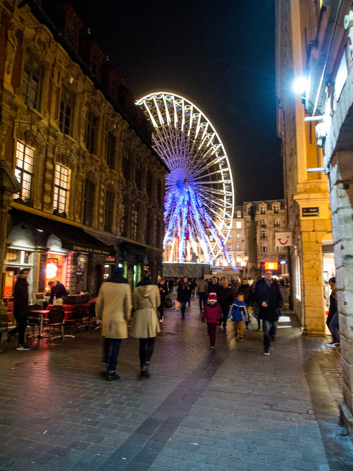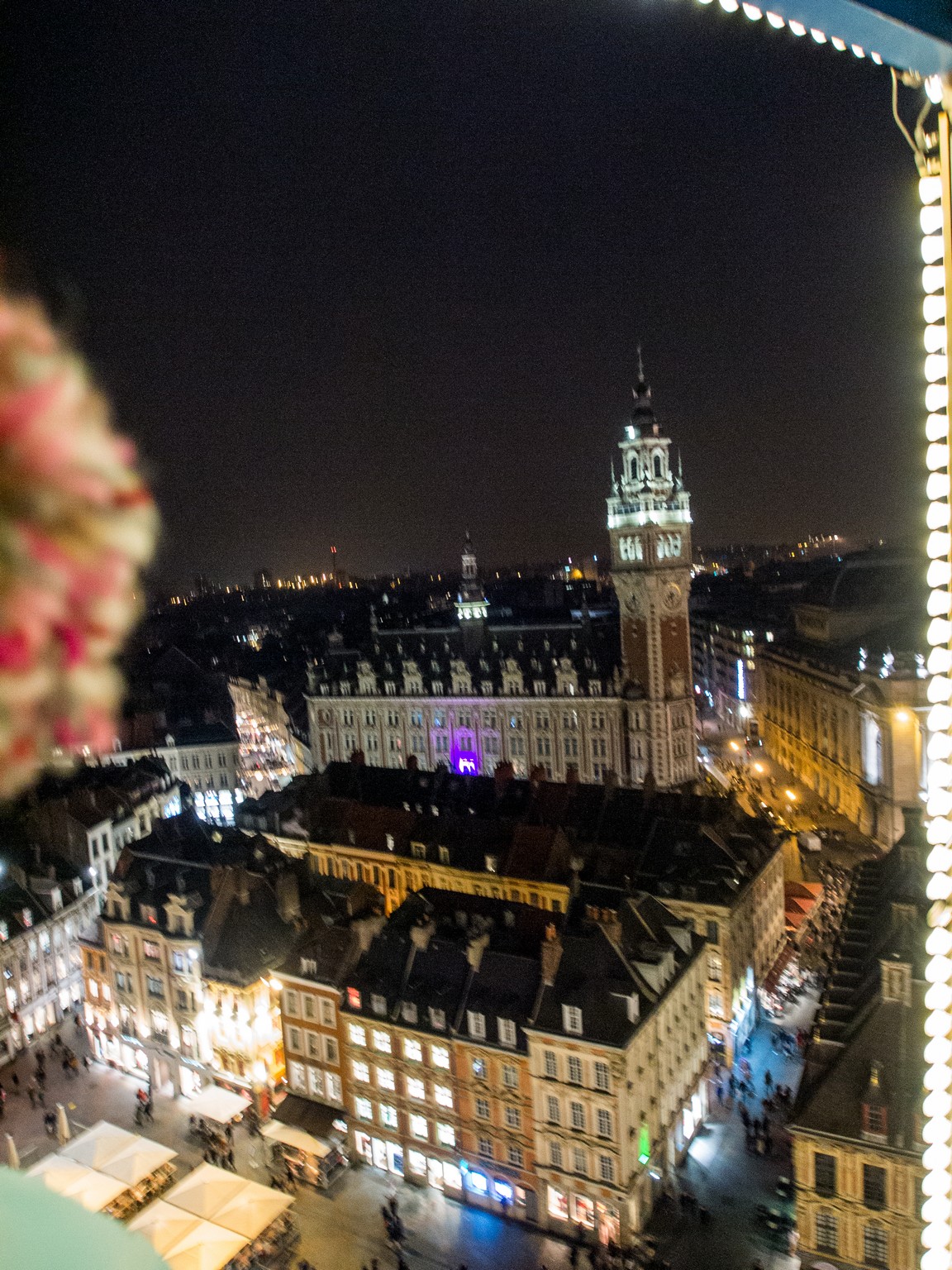 Le point d’orgue de la balade est bien entendu la Grand-Place, illuminée de partout. C’est ici qu’on voit à quel point Lille ressemble beaucoup aux villes de Flandre avec ses maisons à pignons. Et pour les fêtes, on ne peut pas louper l’immense grande roue qui trône devant l’immeuble de la Voix du Nord. Elle domine toute la place et on ne va pas hésiter à aller y faire un petit tour pour avoir un point de vue unique sur Lille. L’occasion de voir à quel point il y a du monde. Vu de haut, les rues semblent une véritable fourmilière. C’est impressionnant. Au loin aussi, on voit le beffroi, le symbole des villes du Nord.