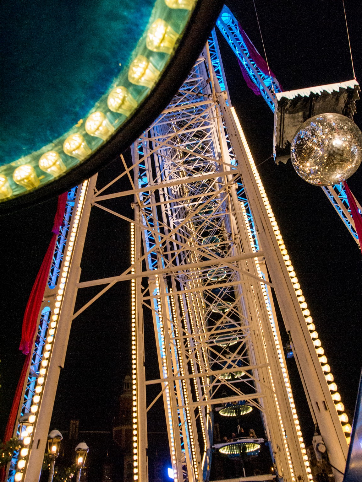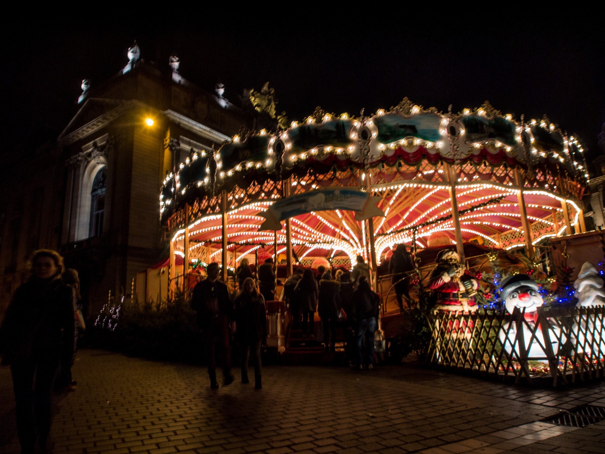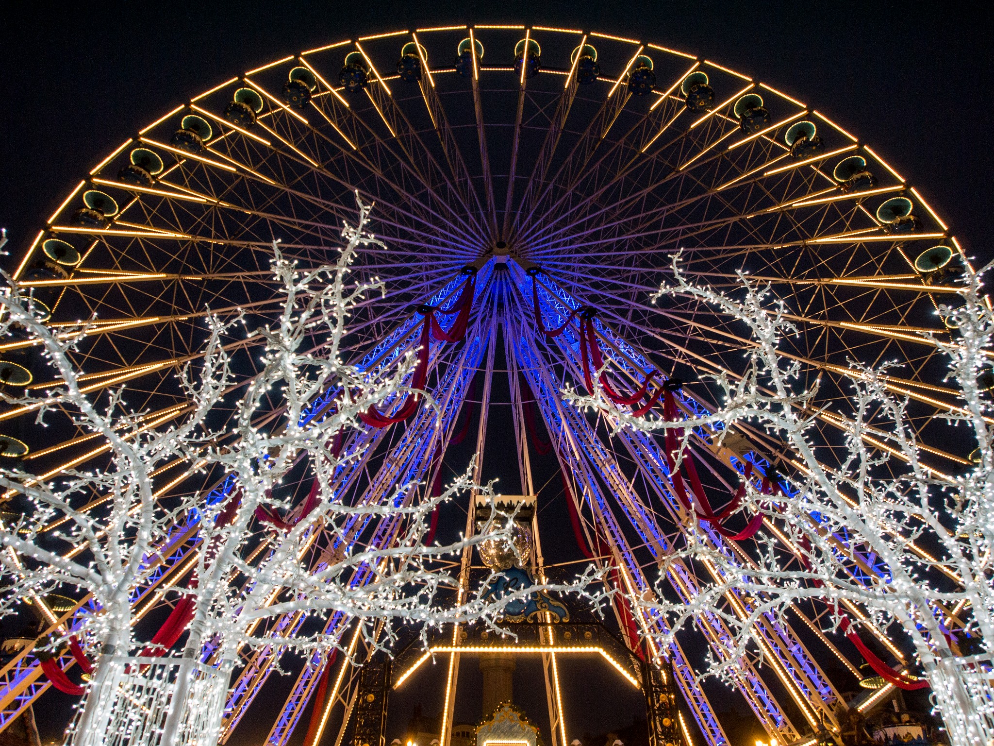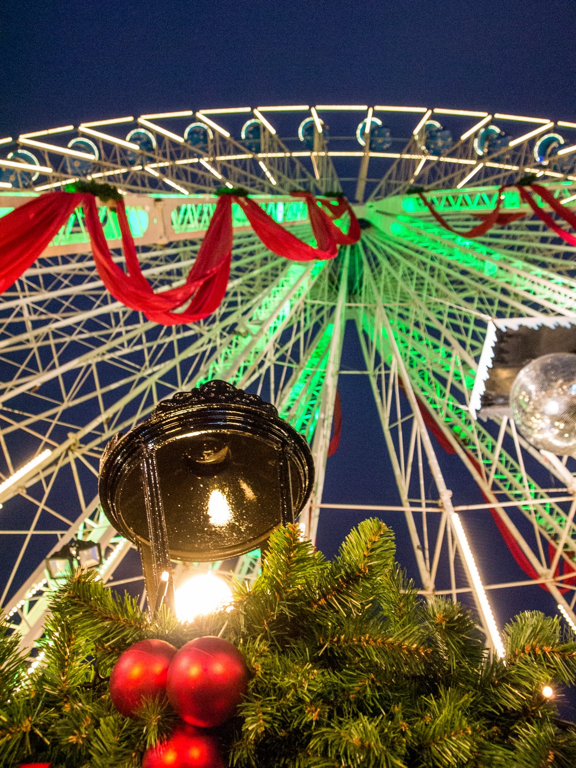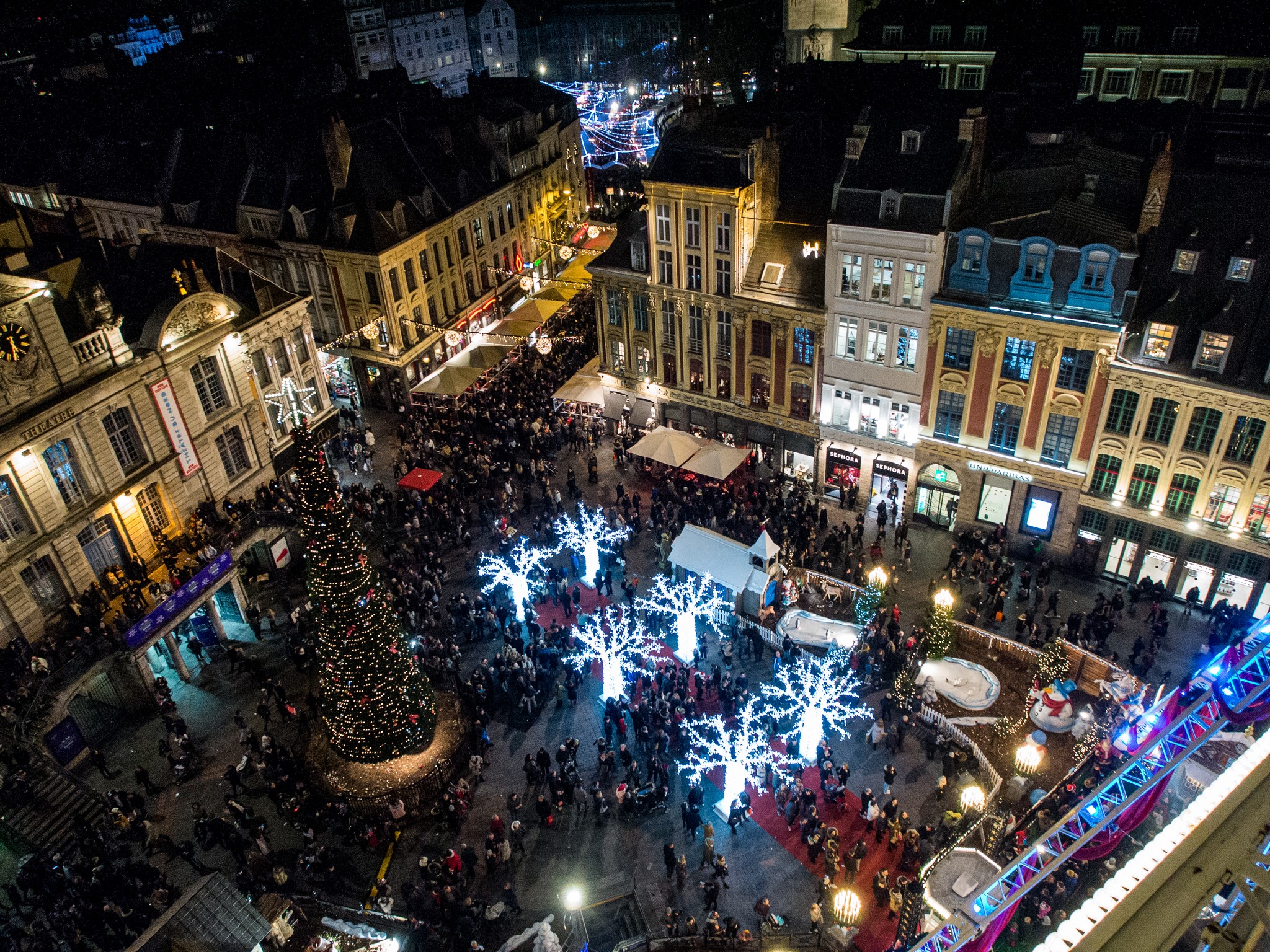 Le point d’orgue de la balade est bien entendu la Grand-Place, illuminée de partout. C’est ici qu’on voit à quel point Lille ressemble beaucoup aux villes de Flandre avec ses maisons à pignons. Et pour les fêtes, on ne peut pas louper l’immense grande roue qui trône devant l’immeuble de la Voix du Nord. Elle domine toute la place et on ne va pas hésiter à aller y faire un petit tour pour avoir un point de vue unique sur Lille. L’occasion de voir à quel point il y a du monde. Vu de haut, les rues semblent une véritable fourmilière. C’est impressionnant. Au loin aussi, on voit le beffroi, le symbole des villes du Nord.
