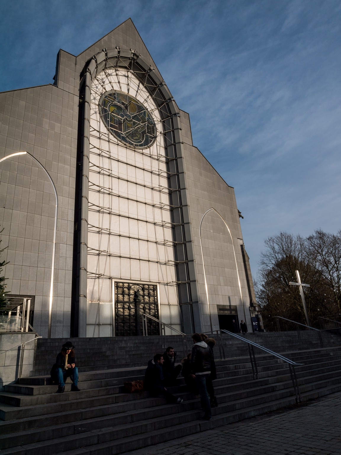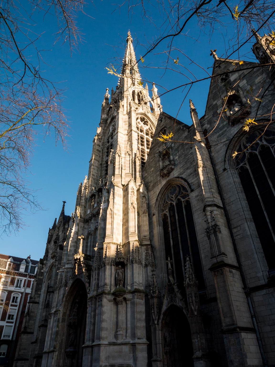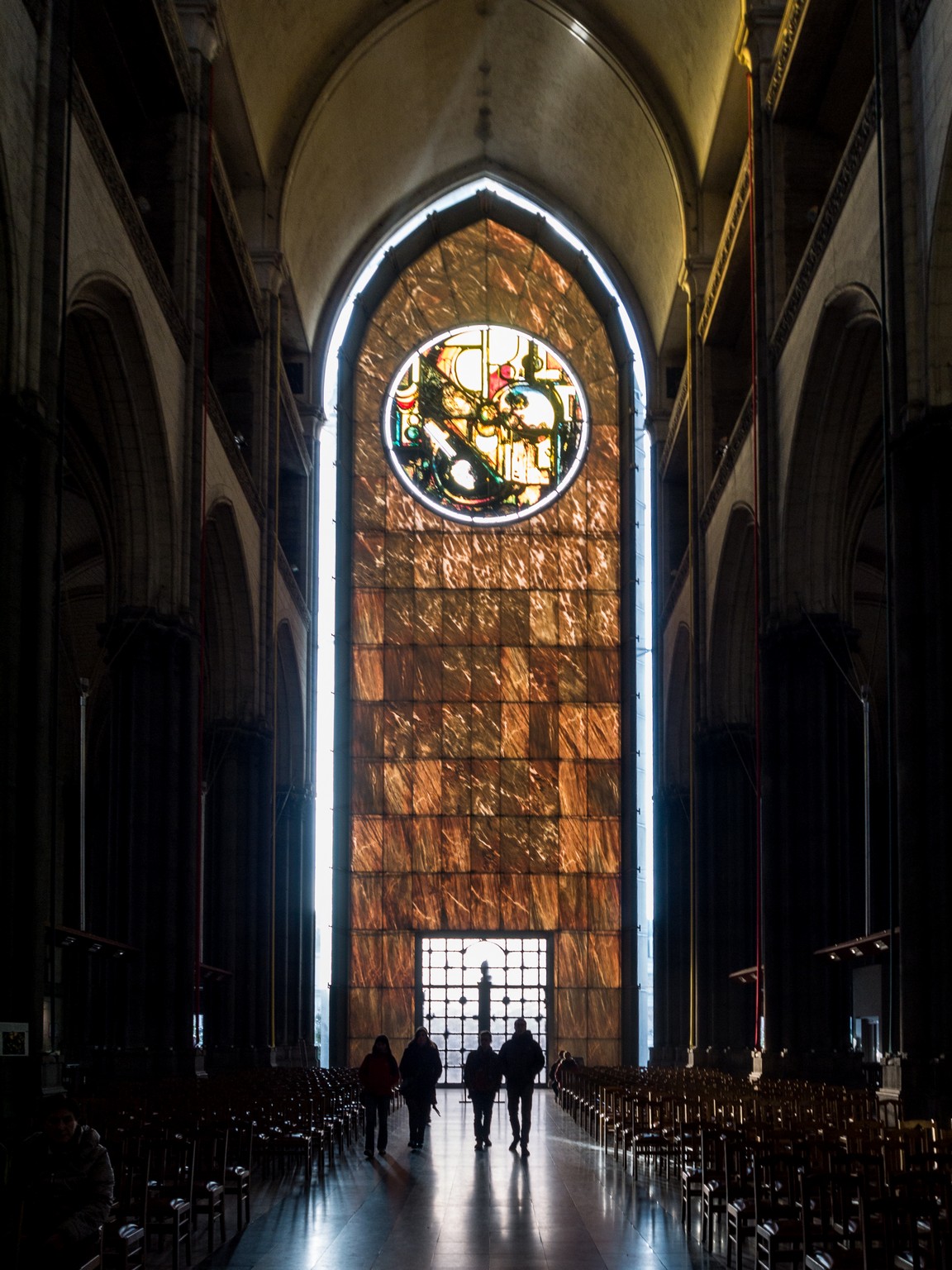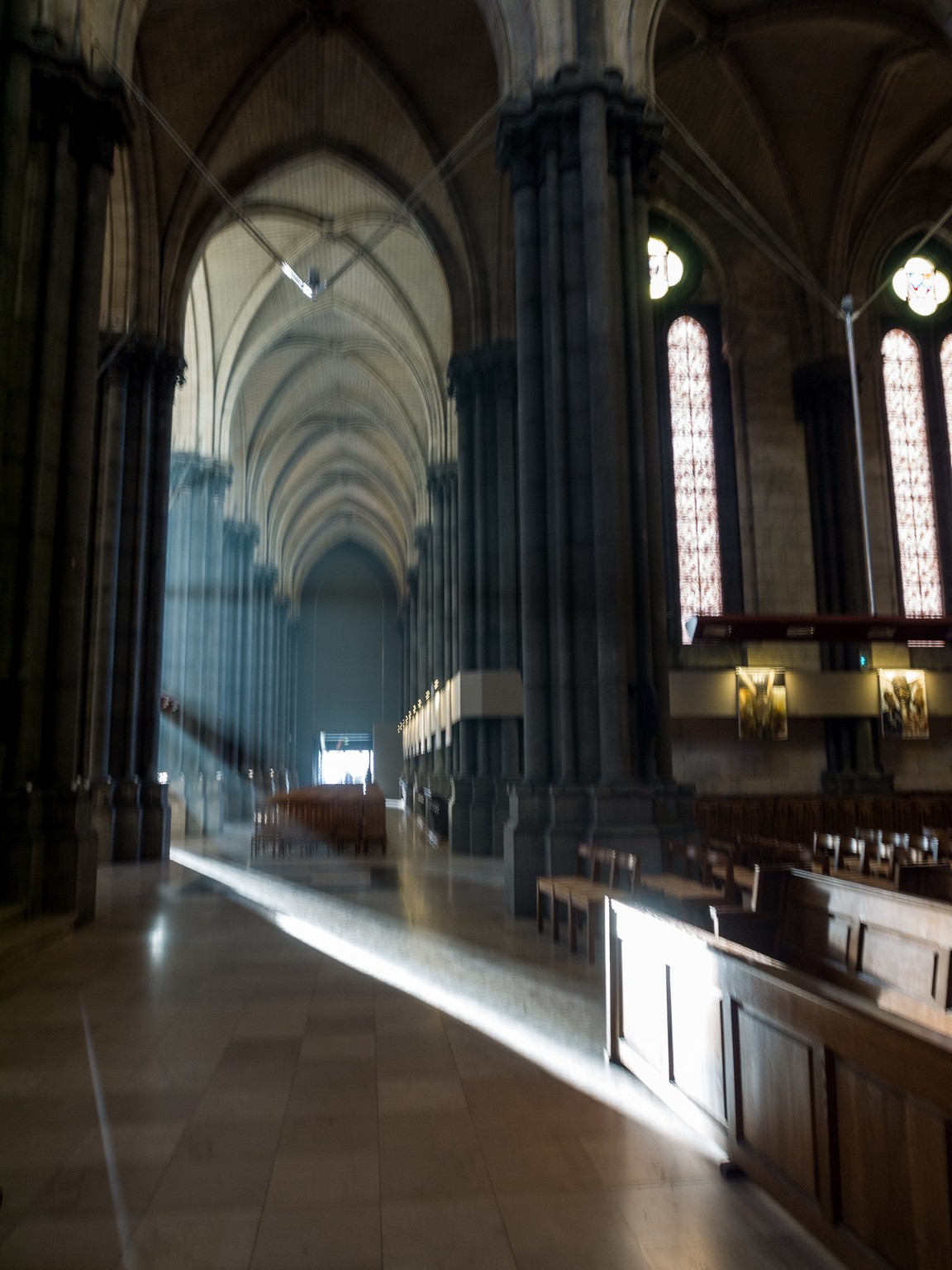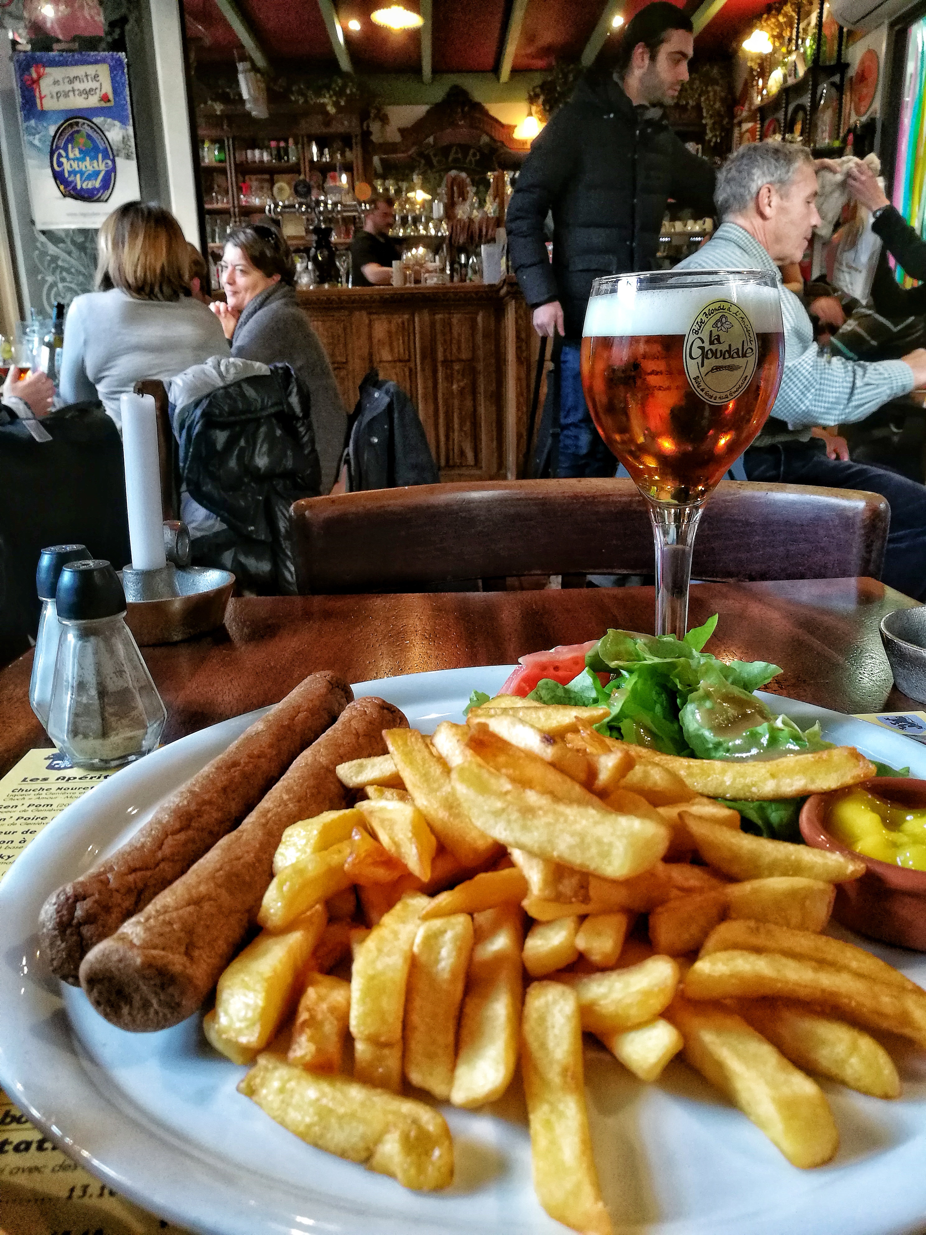 Et le quartier aux alentours de la Cathédrale Notre-Dame de la Treille est particulièrement mignon. Je ne serai pas surprise d’apprendre que c’est en effet la partie la plus ancienne de la ville ! Comme c’est l’heure de manger, je me décide à entrer dans un estaminet, Au Vieux de la Vieille. Séduite par la façade et sa jolie terrasse, et l’intérieur qui a l’air fort douillet, je vais donc devoir patienter pour avoir une table car le lieu est TRES fréquenté, même en fin de service de l’heure du déjeuner. Enfin, après une vingtaine de minutes de patience, je prends place sur une banquette, sous les poutres en bois sombres décorées de houblon. Au menu ? Une dizaine de plats typiques du Nord : Tarte au boudin noir, carbonnades flamandes, poulet au maroilles ou encore potjevleesch. Quand à moi, je me décide sur une fricandelle servie avec des frites et du piccalilli. La fricandelle est encore un truc que nous partageons entre le Nord de la France et la Belgique. Cette drôle de saucisse pannée et frite à la composition dont on ne sait rien est un grand classique de la friterie. C’est aussi un bon truc bien gras et accompagnée d’une bière brassée pour le restaurant. C’est donc parfaitement repue que je vais entamer ma dernière visite du jour : la cathédrale Notre Dame de la Treille. Une cathédrale qui en aura mis du temps à être achevée ! En effet, sa construction a commencé en 1854 mais s’est terminée… en 1999, comme l’atteste la façade tout à fait contemporaine (en fait au début, j’avais cru qu’elle avait peut-être été bombardée pendant une des guerres mais non). Et par chance, je visite à la bonne heure… le soleil est pile dans les bons angles des fenêtres et les rayons qui filtrent illuminent l’intérieur de la cathédrale comme des spots. Un régal pour les yeux !