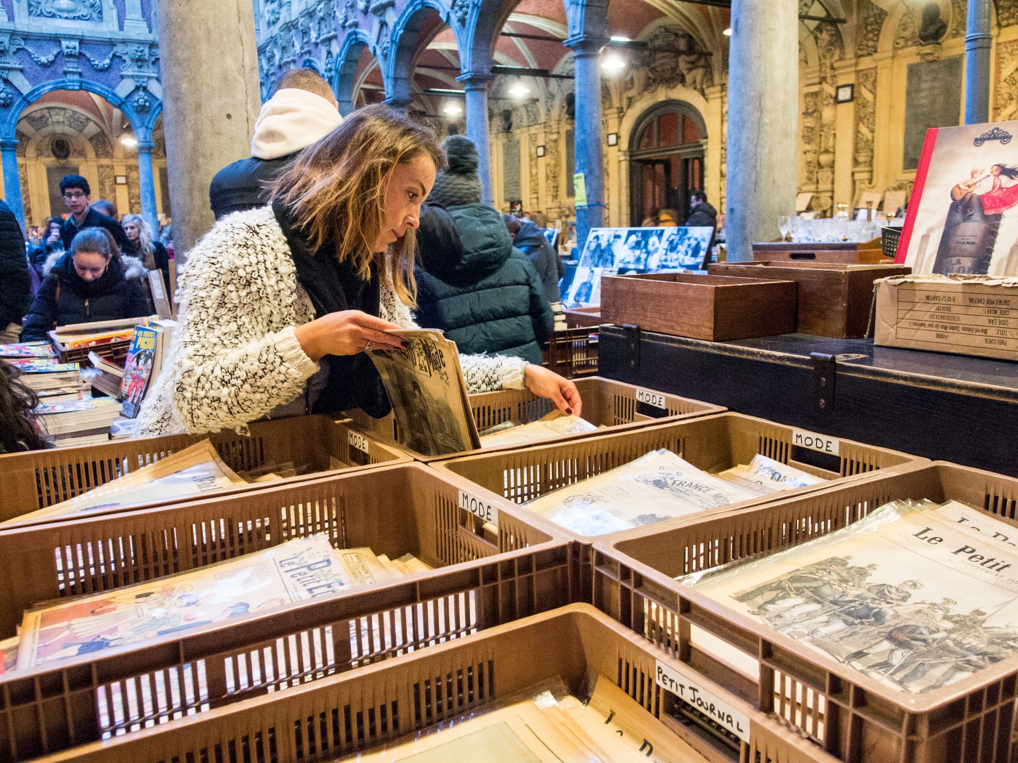 Premier arrêt, le marché des bouquinistes dans la cour de la Vieille Bourse. Un très beau cadre pour de beaux livres, mais aussi des objets comme des verres, des soldats de plomb, etc. On se balade dans la galerie, à l’abri des intempéries, pour chercher LE livre rare ou le bel objet qu’on ne pensait pas trouver.