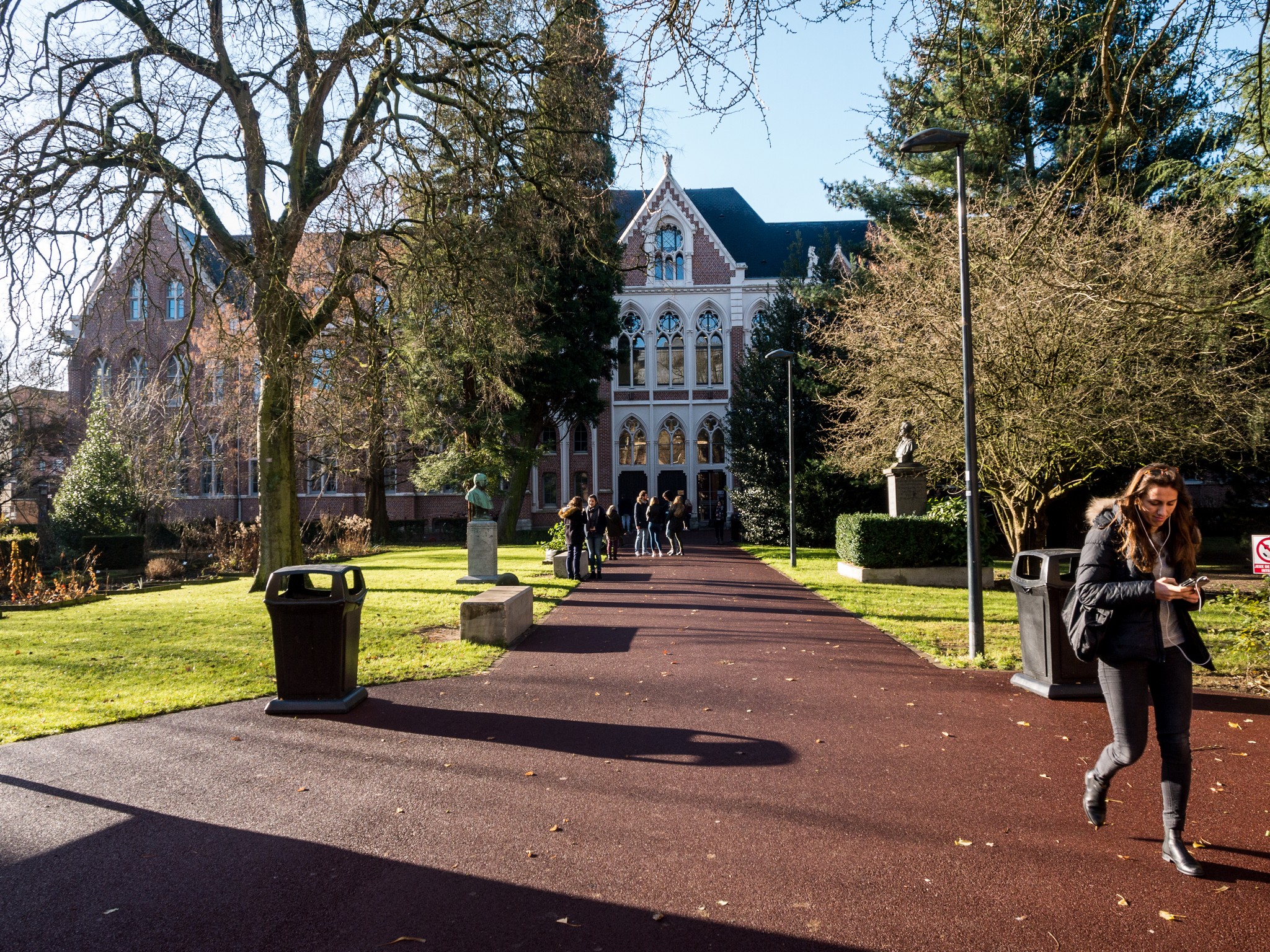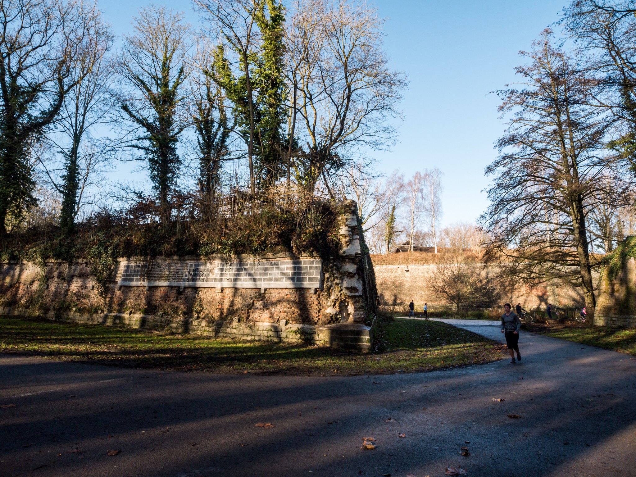 Je me mets donc en route à pied vers le Centre. Depuis Wazemmes, il est assez facile de rejoindre la Citadelle de Lille. Une jolie promenade à travers des rues typiques du Nord avec ses hautes fenêtres couronnées de briques plus claires et d’un motif en trapèze, comme un diamant sur une tiare. On retrouve les mêmes dans le coin de Belgique d’où je suis originaire ! On y trouve aussi pas mal de belles demeures de la fin XIXème ou bie encore, le campus néo-gothique de l’Université catholique de Lille. Construite en bords de Deûle par Vauban, cette « ville dans la ville » est tout simplement énorme et l’ensemble forme un véritable poumon vert pour la ville, le zoo est d’ailleurs installé tout à côté et c’est d’ailleurs avec le cri d’un gibbon que je traverse le pont qui enjambe la Deûle. Un petit coup d’œil à la taille des murs suffit pour se rendre compte de la taille et de la solidité de la citadelle, c’est impressionnant. Les environs sont pleins de sentiers ou on croise des joggeurs, des familles en promenade et de nombreux oiseaux. Je ferai simplement le tour, jusqu’à l’entrée de la Citadelle, avant de bifurquer de revenir vers le Vieux Lille.