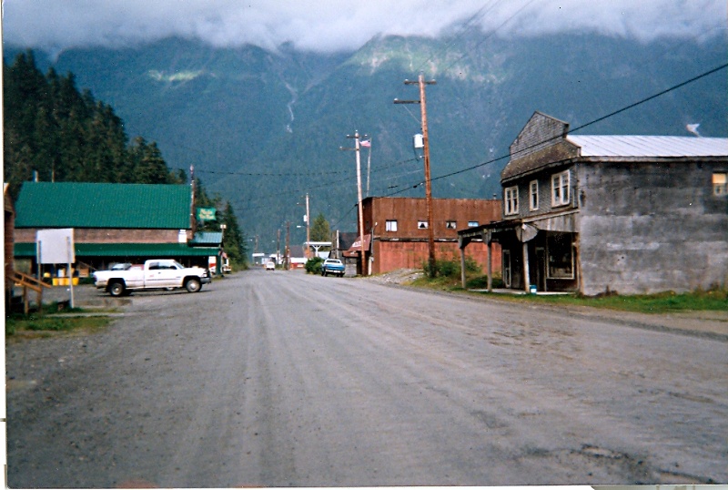 La rue principale semble provenir d’une vieille photo de l’époque de la Conquête de l’Ouest. Dès que l’on est entré dans Hyder, plus de macadam mais une espèce de mauvaise route dont on ne sait dire si c’est de la terre ou du béton! Les yeux ouverts comme des soucoupes, je me dis que je suis en train de vivre un fantasme! Ce n’est pas le Far-West, c’est le Far North ! Un motel aux airs peu engageant, le Sealaska Inn semble être le bâtiment principal après le bâtiment civique qui regroupe les services communaux et la bibliothèque. Pas d’école ici, les quelques enfants ou ados qui vivent à Hyder vont à l’école à Stewart, au Canada. Pourtant, la modernité est à deux pas. La curiosité me pousse à entrer dans la bibliothèque et là, je trouve la salle de lecture équipée d’ordinateurs derniers cris connectés à Internet, nécessaires pour tirer les habitants de l’isolement. Attention, ce road-trip date de 1998 ! Même mon école de journalisme n’était pas aussi bien équipée.