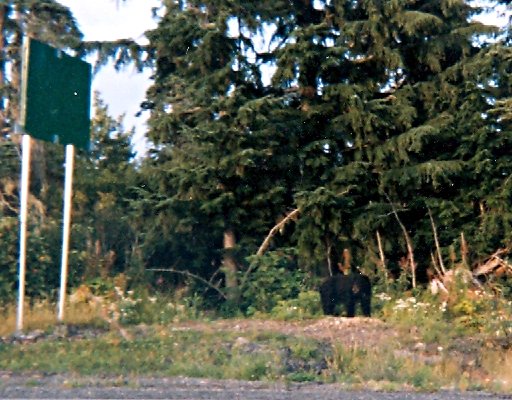 L’après-midi est déjà avancé et nous voilà obligés de rentrer. C’est seulement à ce moment là que le soleil a décidé de nous faire coucou. J’en suis encore à ruminer le fait de ne pas avoir vu d’ours de près (oui, jamais contente, hein!) et soudain, une forme sombre traverse la route. Impossible de se gourer: cette grosse bête à quatre pattes, c’est un ours noir. Dans tous les « Welcome Centers » de la Province, vous trouverez des prospectus vous renseignant sur l’attitude à adopter en cas de rencontre avec un ours. Au courant de ce qu’il faut faire, nous nous arrêtons tout doucement et ne baissons même pas la vitre. L’ours est de l’autre côté de la route, royalement occupé à dépecer un buisson de ses baies. J’en oublie presque de respirer… et même de sortir mon appareil photo jetable avant d’être rappelée à l’ordre par mon compagnon de voyage. C’est à peine si le plantigrade se rend compte que nous l’observons! Et lorsqu’il a fini, il se glisse la forêt, tout tranquillement en nous tournant le dos. Quand il a complètement disparu, nous redémarrons la voiture et reprenons le chemin de Terrace. Ce soir là je fis des rêves de grizzlis faisant adroitement sauter des poissons hors d’une rivière cristalline dans un cadre de montagnes vert-foncées saupoudrées de neige. La réalité y ressemblait presque!