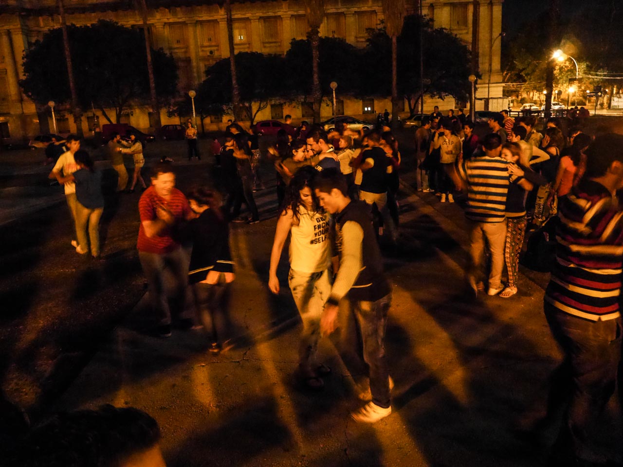 Je ne tarderai pas à le découvrir! Quand je quitte le restaurant pour rejoindre mon auberge, la nuit est tombée. Devant le Palais de justice, de la musique vrombit : de la salsa ! C’est un bal improvisé en plein dans le parc! Rien d’officiel, juste des couples, tous jeunes et une sono que je n’apercevrai pas. A part l’éclairage public, il n’y a rien d’autre. Combien sont-ils ? Peut-être bien une centaine à enchaîner les pas de danse au fil des morceaux. Je regarde, fascinée… Ca me donne envie de m’y mettre moi aussi. De prendre des cours au retour (mais pourquoi j’y pense?), à force de danser seule, je ne sais plus ce que ça fait d’avoir un partenaire. Et si c’était l’histoire de ma vie ? Je bloque mon cerveau… pas envie de réfléchir à çà là, maintenant, au milieu de toute cette joie. Je prend mon appareil photo et j’essaie d’immortaliser ce moment. Une tâche quasi impossible! Le seul éclairage est celui des réverbères du parc, autant dire quasi nul et je ne suis pas encore une experte des photos en basse lumière. Après un bon trois-quart d’heure, je me décide à partir, je n’arriverai à rien de mieux que ce que j’ai déjà photographié et je commence ) être vraiment fatiguée. Sourire au lèvre, la tête encore pleine de musique, je quitte le parc et dans la grande allée qui mène à la sortie, on me bouscule. Pire en fait, on me jette à terre. Je n’ai rien vu venir. Instinctivement, j’ai mis la main sur la sangle de mon appareil-photo. Pour la première fois, je suis victime d’un vol à la tire. Mais mon voleur n’avait pas compté sur mon aspect combatif! Flanquée à terre, je tire sur la sangle de toute mes force en criant. Pendant que je lutte je me traite de tous les noms. Il aura fallu d’un moment de distraction. D’habitude, je range mon appareil-photo dans mon sac et là, baignant dans une espèce de douce euphorie, j’ai négligé de le remettre. Idiote que je suis. Sans doute m’avait-il repérée depuis longtemps, attendant le bon moment d’agir. Mais je lutte, il ne s’en tirera pas comme çà! Et je crie. Je parie qu’il ne s’attendait pas à pareille résistance… combien de temps ça dure ? Je ne saurai le dire. Celà me semblât long. Pourquoi il n’abandonne pas, l’imbécile ? Il y a plein de gens dans le parc, mes cris vont le faire repérer ! Finalement, mes mains meurtries lâchent mon appareil-photo mais je ne m’avoue pas vaincue! Mon voleur détale comme un lapin avec moi à ses trousses… « Ladrón! » Il a vite fait de me distancer et ma forme physique n’est plus ce qu’elle était. Du coin de l’œil, je vois un jeune homme qui s’élance à sa poursuite sans hésiter. On m’entoure, on s’inquiète de moi… Est-ce que je ne suis pas blessée ? Non, non… je regarde mon jeans tout déchiré. Tant pis! Les visages sont flous, l’adrénaline et la course me donne le tournis! Une minute plus tard, mon bon samaritain revient vers moi avec l’appareil-photo en main. Endommagé, mais au moins, je récupère ma carte SD. Et tous les badauds applaudissent sur son passage. Je l’embrasse chaleureusement et le remet entre les mains de la jeune fille qui l’accompagnait. Il a du faire forte impression ce soir!