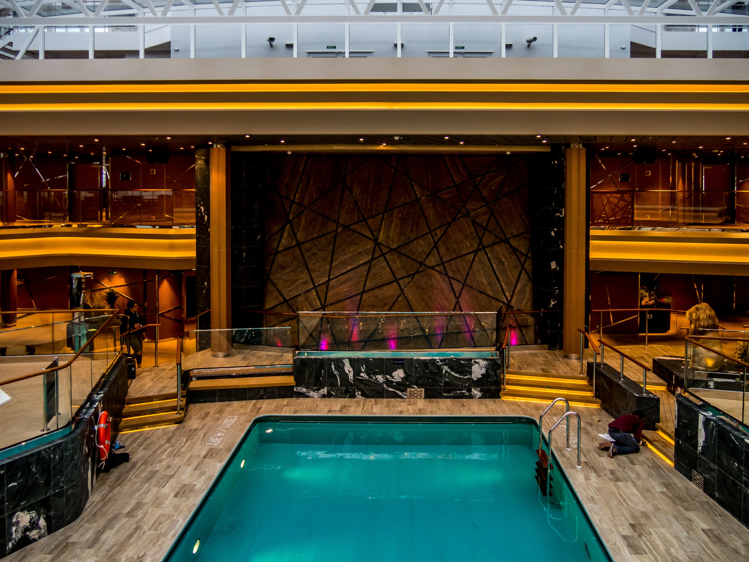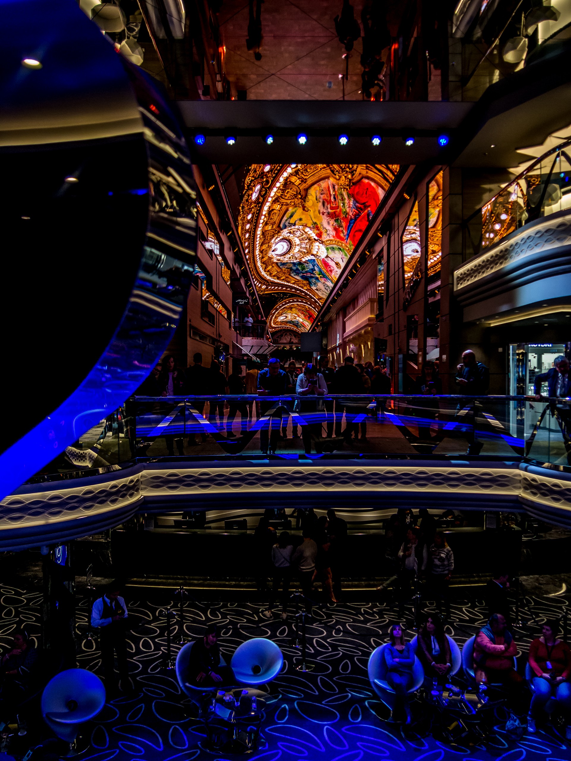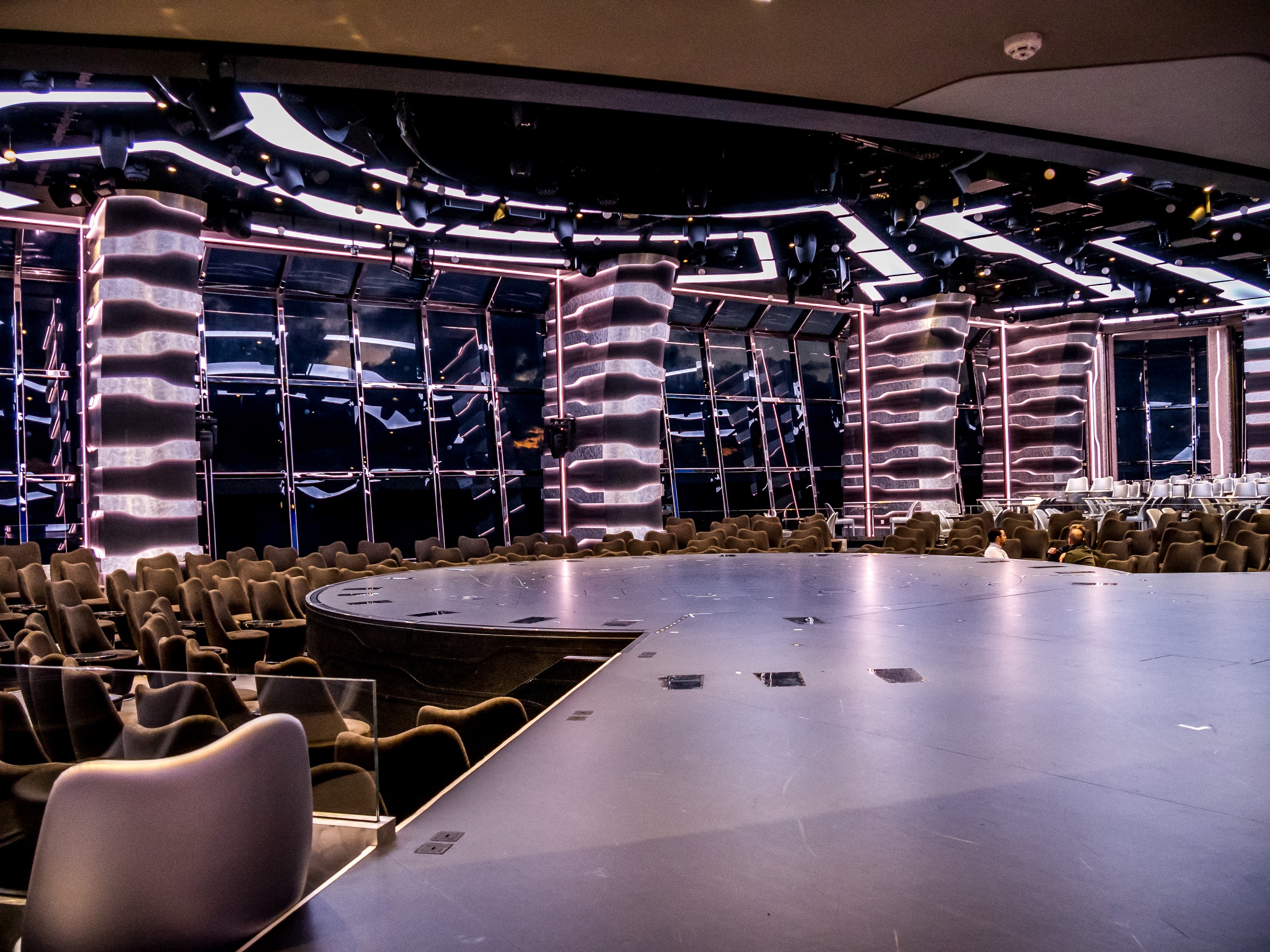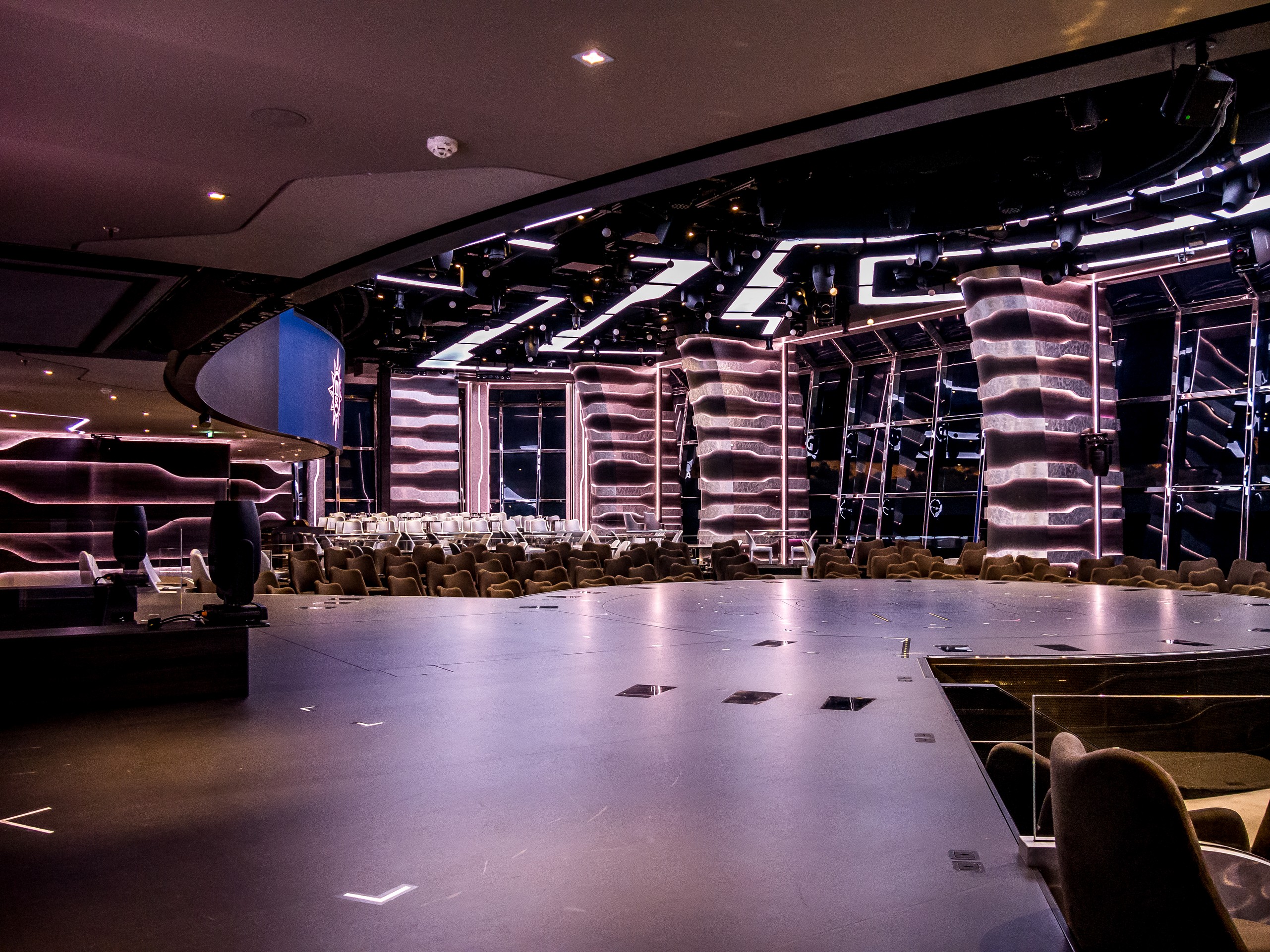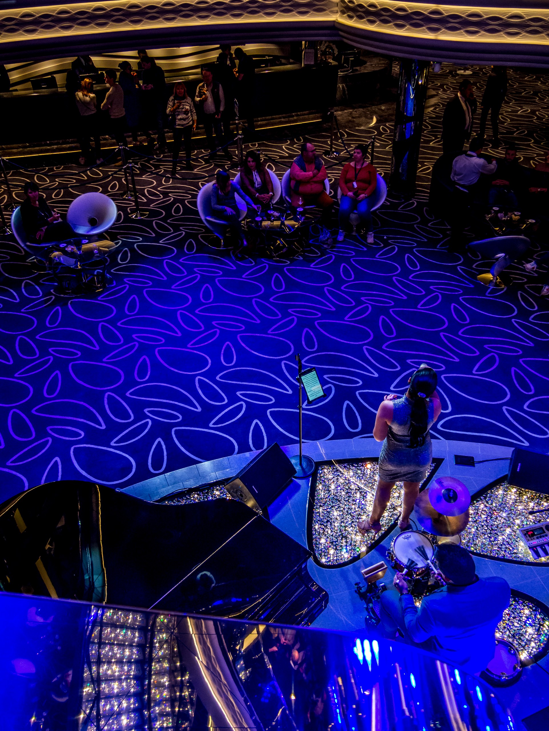 Du côté des grands classiques des bateaux de croisière, on trouve les piscines (3, dont un avec un magrodôme), le théâtre (étrangement petit, je trouve pour un navire de cette taille) où se déroulent des spectacles musicaux (on a l'occasion d'en voir deux), un grand (et rutilant) casino et un Studio TV and Bar qui sert à la fois d'espace pour des spectacles et de divertissement comme des quizes ou des concours...
